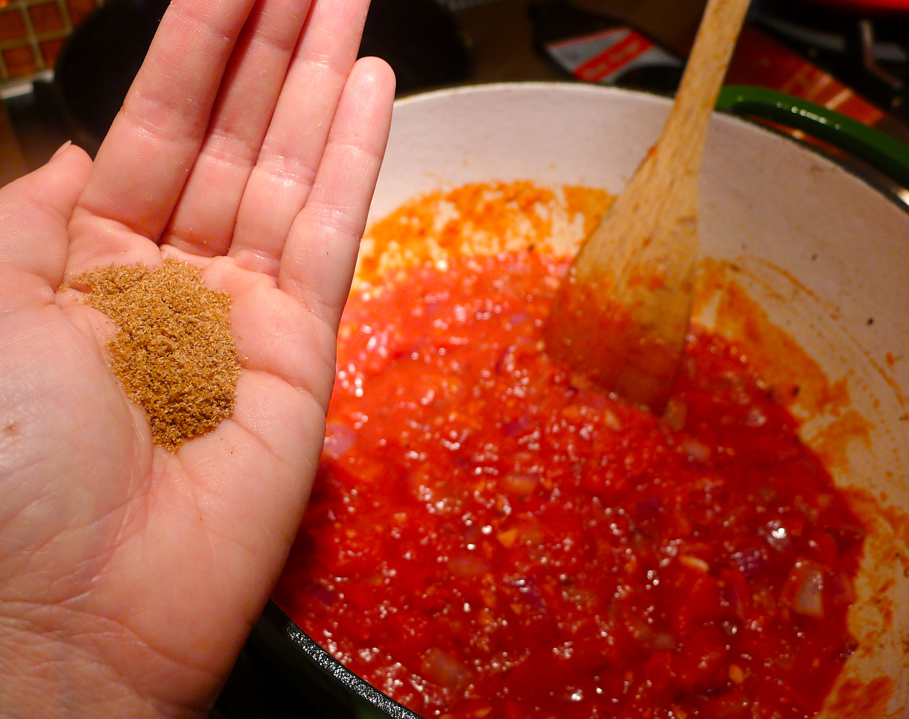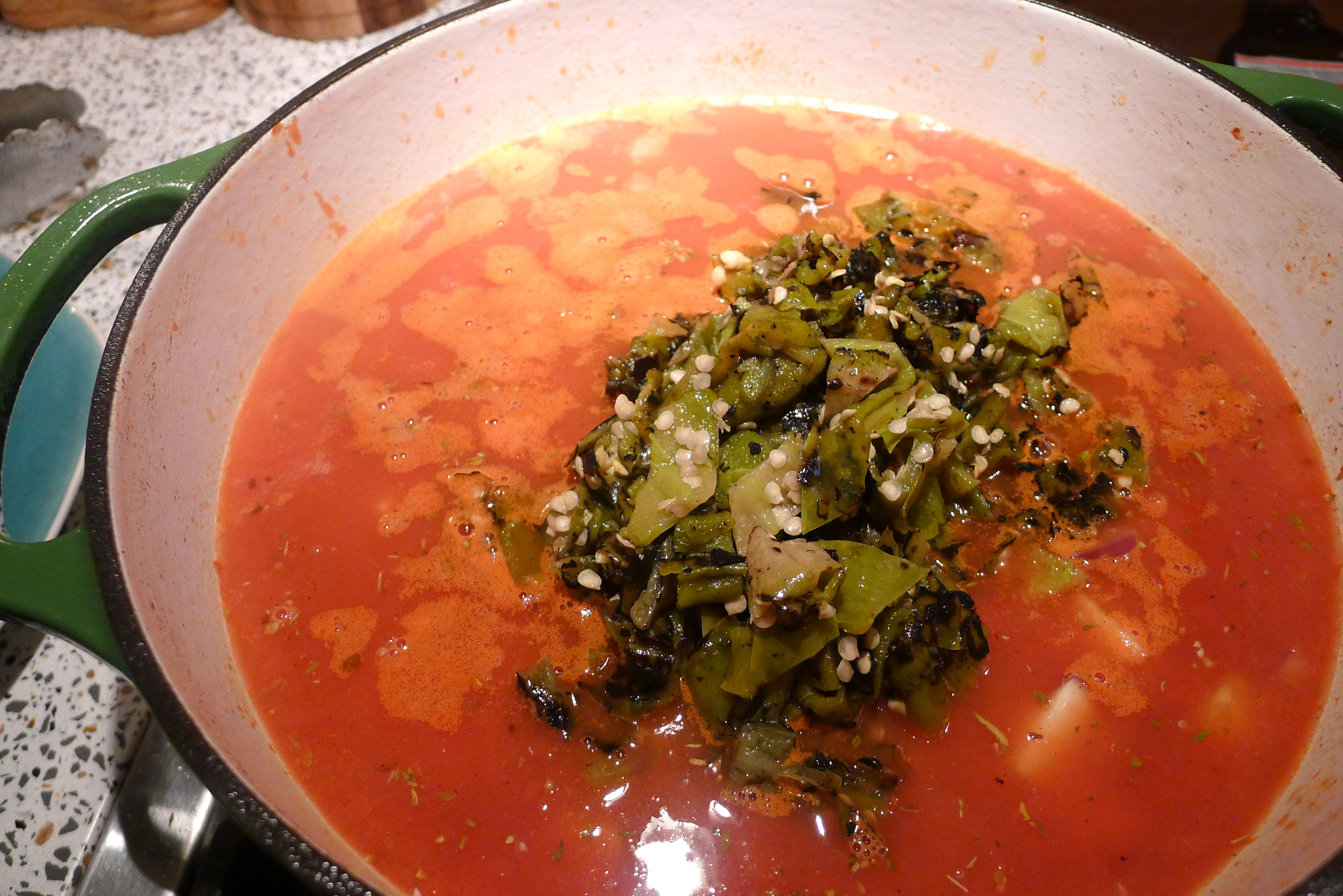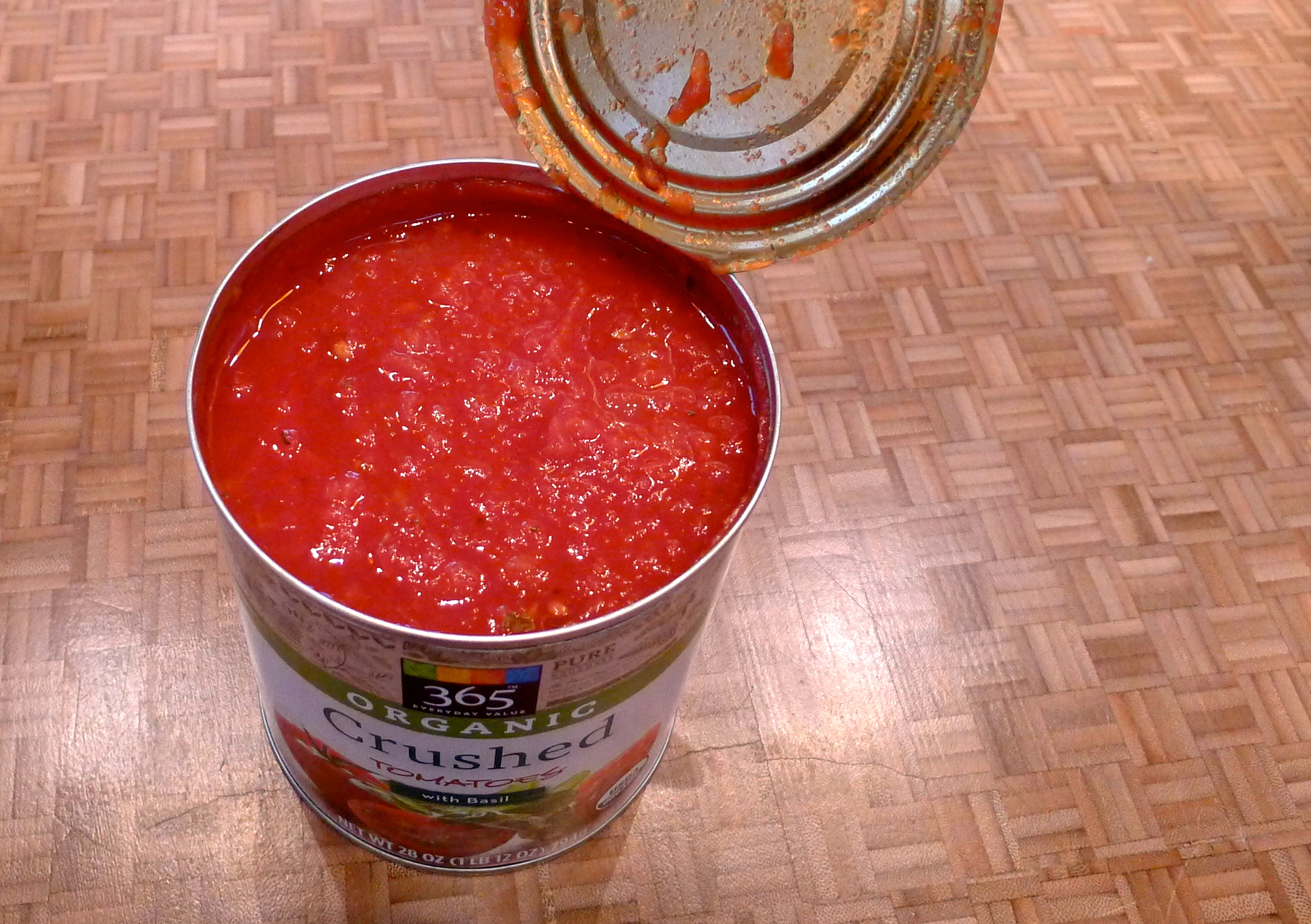 Into the pot with all of the meat drippings, I tossed the onion and garlic. I let them soften just a tad before adding a can of crushed tomatoes, a palmful each of oregano and coriander, and some chicken stock.