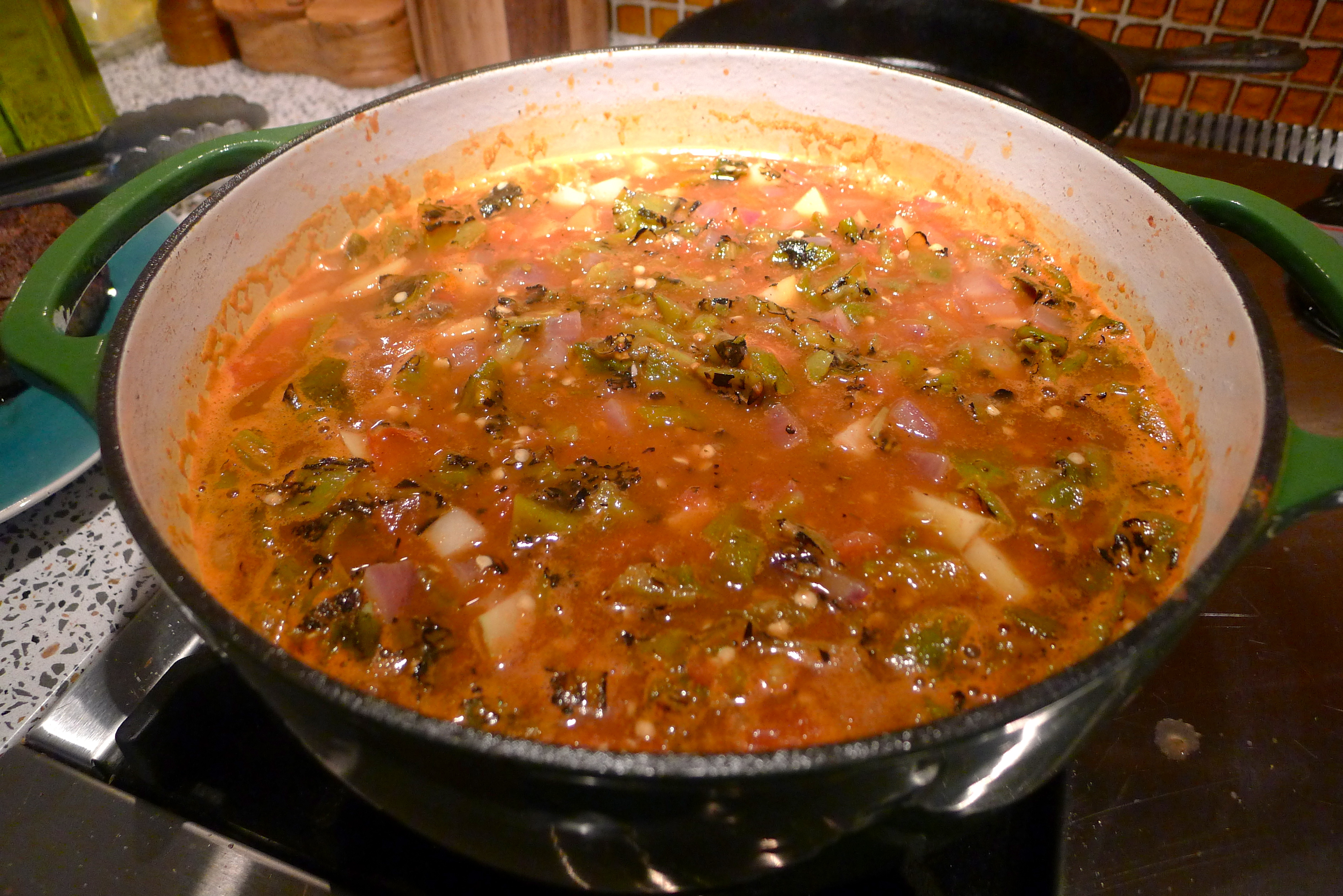 I added the potatoes and let the soup simmer a bit while I chopped up the whole green chiles. In they went, seeds and all!