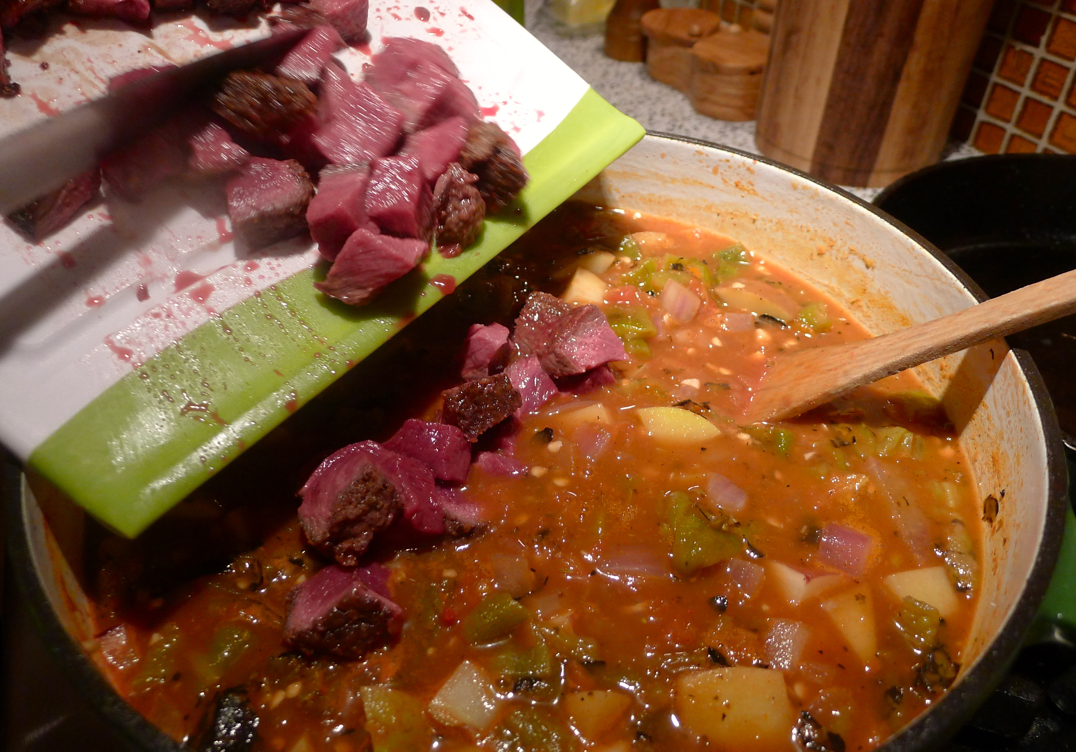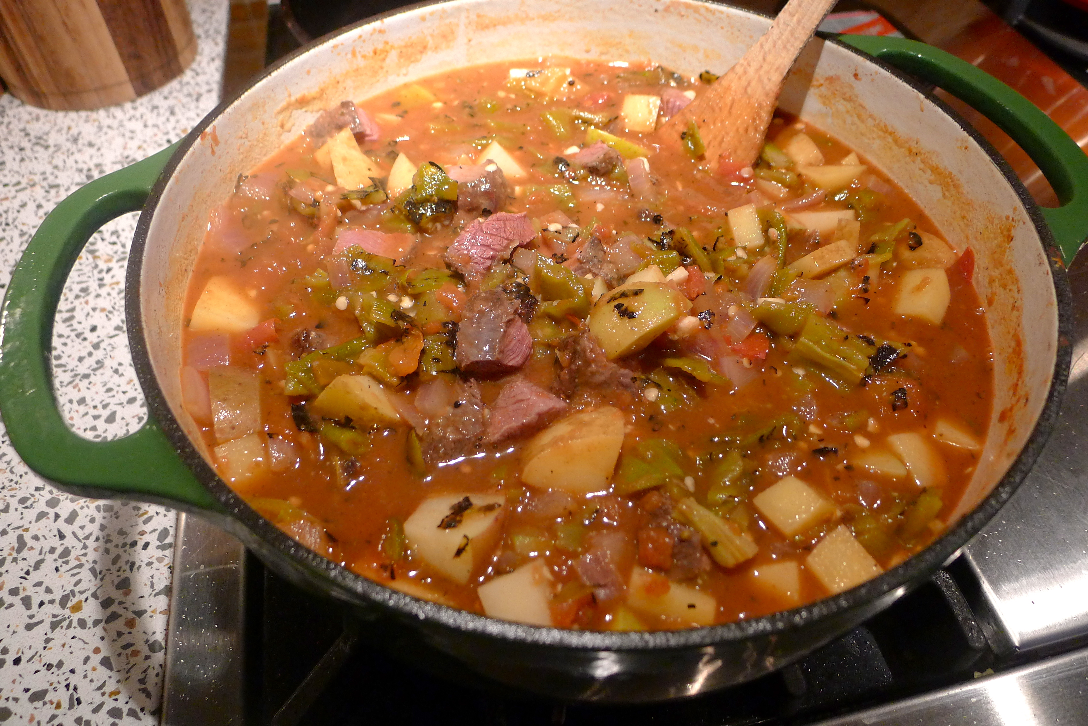 Reduce the heat to medium. Add the onion and the garlic. Sauté for a few minutes and then add the tomatoes, oregano, coriander, and chicken stock. Add the potatoes and green chiles. Chop up the sirloin into bite-sized pieces and add to the stew, including any juices.