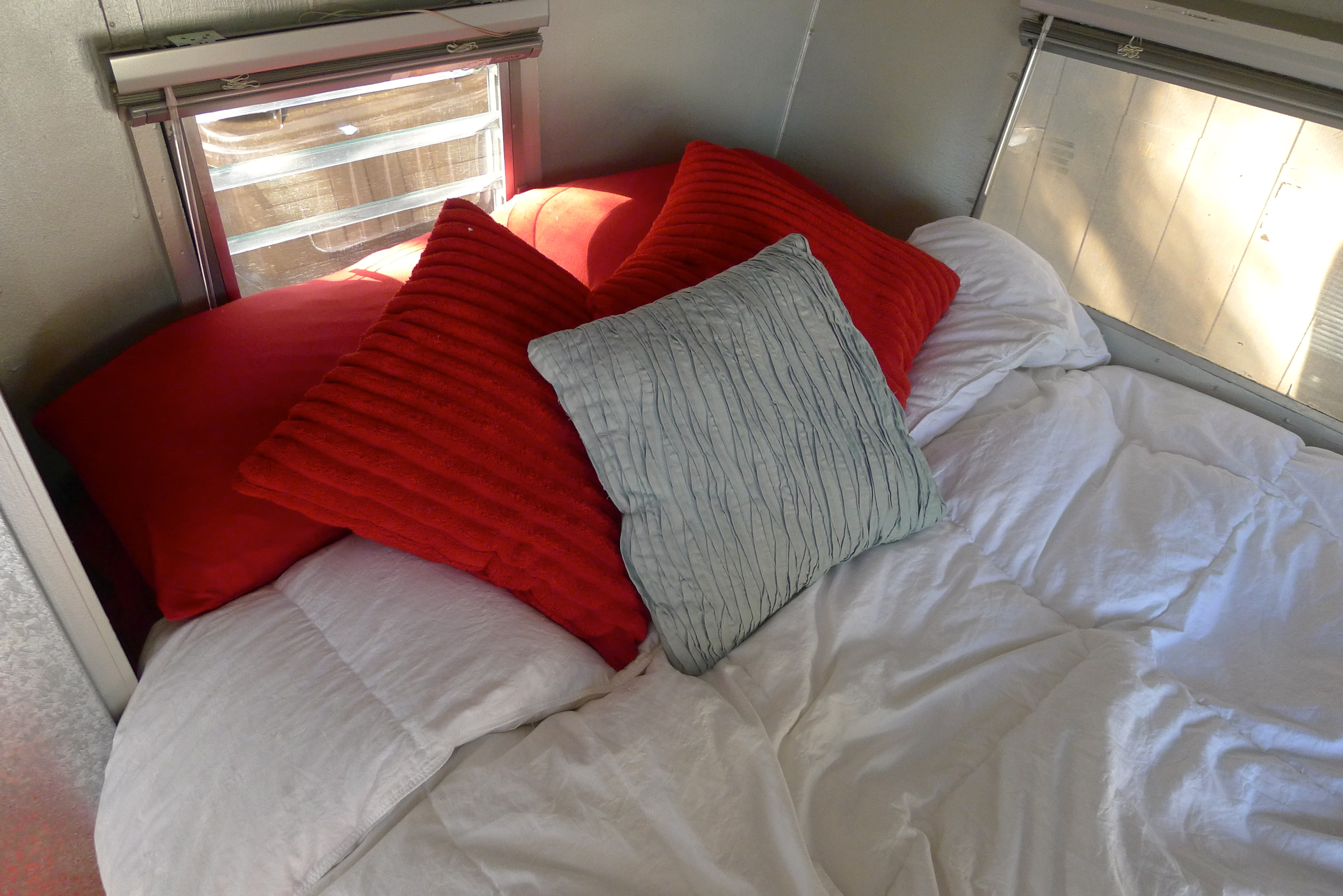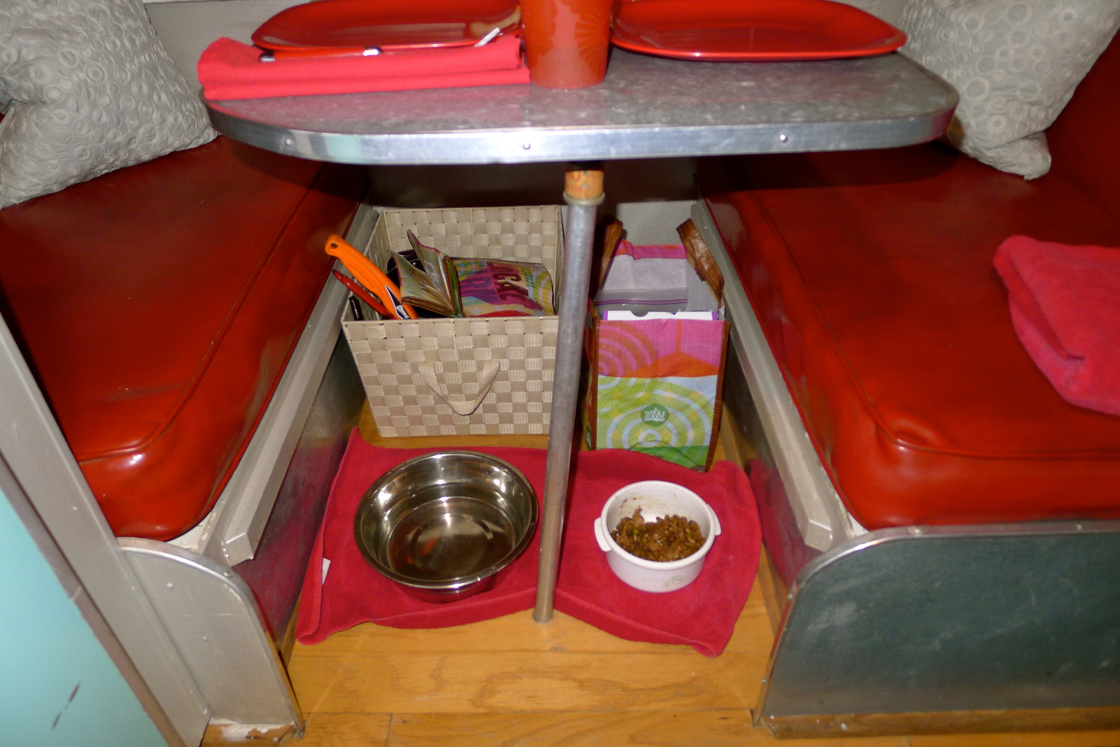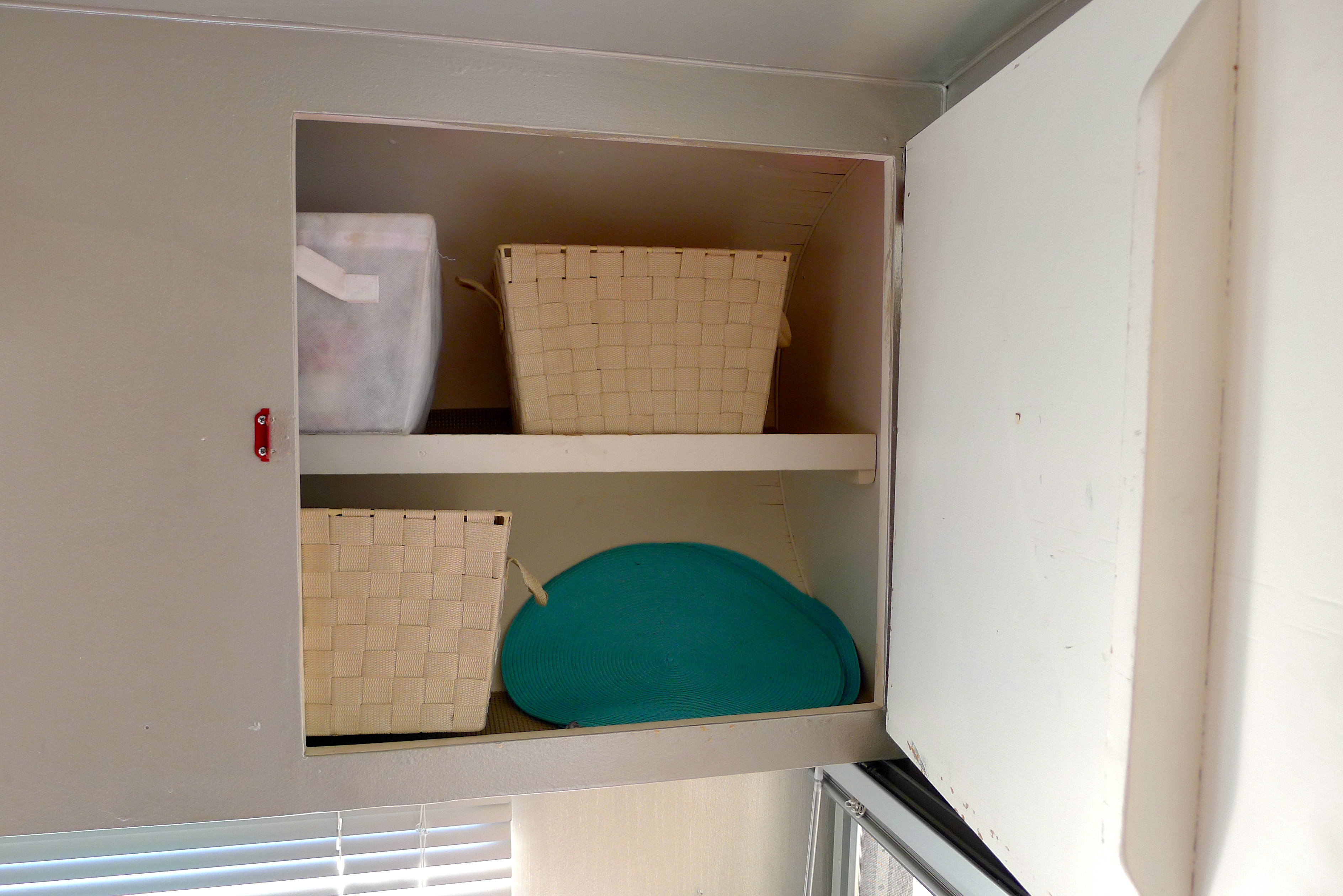 We make the bed ahead of time so it’s ready when we set up camp. We each have two small baskets for clothes, which fit in cabinets above the table- we each get a side. There’s a small closet for jackets and hanging clothes, where our tool kit, broom, and cleaning supplies also live. Extra items get stashed under the table or bed, out of the way.