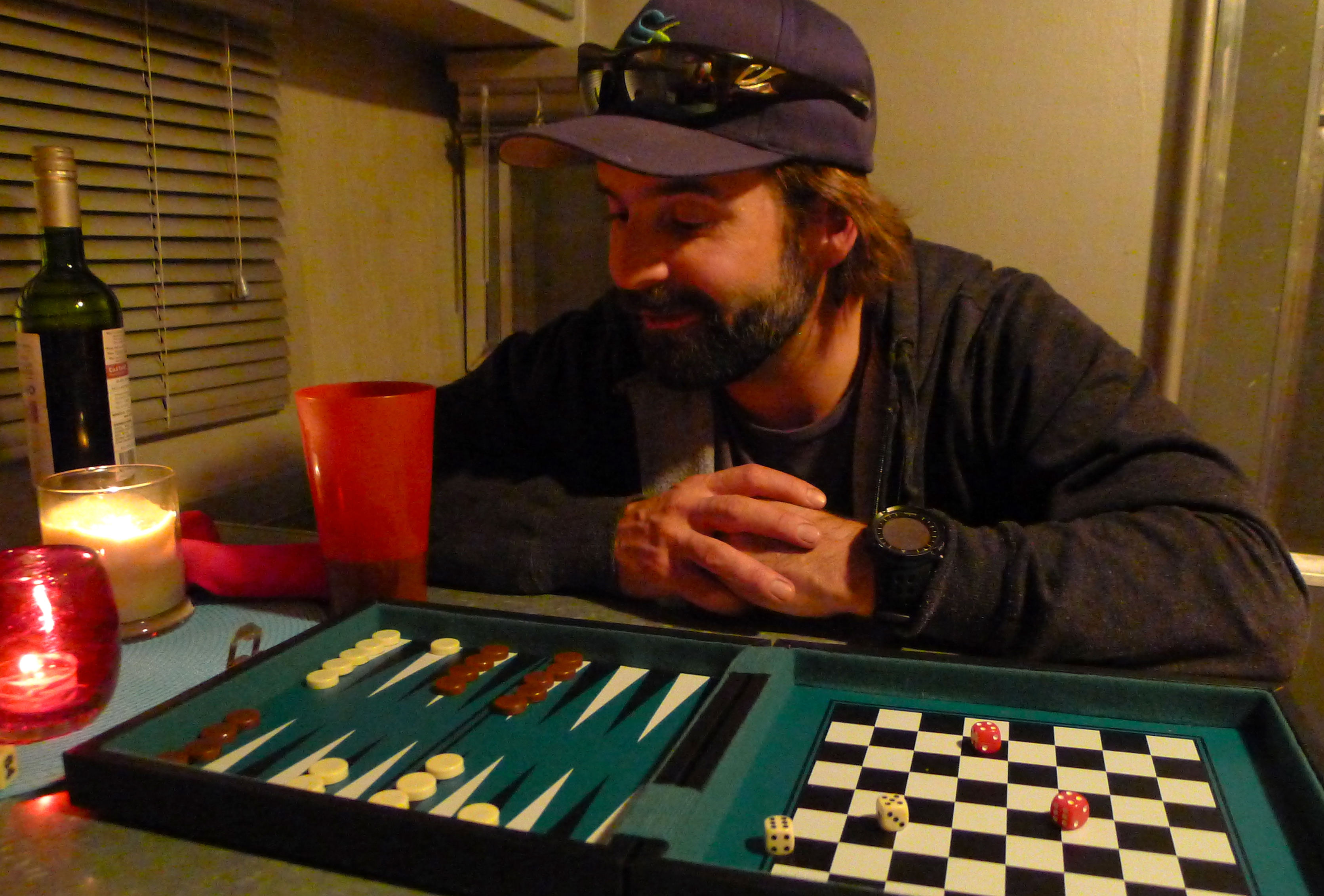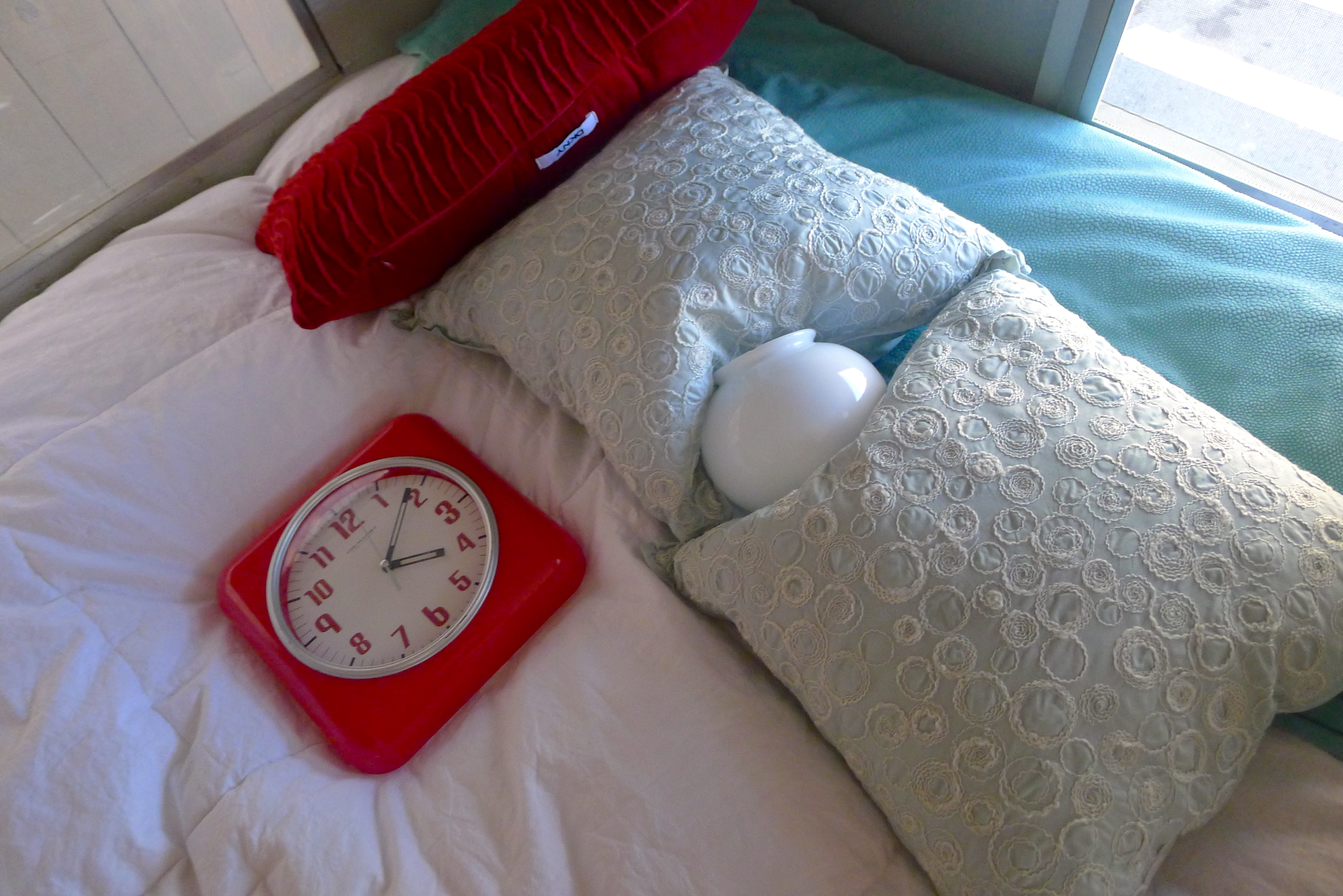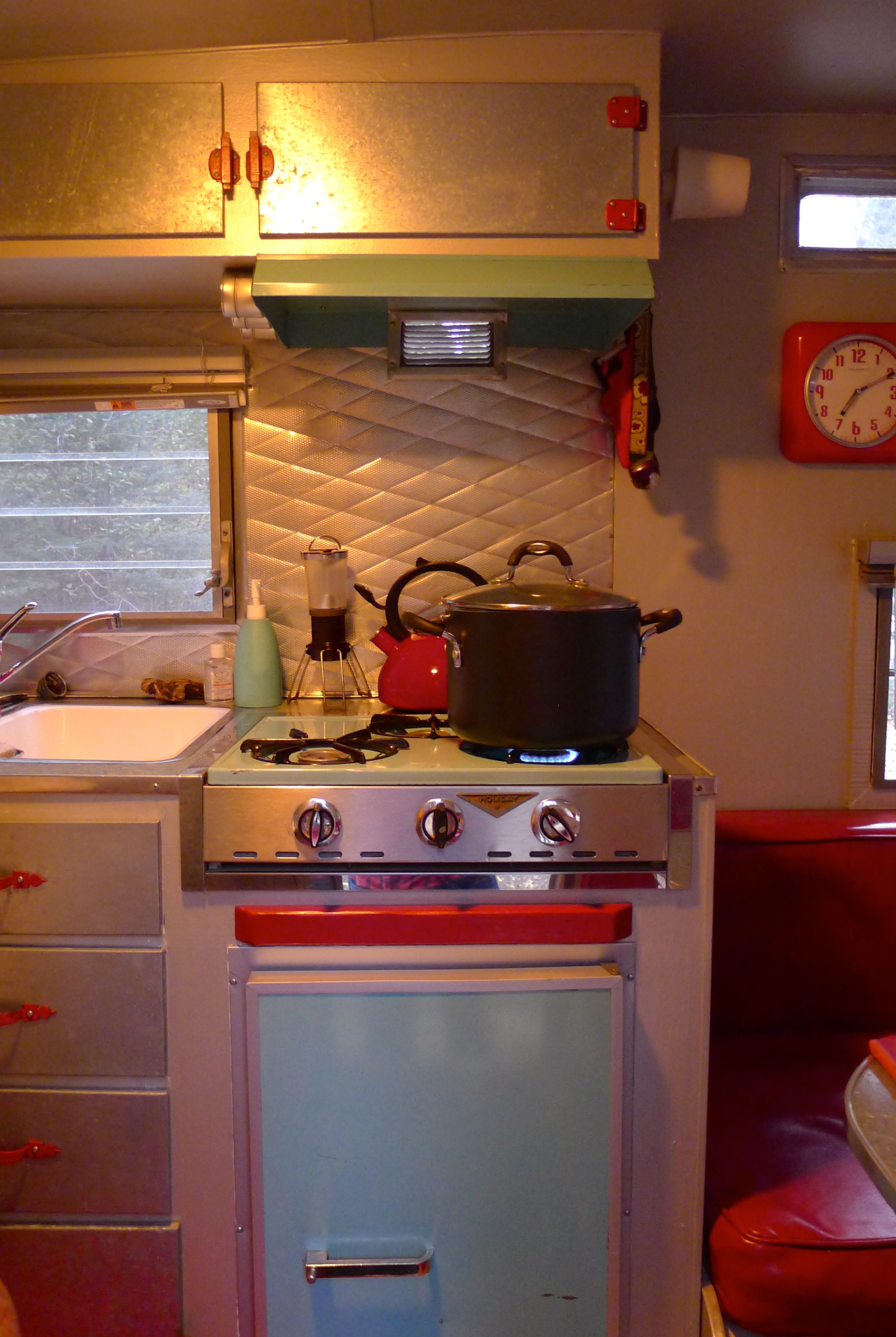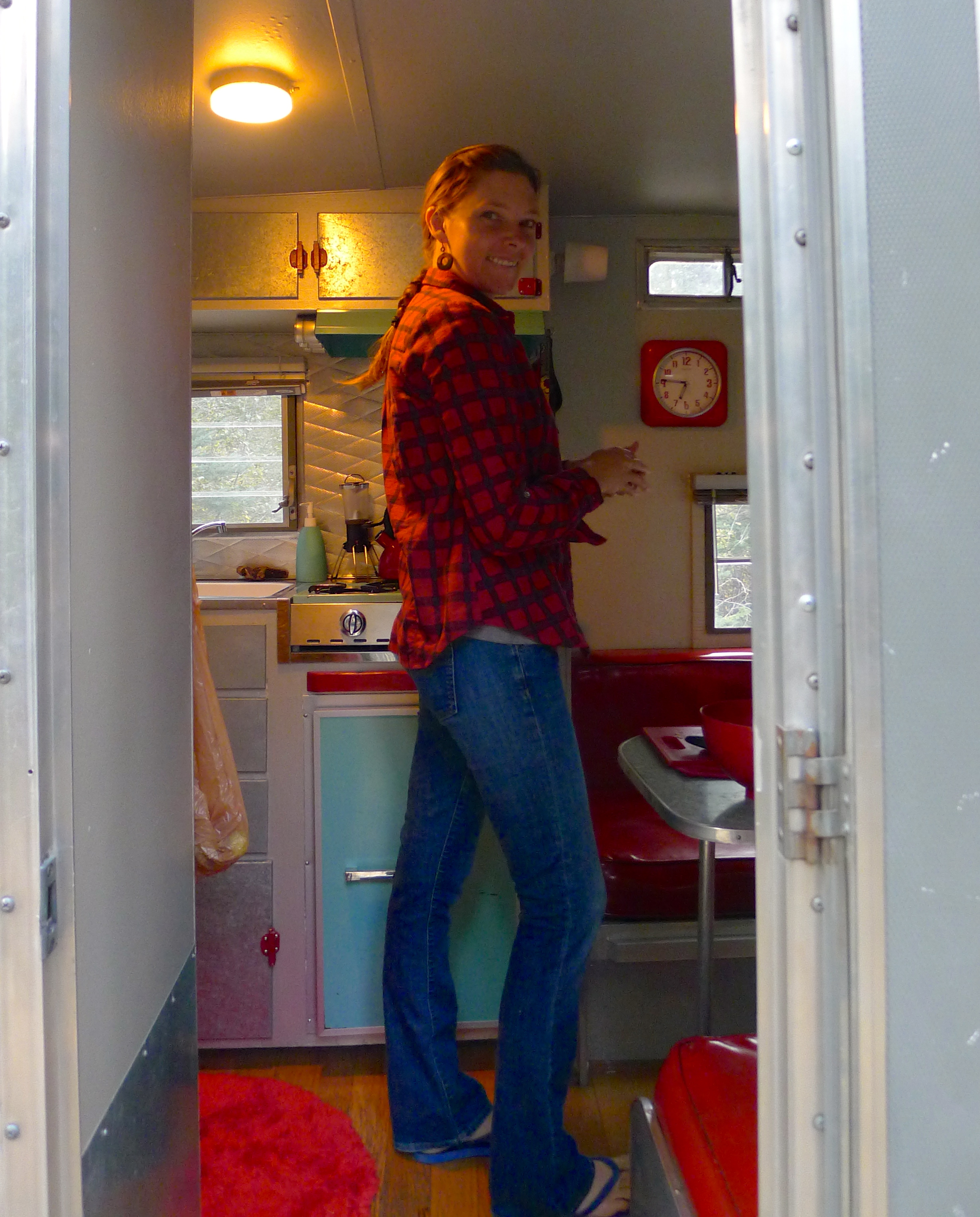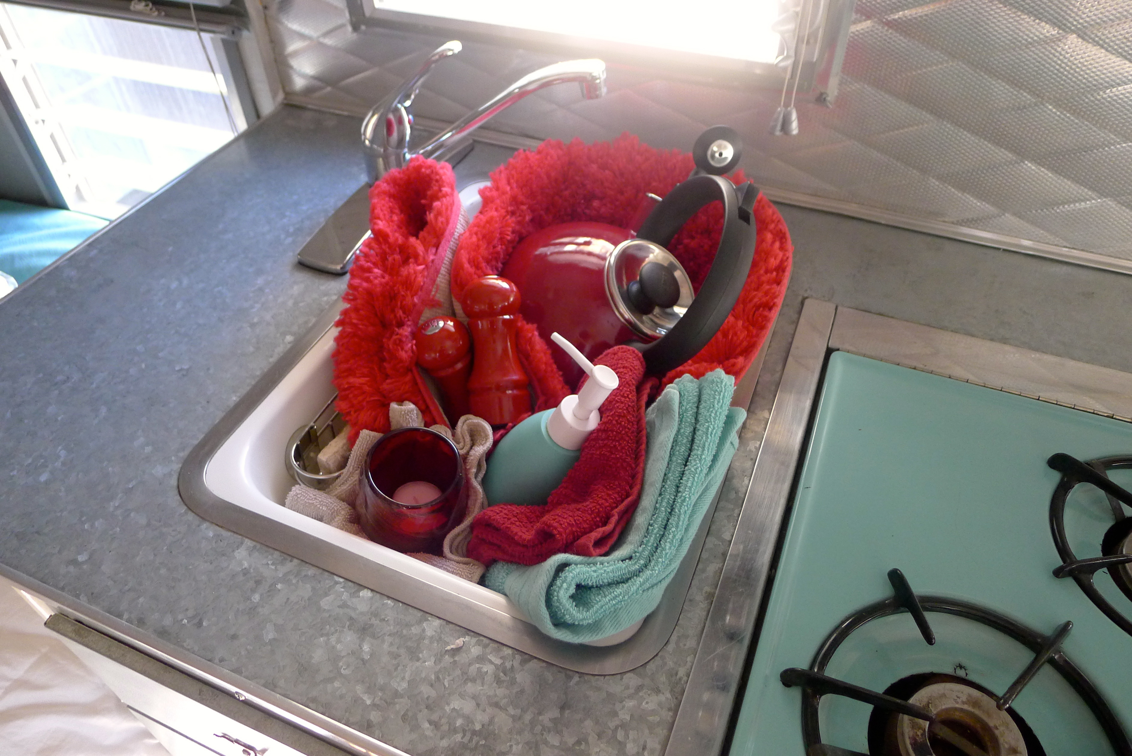There are plenty of creature comforts– books, candles, a tiny flower vase, a wall clock, plenty of pillows and throws, games. There are nostalgic items, like the piece of driftwood from the Washington coast, pictures from various photo booths and a growing collection of “We’ve been here” magnets, a hand-crocheted potholder from my Mom. When we travel, we secure breakable items on the bed or tucked into the sink in the fluffy rug. Everything has its place.
