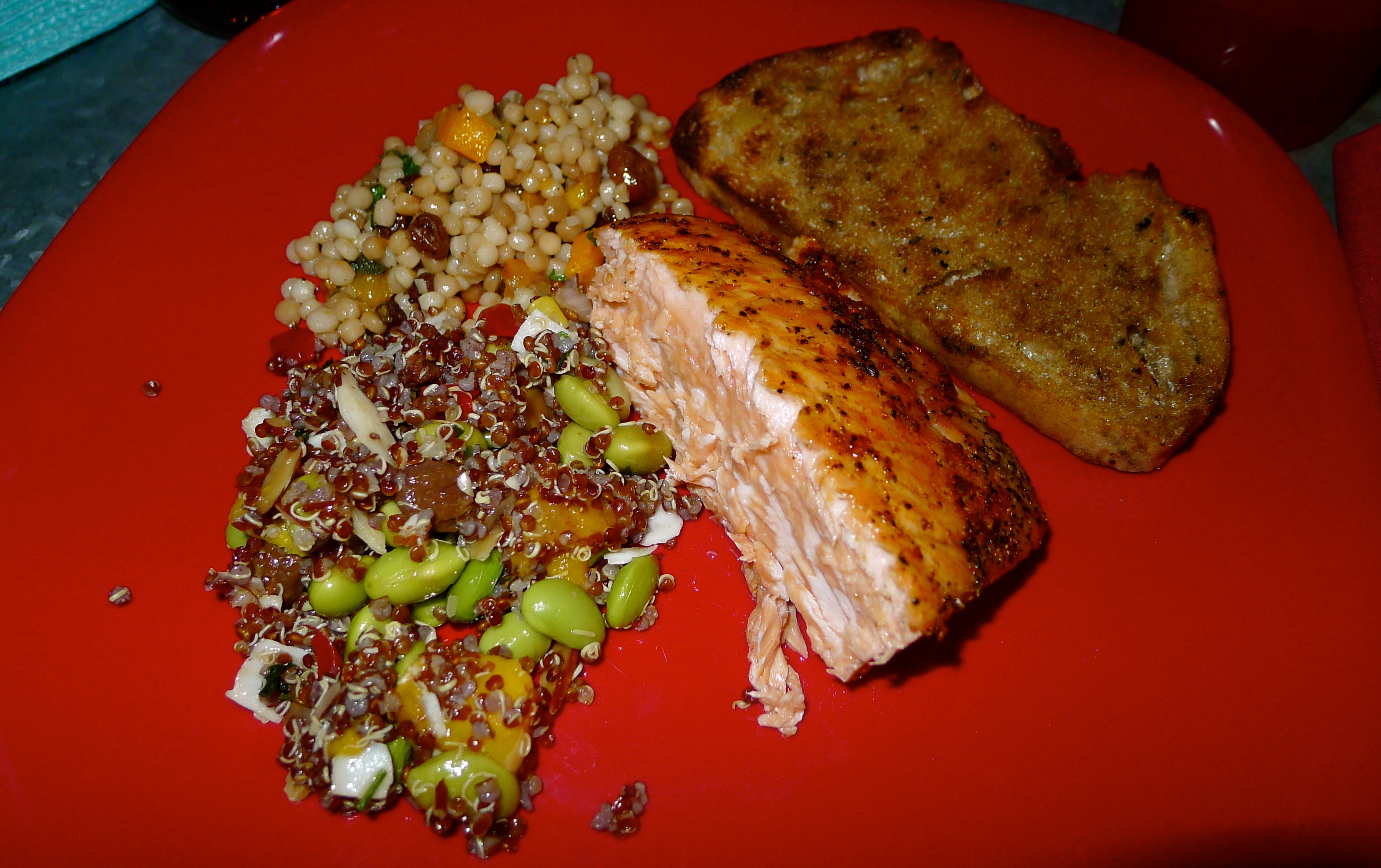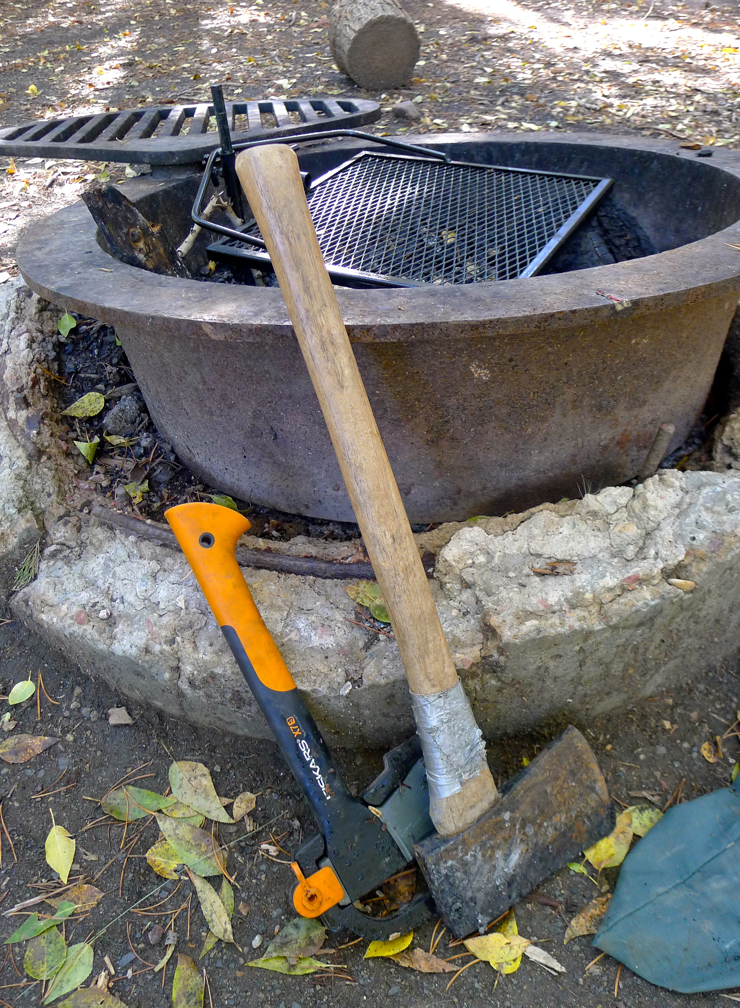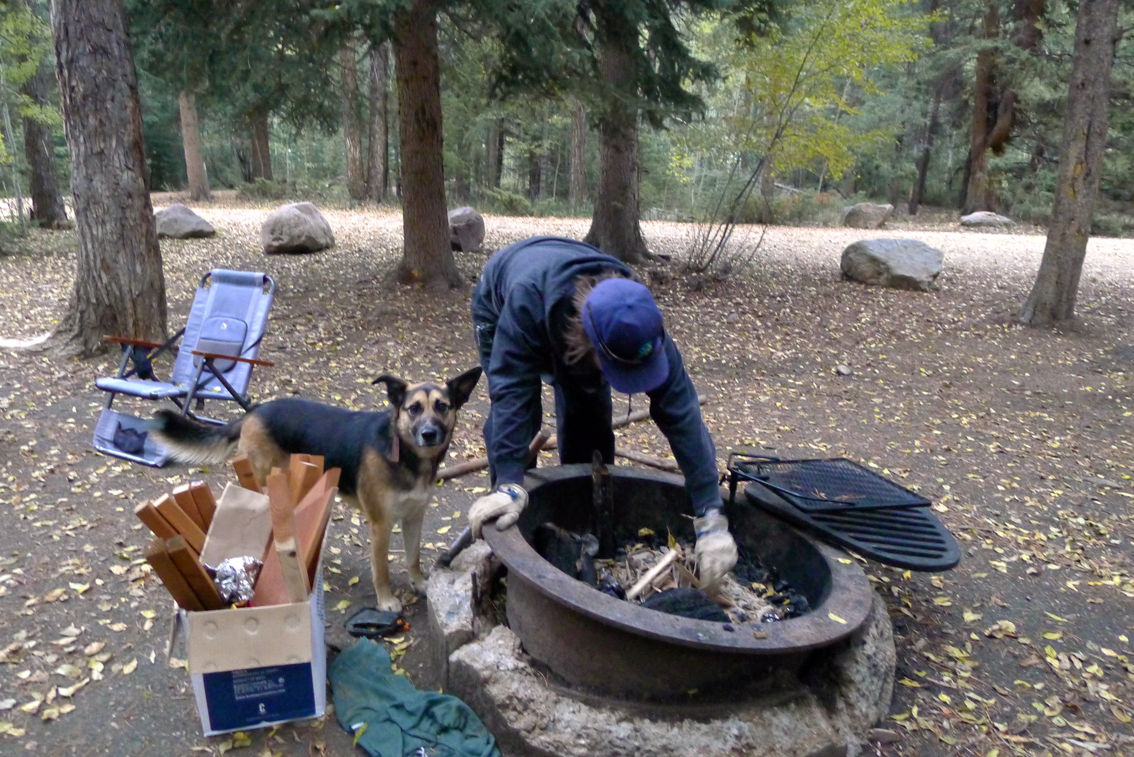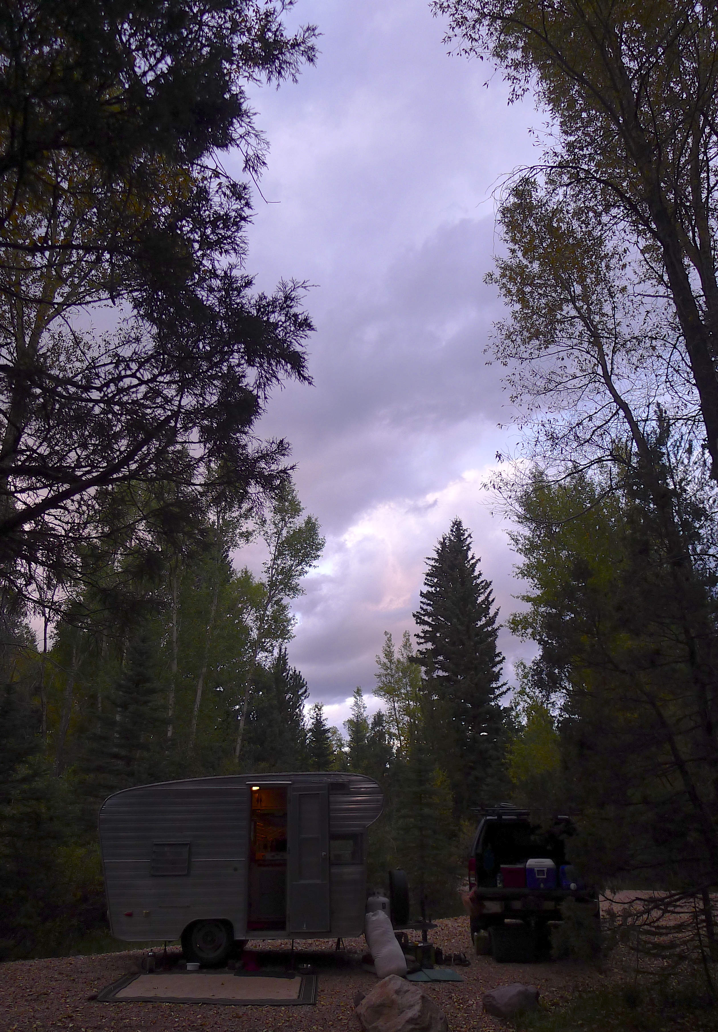 We set off on Friday evening by 5:30PM and were settling in at Aspen Grove campground before 7:00PM. When we arrive at a campsite, John and I divide and conquer. He pours us a couple of drinks, then sets up the coolers and camp chairs, unloads firewood and axes, and stabilizes the trailer. I roll out the outdoor rug, replace the items inside the camper that were secured for traveling, and get started on happy hour snacks. Candles and lanterns helped illuminate dinner prep: easy side dishes from the deli at Whole Foods and tasty salmon for the grill. Scrumptious!