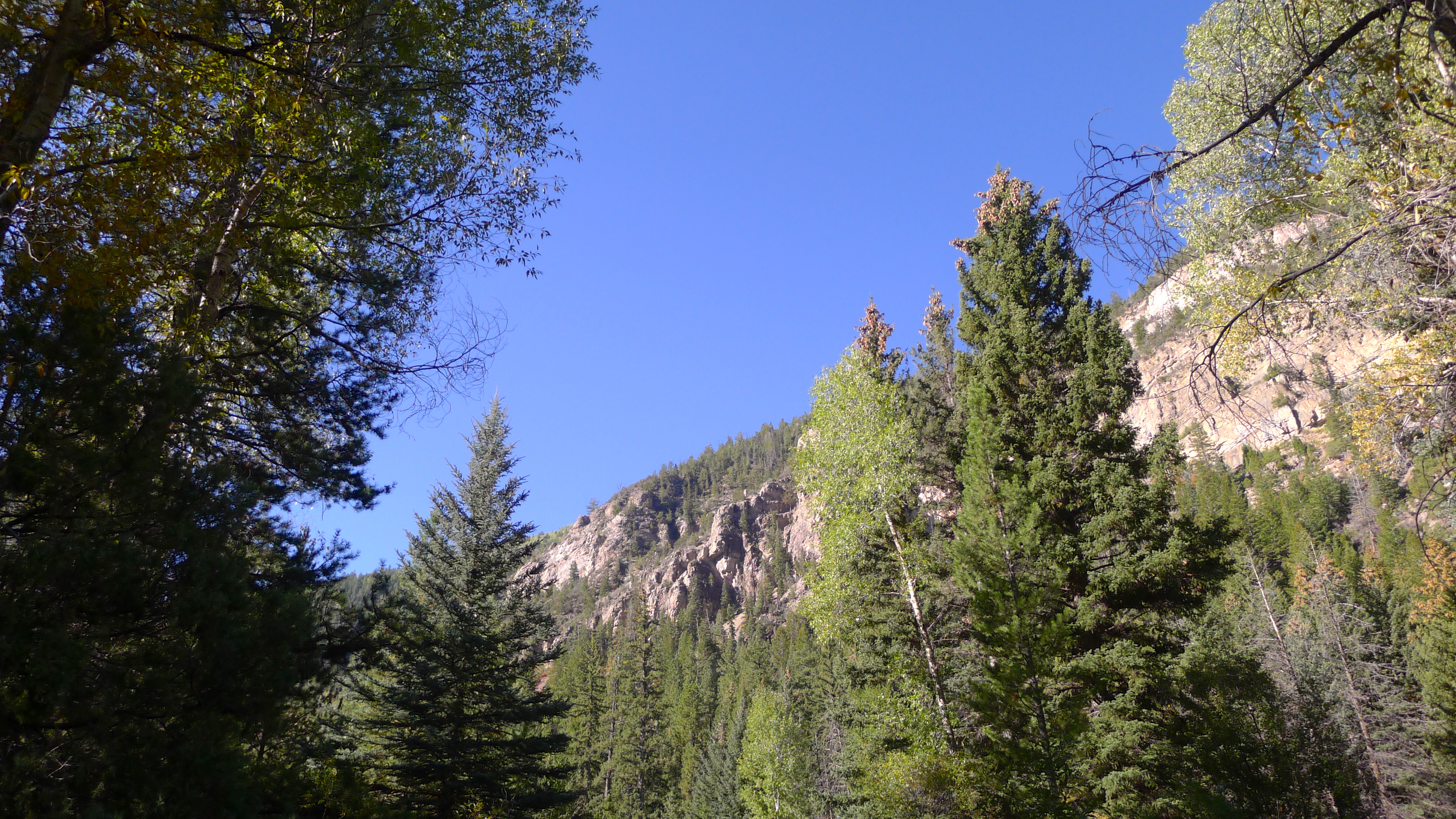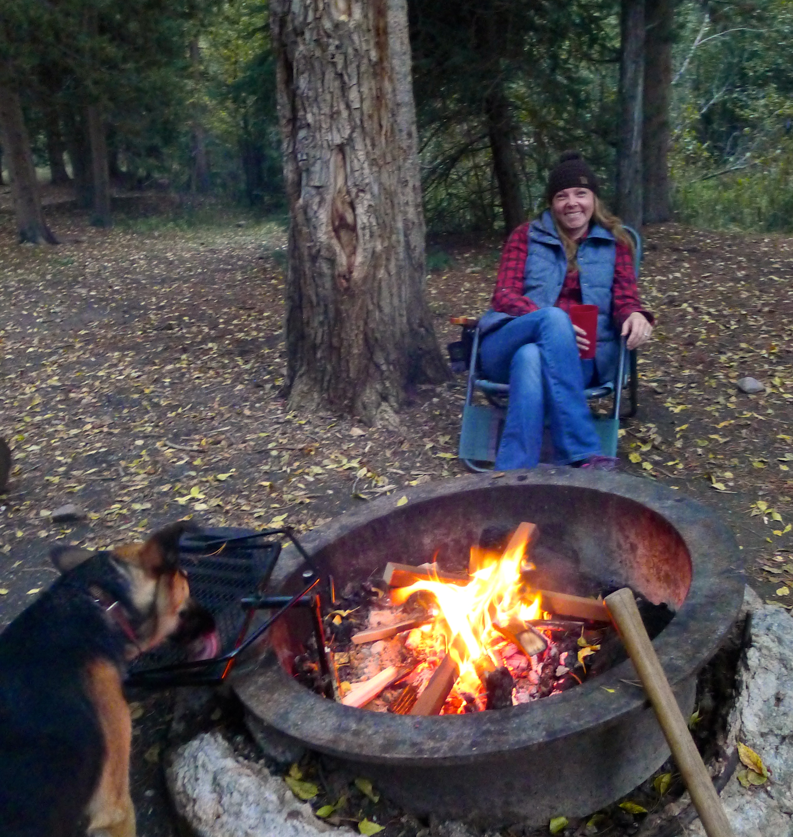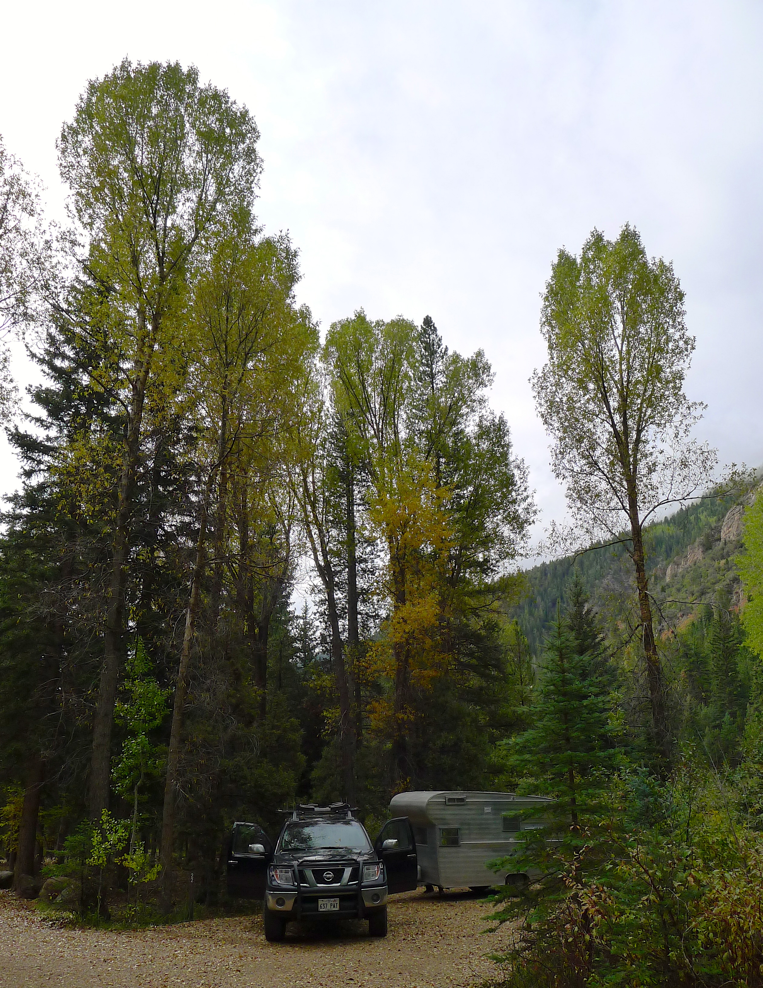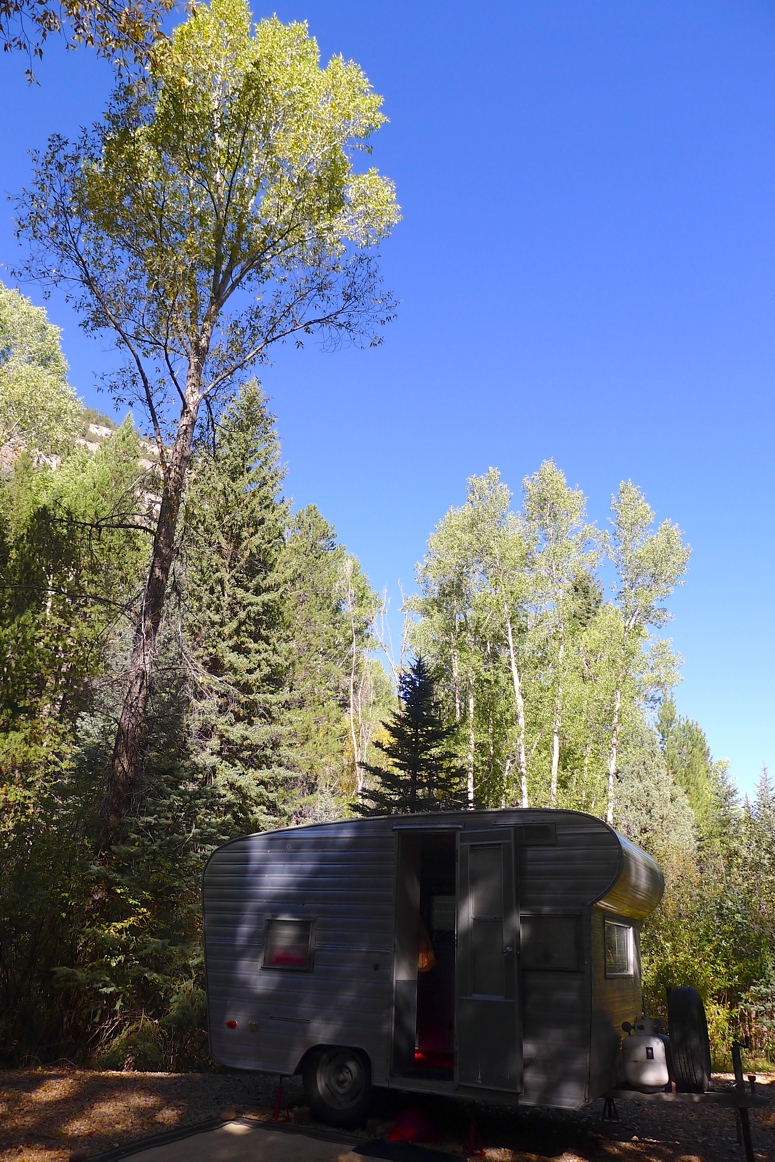 I love opening Betty’s door in the morning and seeing our surroundings. Since we usually arrive as daylight is fading, this is the first chance to see where we landed. Saturday’s sky was big and blue, and Betty was tucked in under yellowing aspens and pine trees. I sipped my cup of extra-strong coffee while John pointed out a trail to explore on the map. Cholula’s ears were in overdrive, multiple squirrels chirping their warnings from all directions. The trees swayed above us in the breeze, and a few leaves fluttered to the ground.  A trail to my right led to the Duchesne River, and a rugged cliff band was visible beyond the trees. What a gorgeous autumn day!