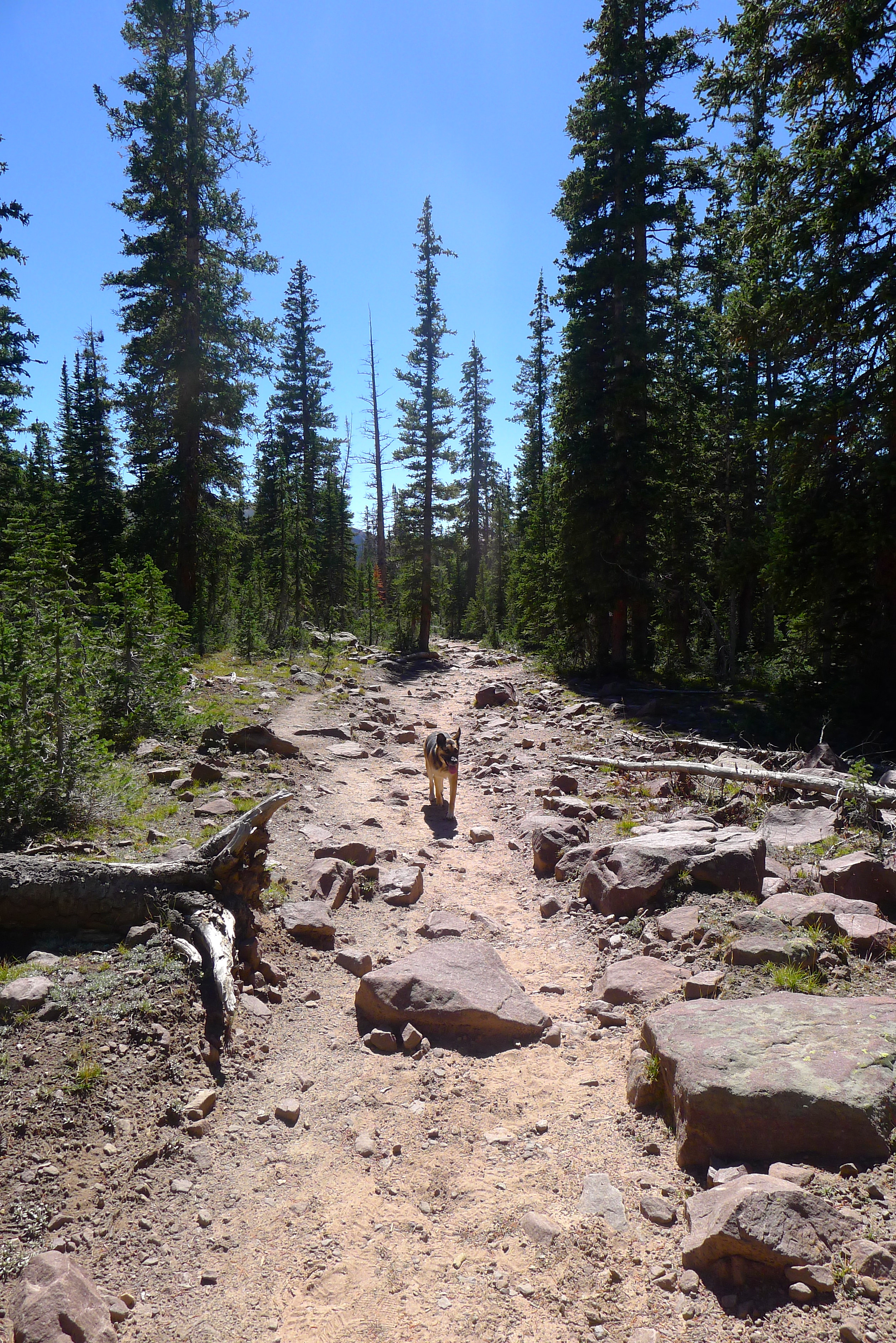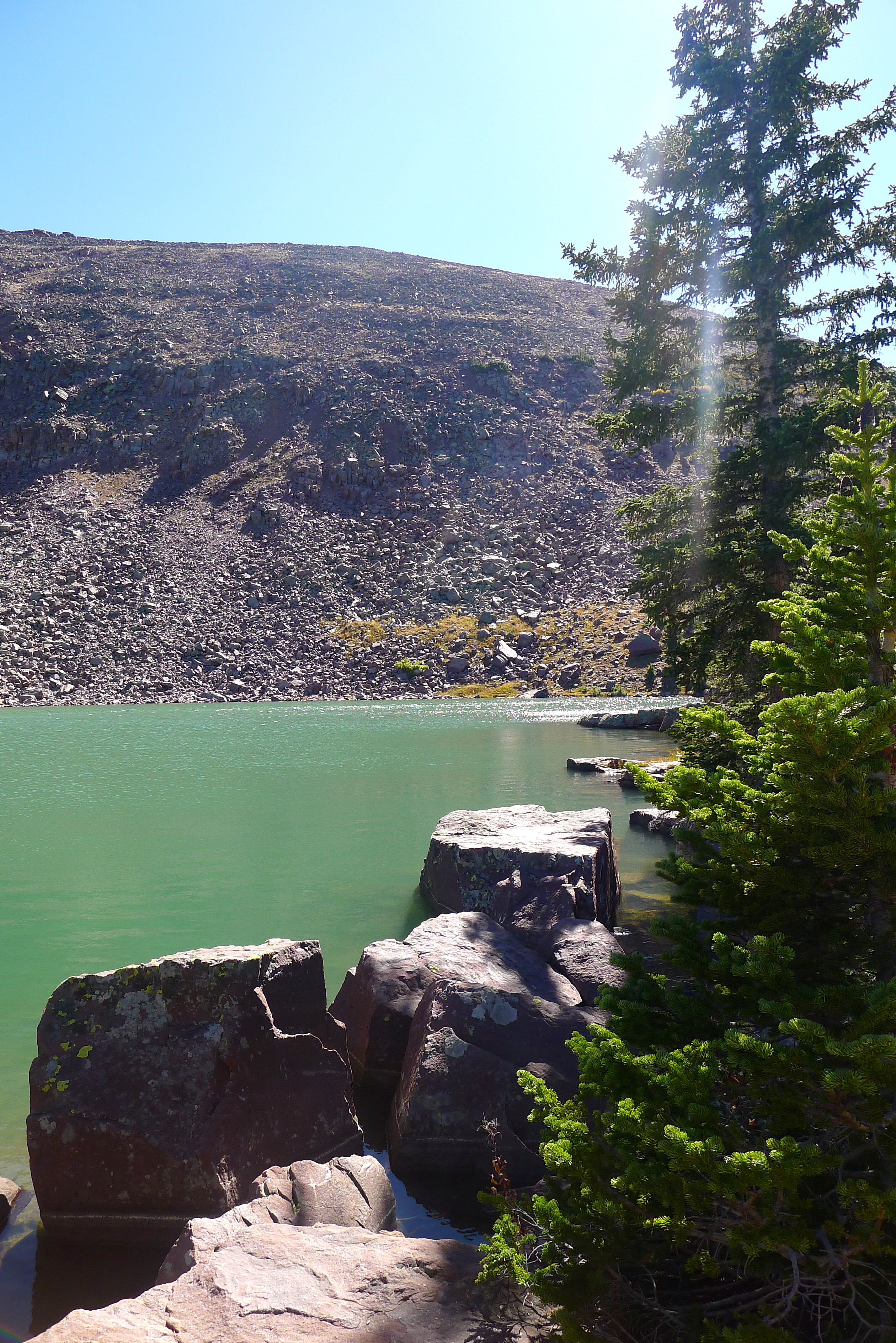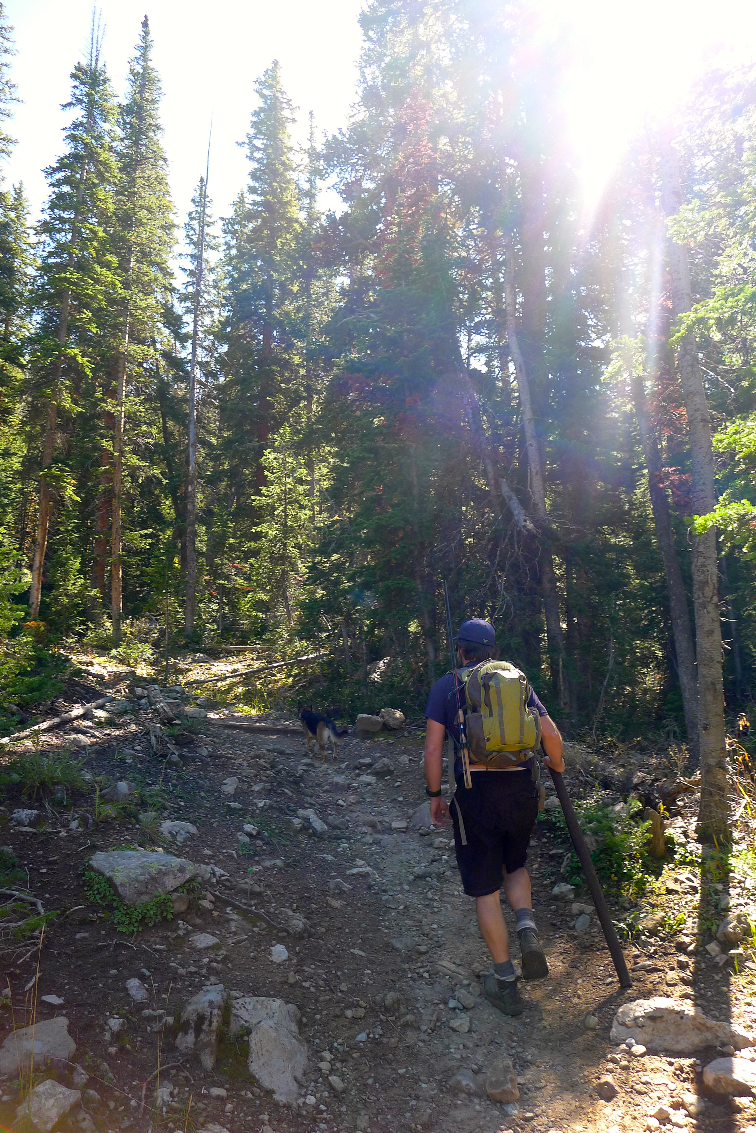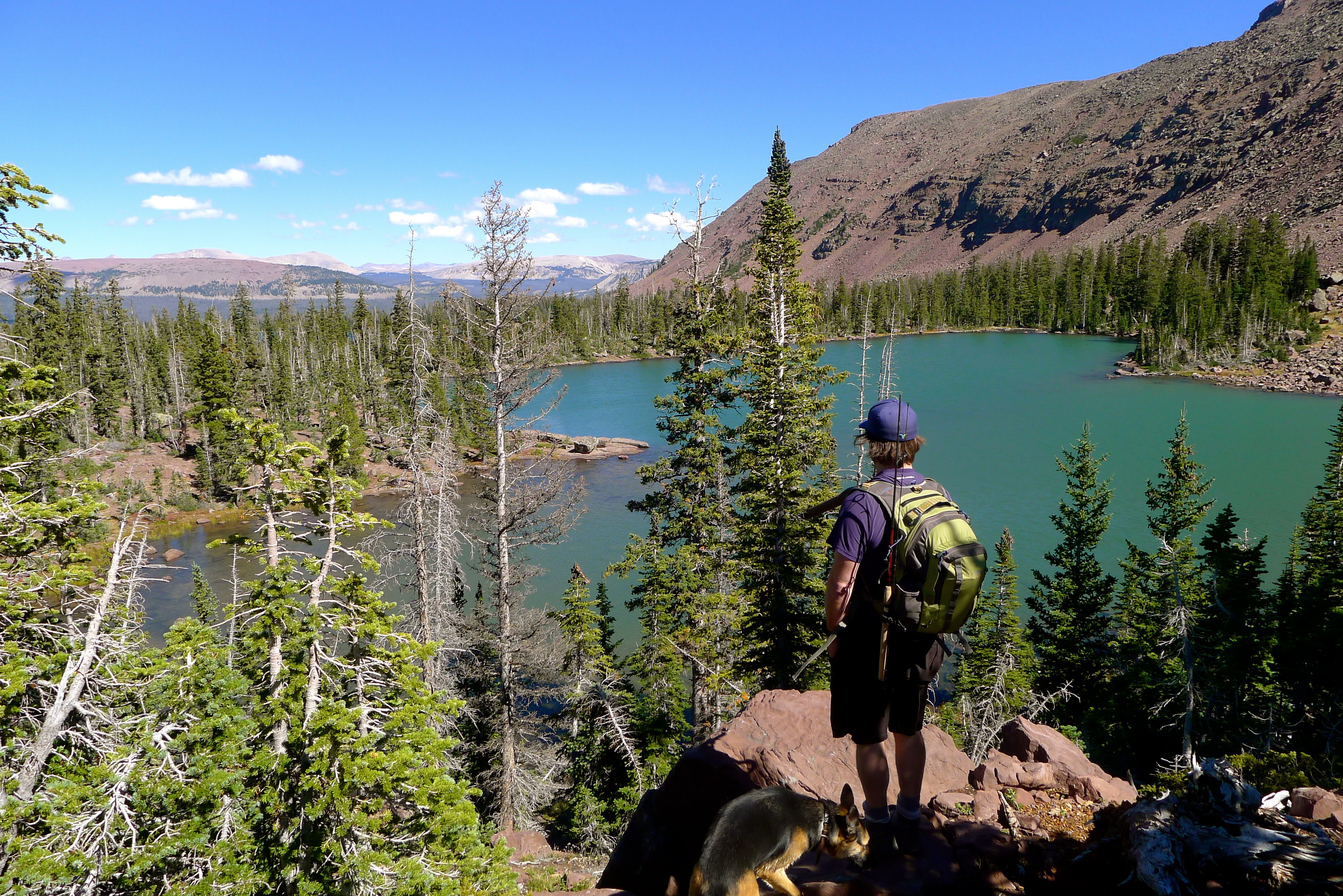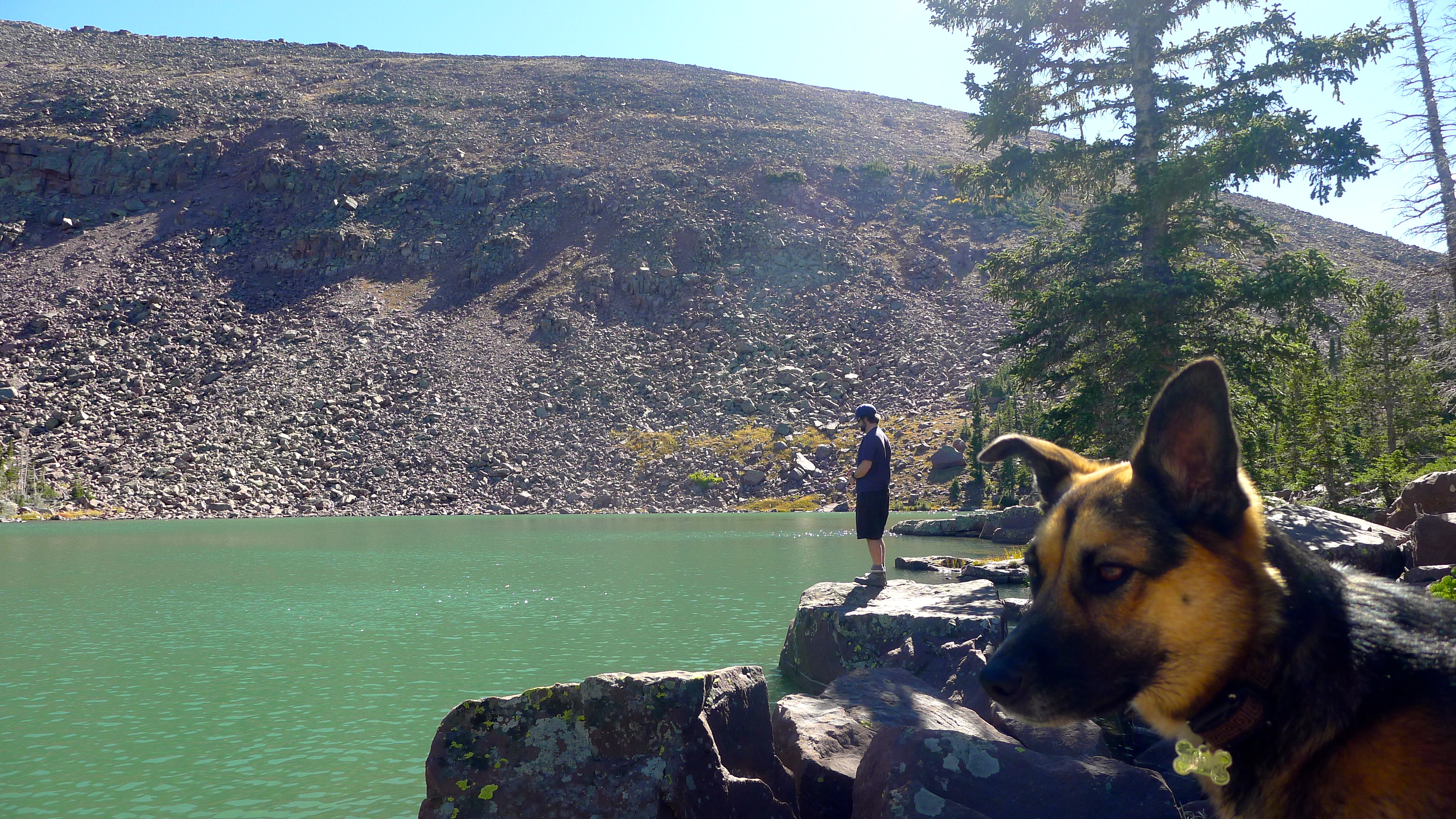 After packing up a portable lunch, we left camp in search of a hike. We (finally) found the dirt road that would lead us high into the Uintahs to Grand View trailhead. We climbed slowly and steadily for a few miles, up and over Hades Pass, just below the tree line to Heart Lake. It was small and deep, glacier-blue and tucked under the barren Grandaddy Mountain. The much larger Grandaddy Lake was below us, with the high point of Utah, King Peak, in the distance. We munched on turkey and salmon wraps and fresh strawberries in the sunshine, warming ourselves against the rocks. John dipped his fishing line in the lake and Cholula took a swim.