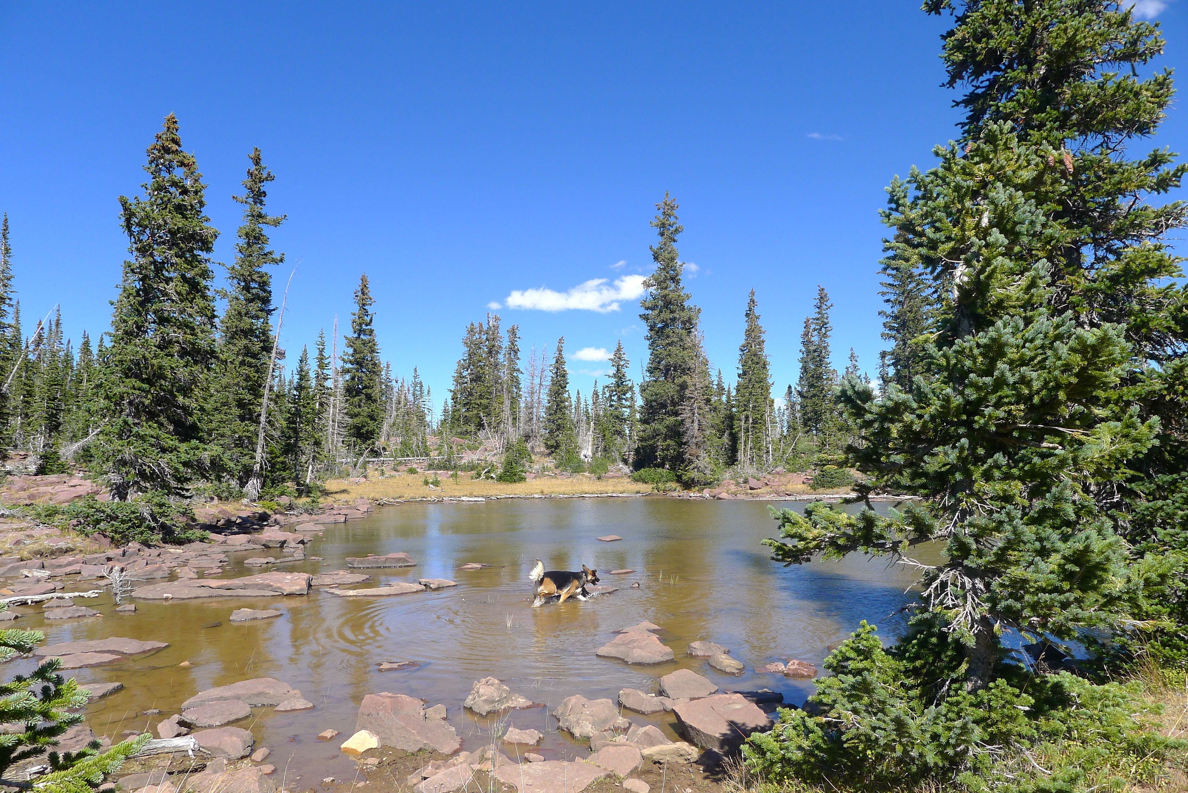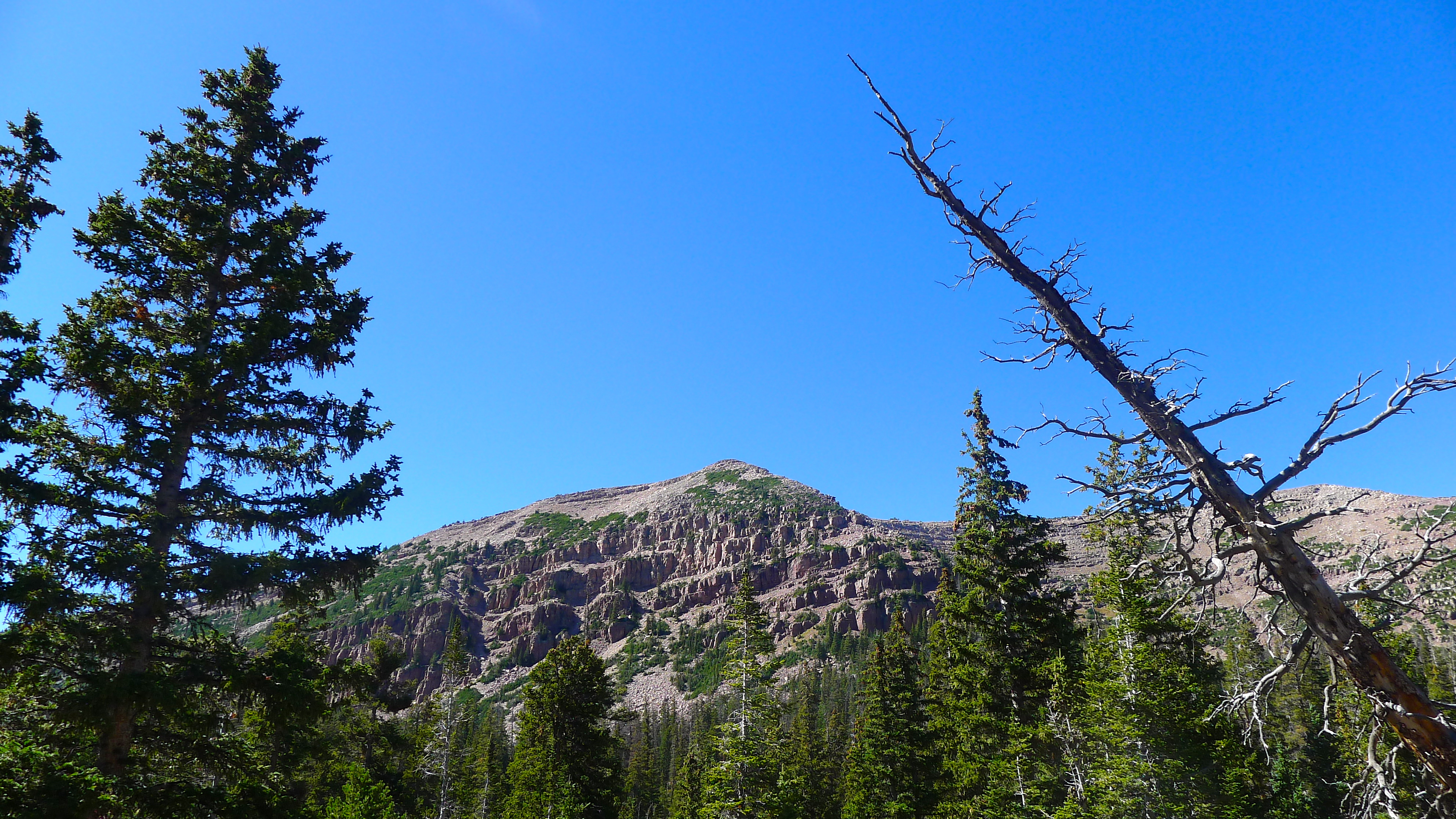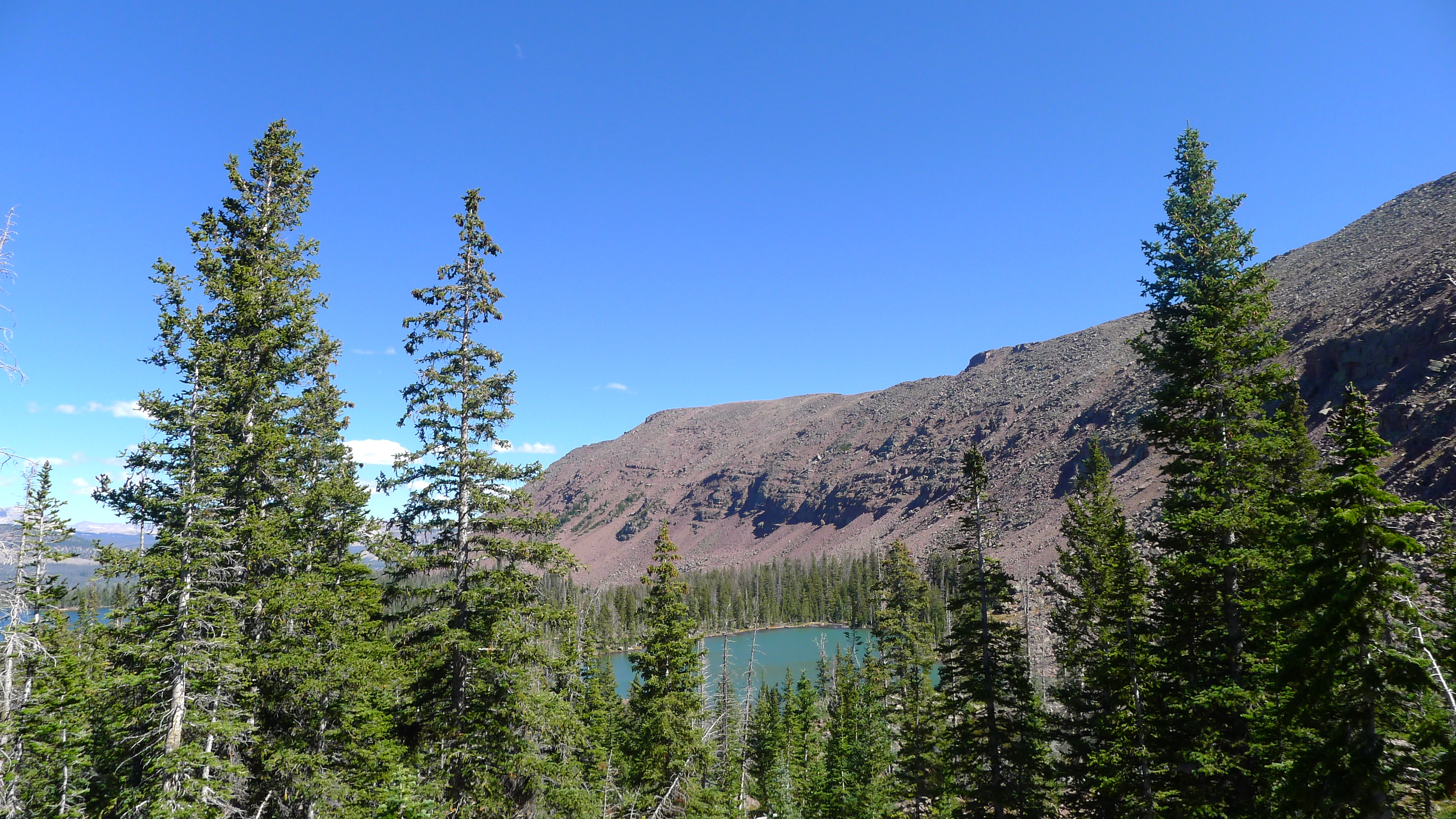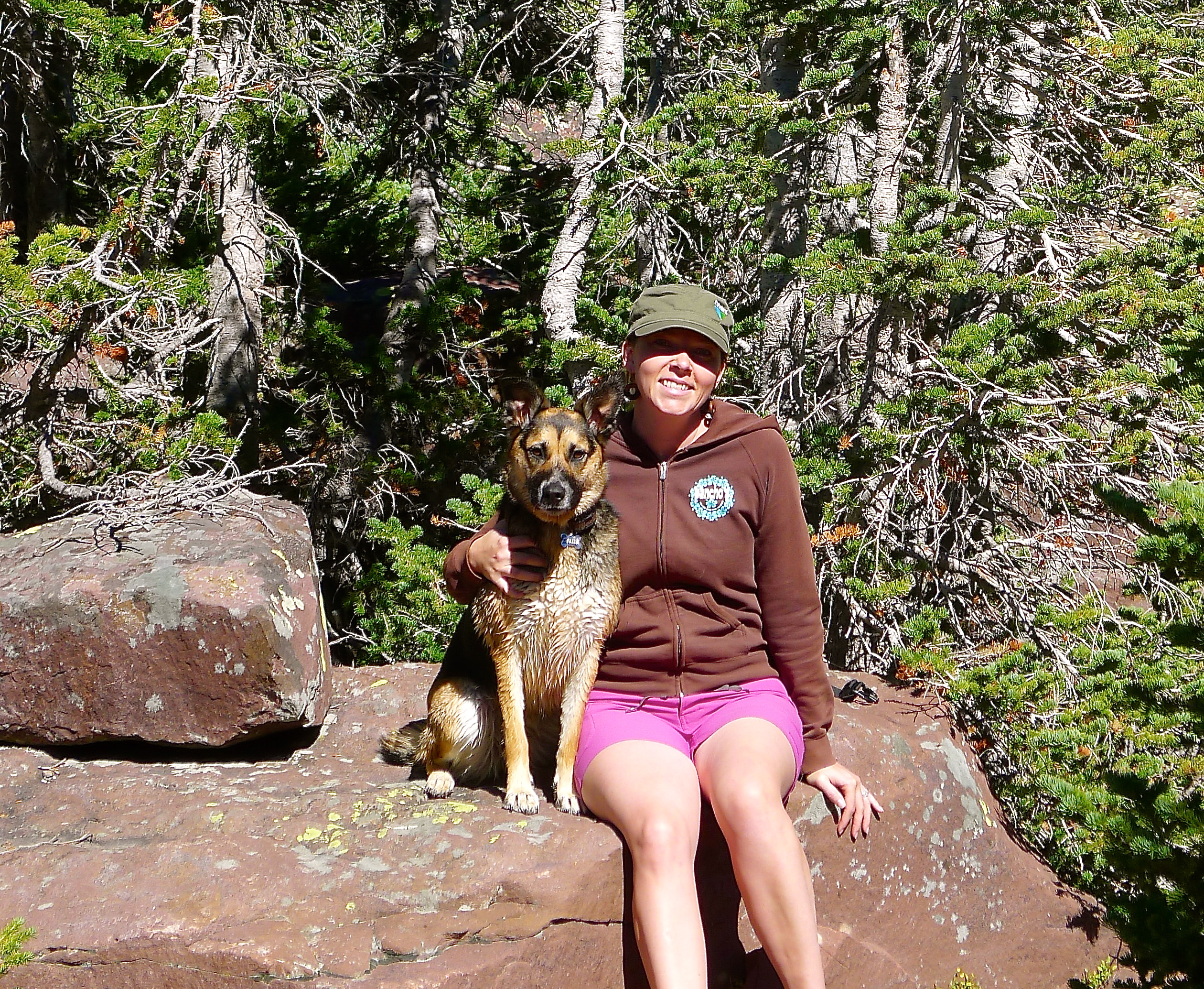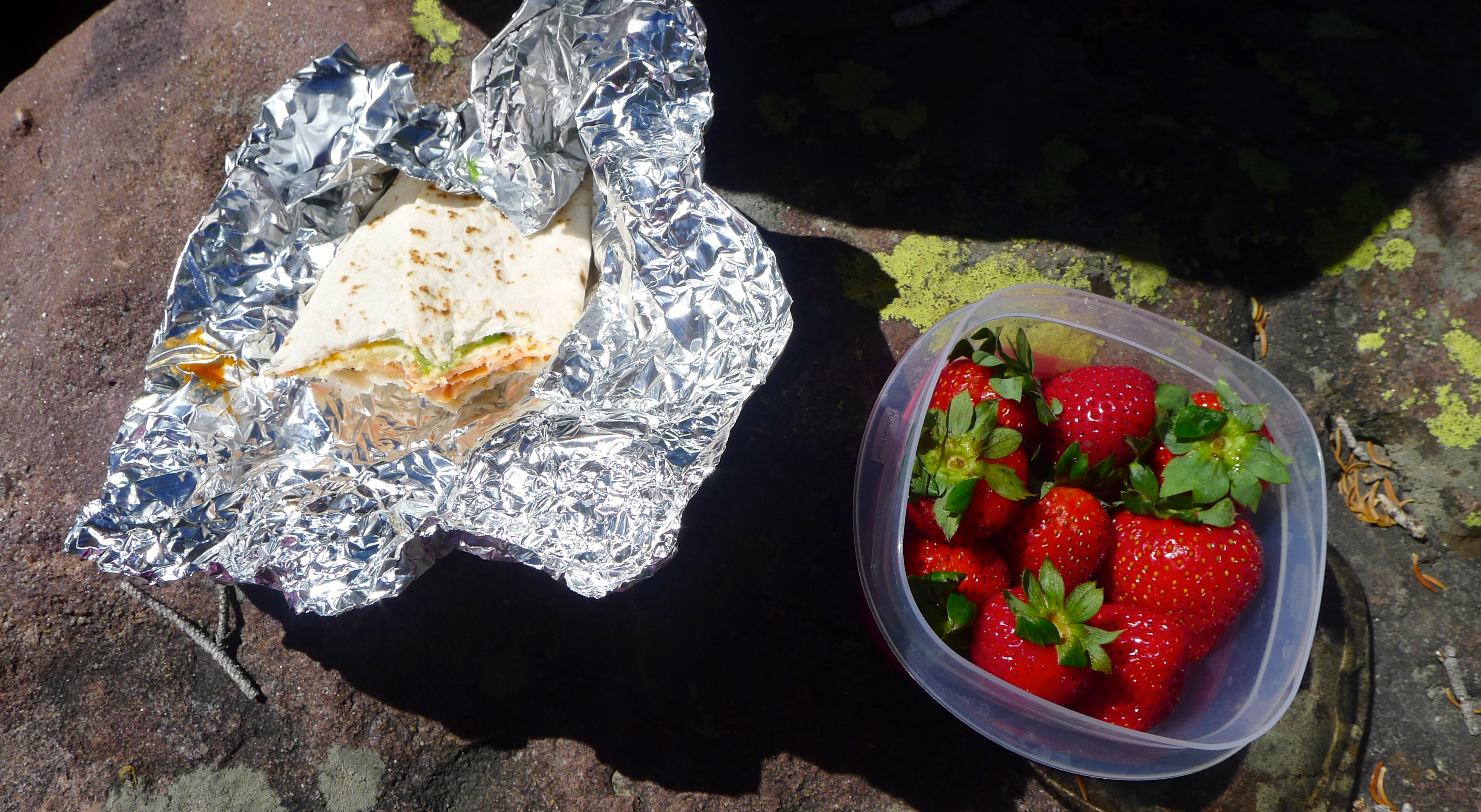 After packing up a portable lunch, we left camp in search of a hike. We (finally) found the dirt road that would lead us high into the Uintahs to Grand View trailhead. We climbed slowly and steadily for a few miles, up and over Hades Pass, just below the tree line to Heart Lake. It was small and deep, glacier-blue and tucked under the barren Grandaddy Mountain. The much larger Grandaddy Lake was below us, with the high point of Utah, King Peak, in the distance. We munched on turkey and salmon wraps and fresh strawberries in the sunshine, warming ourselves against the rocks. John dipped his fishing line in the lake and Cholula took a swim.