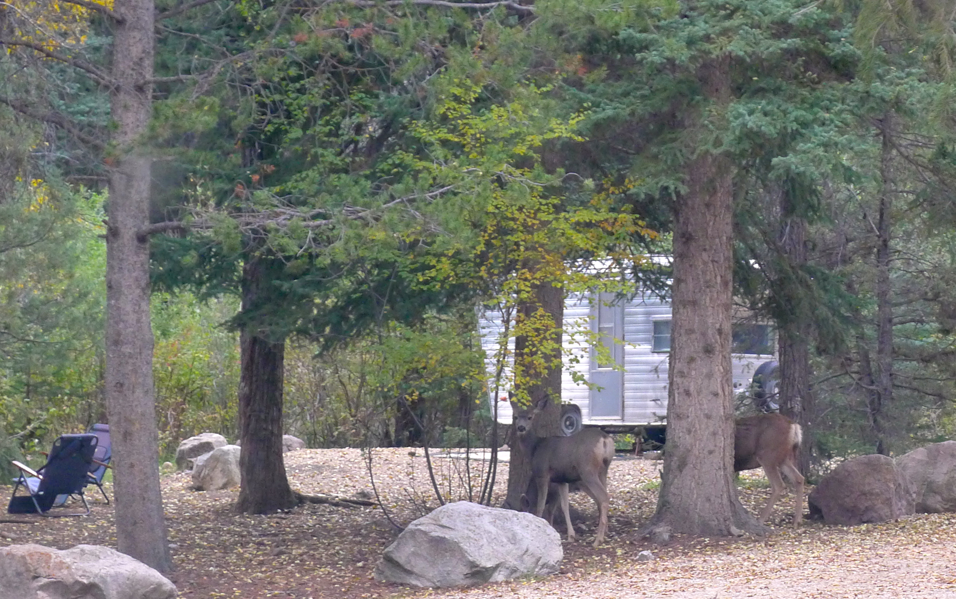 By the time we headed down the hill, meeting horses and a dog named Slim Shady along the way, the afternoon sunlight made the aspens truly glow. Back at camp, we were greeted by a family of deer who had already begun their happy hour.
