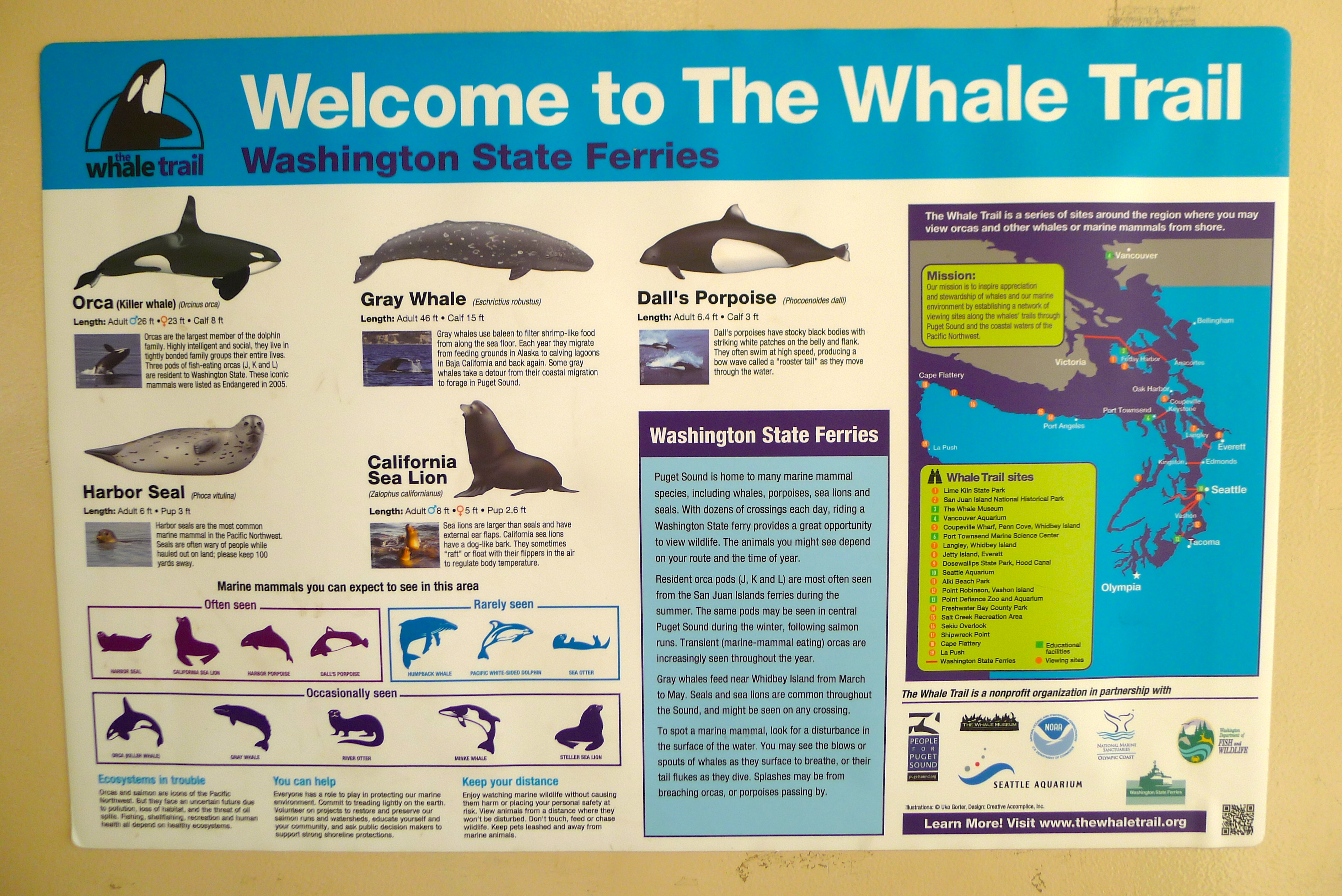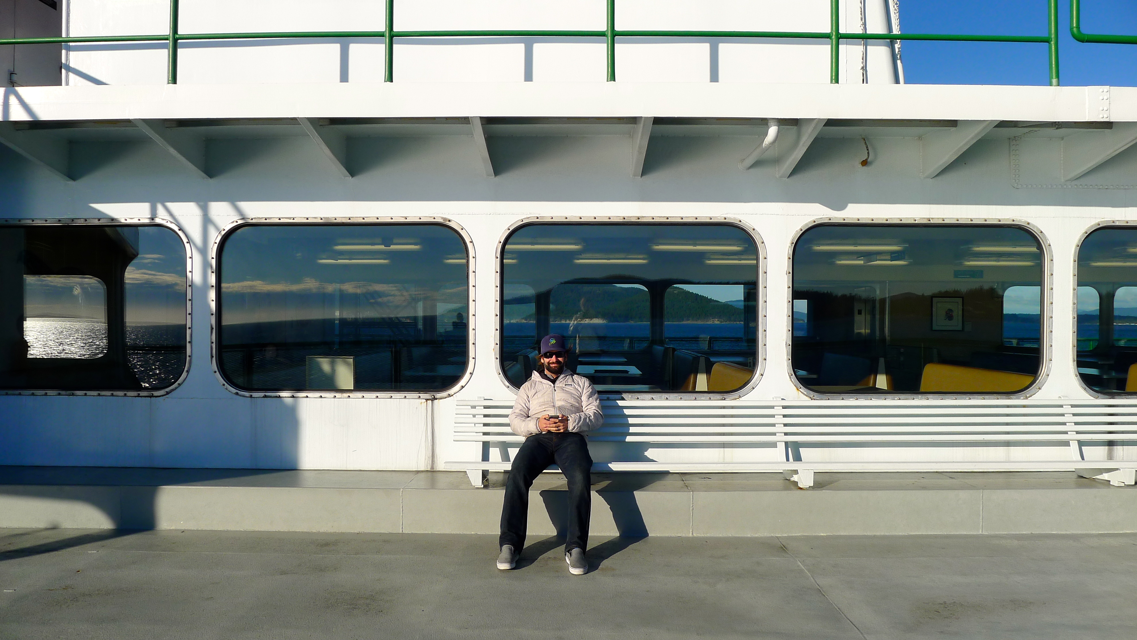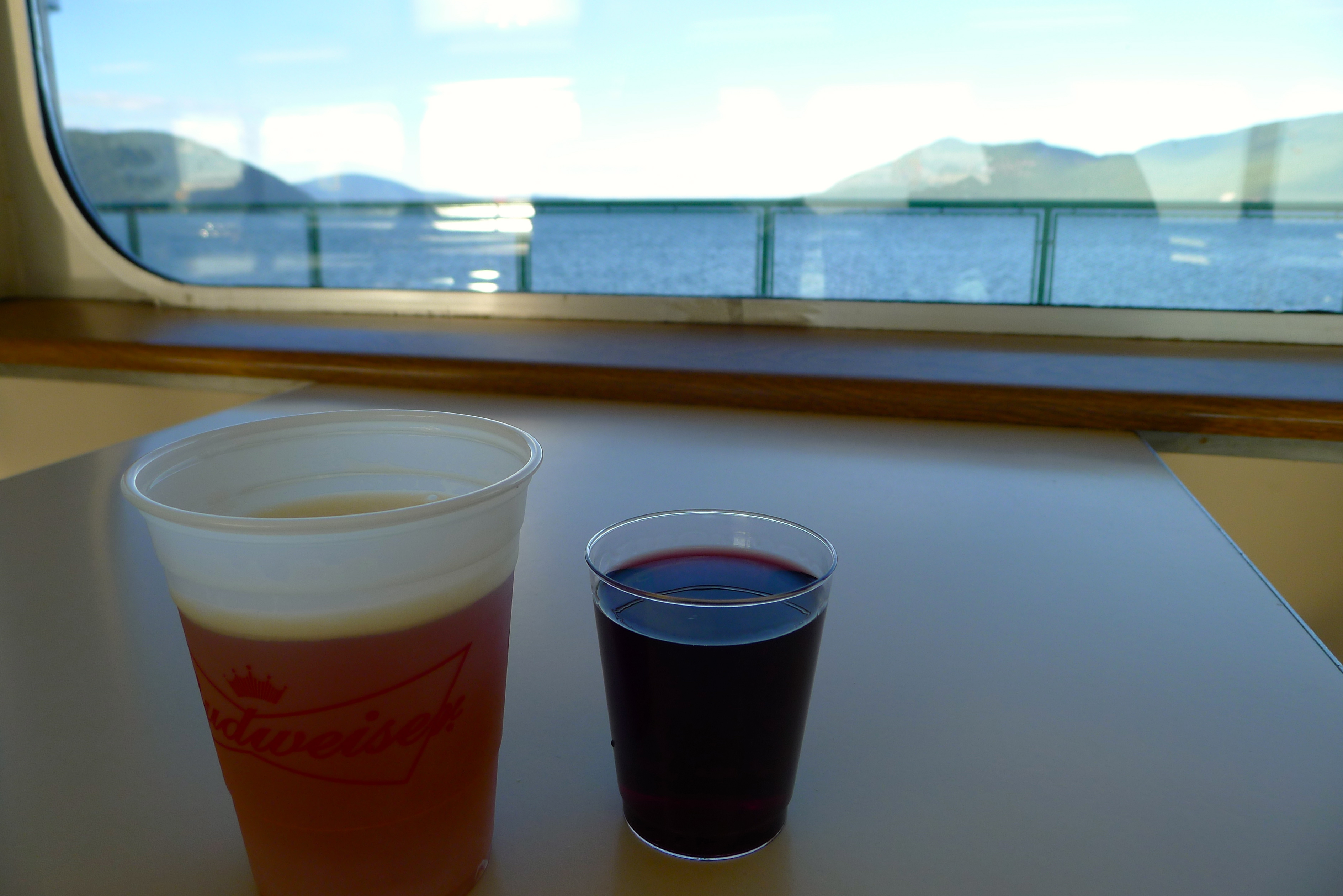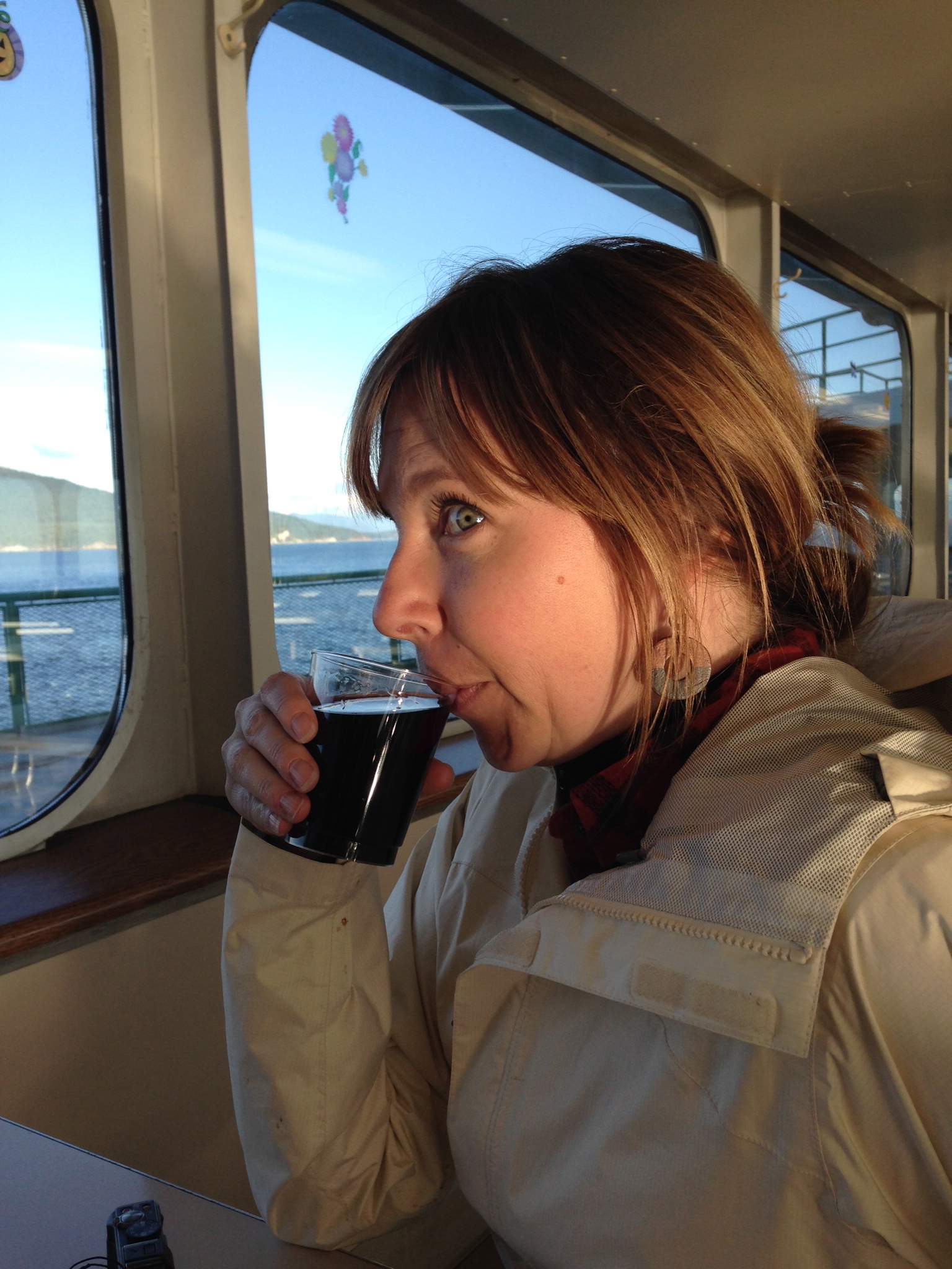 I’d never been on a big ferry like this, one where you drive your car onto it and leave it below deck. I’m fascinated by the island lifestyle that involves a ferry ride to get home. It’s an hour of forced downtime, with gorgeous views on every side. Some people (the regulars) peeled through stacks of mail or set up shop in a corner with a ball of yarn and knitting needles. John and I soaked in the sunshine on deck before escaping the brisk wind with cheap beer and wine inside. The whale watch had begun.