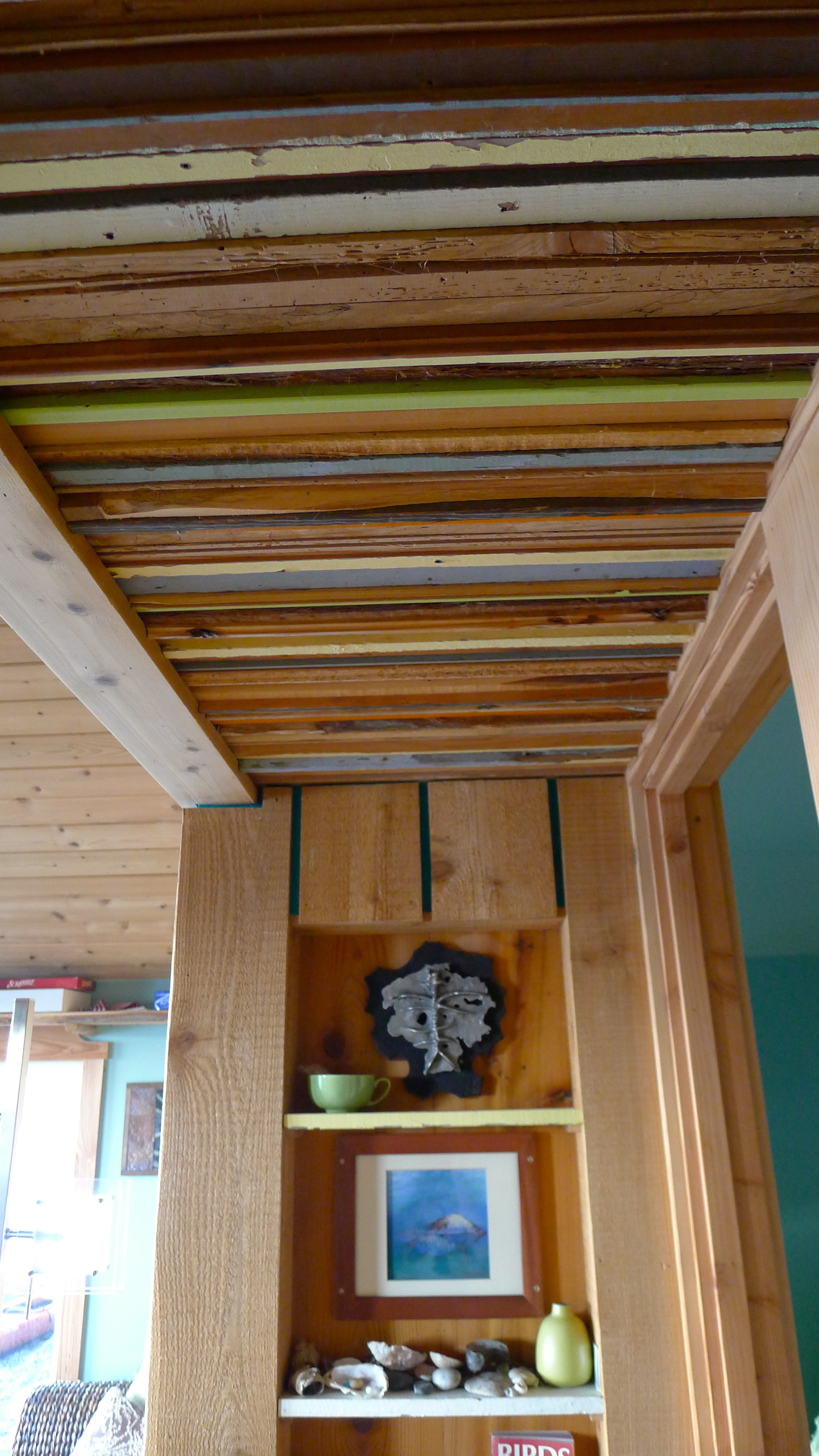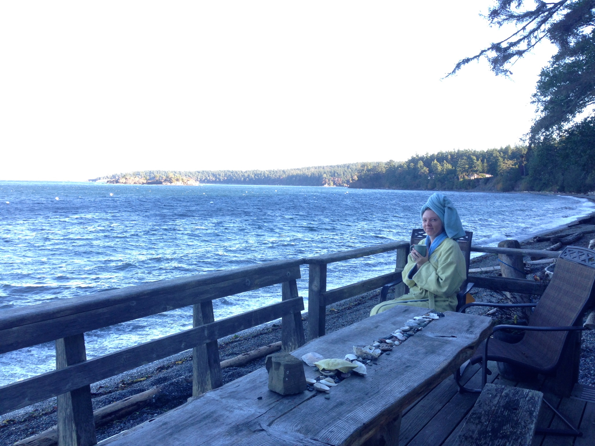 We listened to the wind and the waves all night, tucked into our warm bed. Morning light revealed more of the rustic details of this enchanting cottage, like the salvaged doors and the rainbow ceiling. Despite the chill, I sipped my coffee on the deck, listening to the waves and desperately searching for whales. John worked his magic in the tiny kitchen before we headed out to explore.