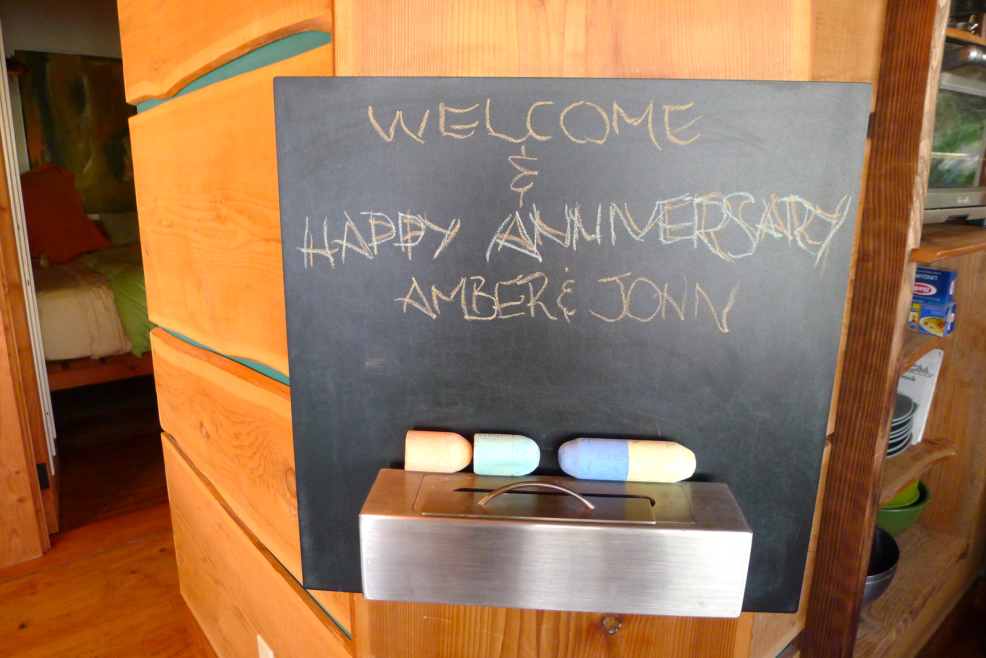Mike left us a thoughtful welcome note on the chalkboard, a bottle of wine, and a bowl full of s’mores fixings before wishing us a happy visit. Before the sun set in fluorescent pink fashion, we popped over to the market for happy hour snacks and clinked glasses to the boathouse. It was October 27, our actual anniversary.