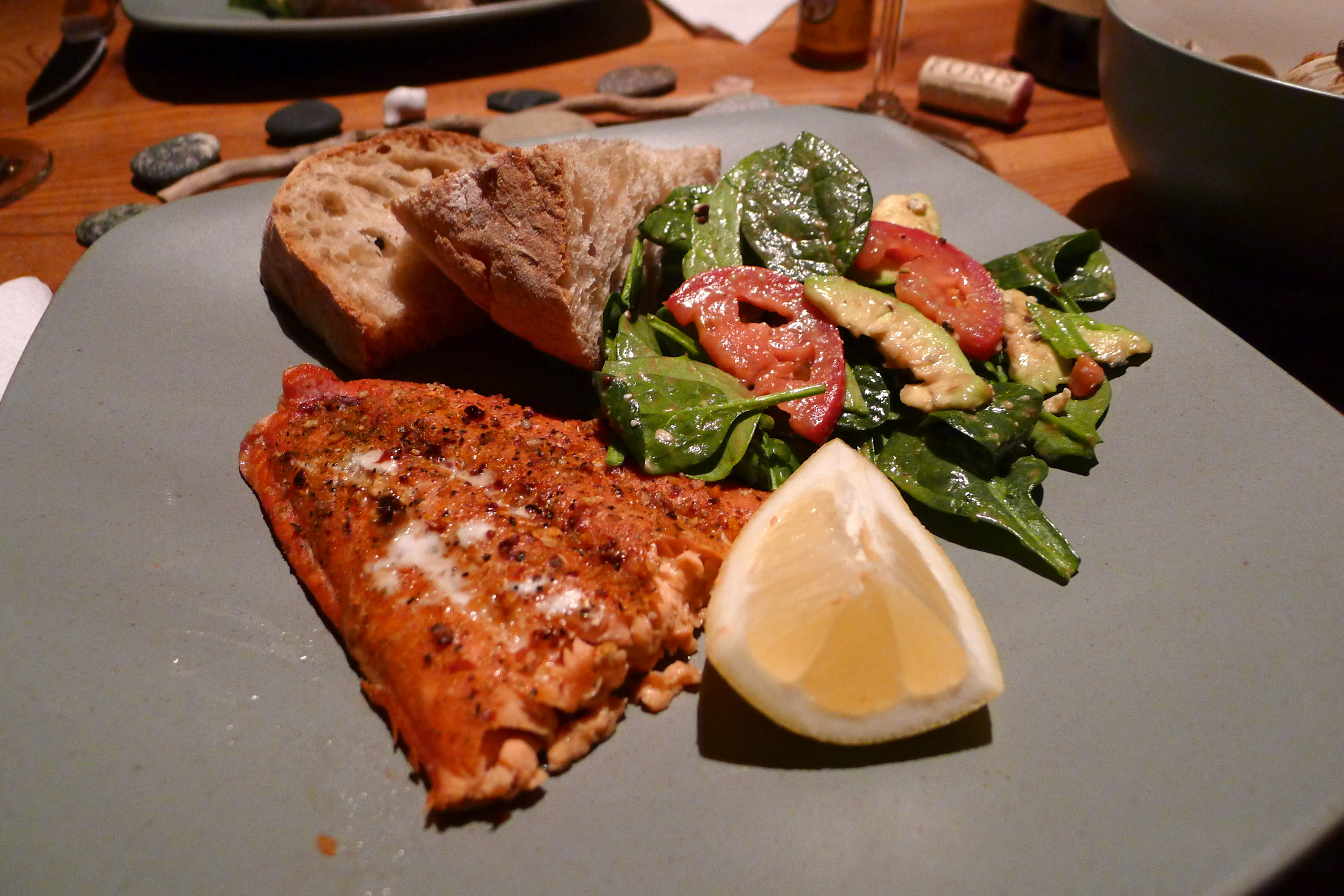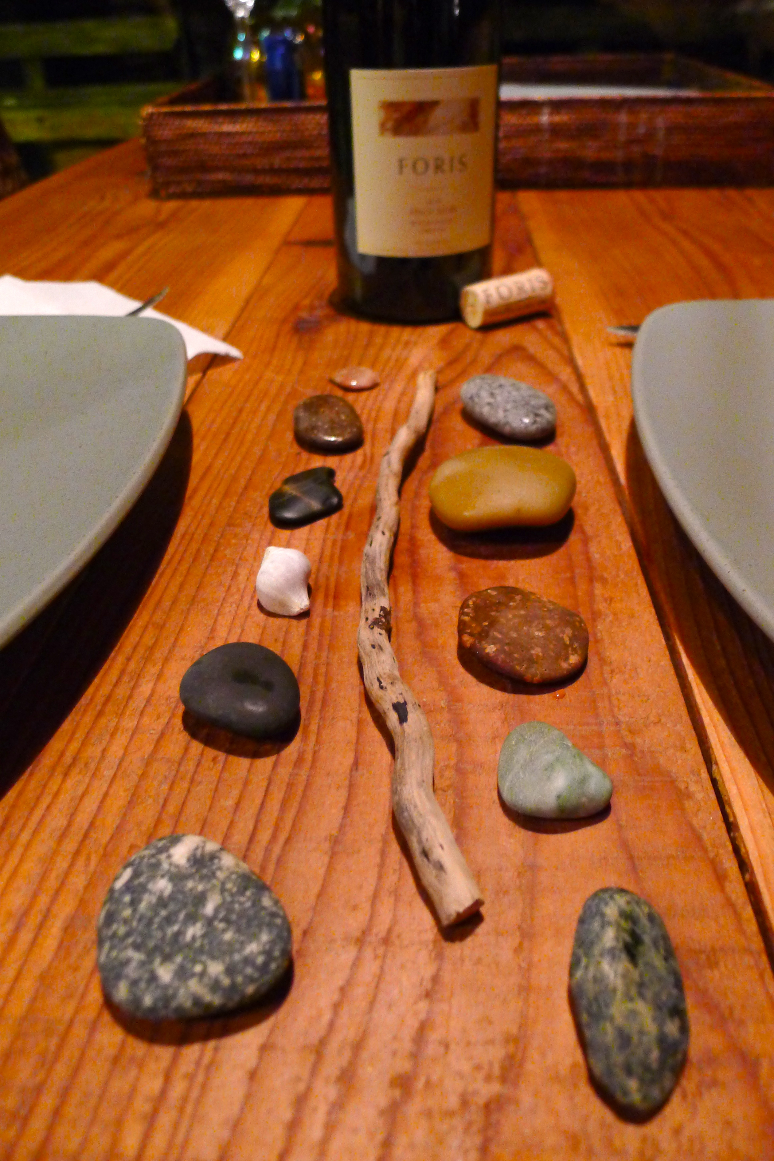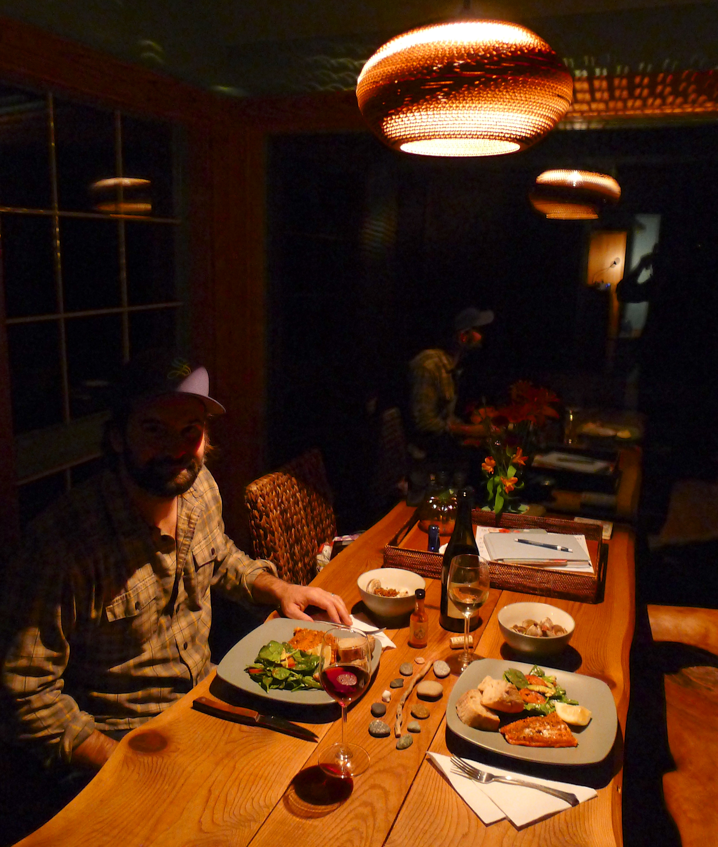 We had a vision for our last supper on Orcas Island: using the smoker to prepare a pile of fresh seafood, a big green salad, and crusty bread. We made a stop at the market for supplies and made it back to the boathouse in time for happy hour and another glorious sunset. John started on the clams and salmon while I drew on the chalkboard, combed the beach for souvenirs, and set a beautiful table.