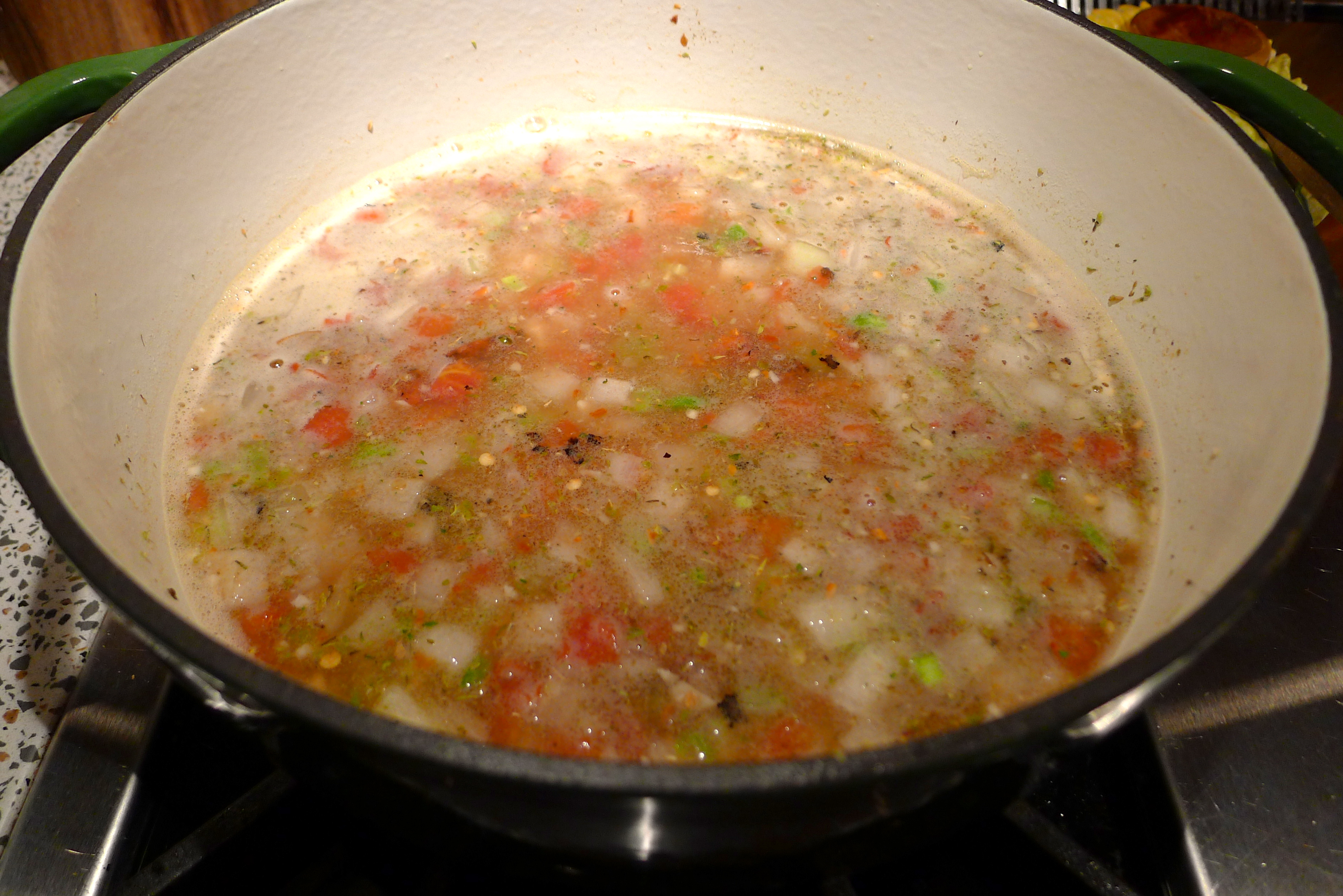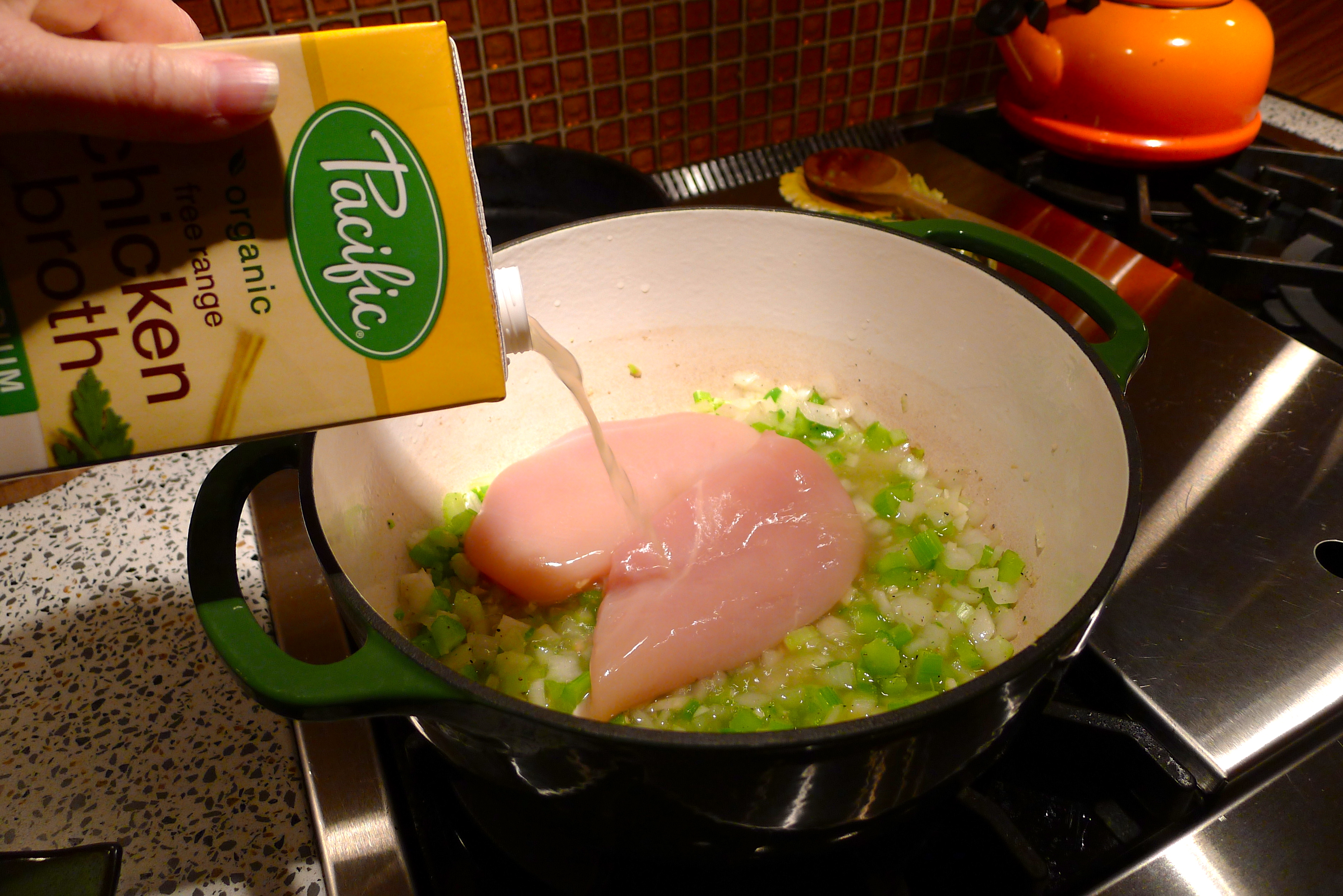 When the veggies were tender, I placed two chicken breasts in the pot and poured a container of organic chicken stock in, too. I added a can of diced tomatoes (with green chiles) and a spoonful each of cumin, oregano, and crushed red pepper. I gave it a stir and let it come to a boil.