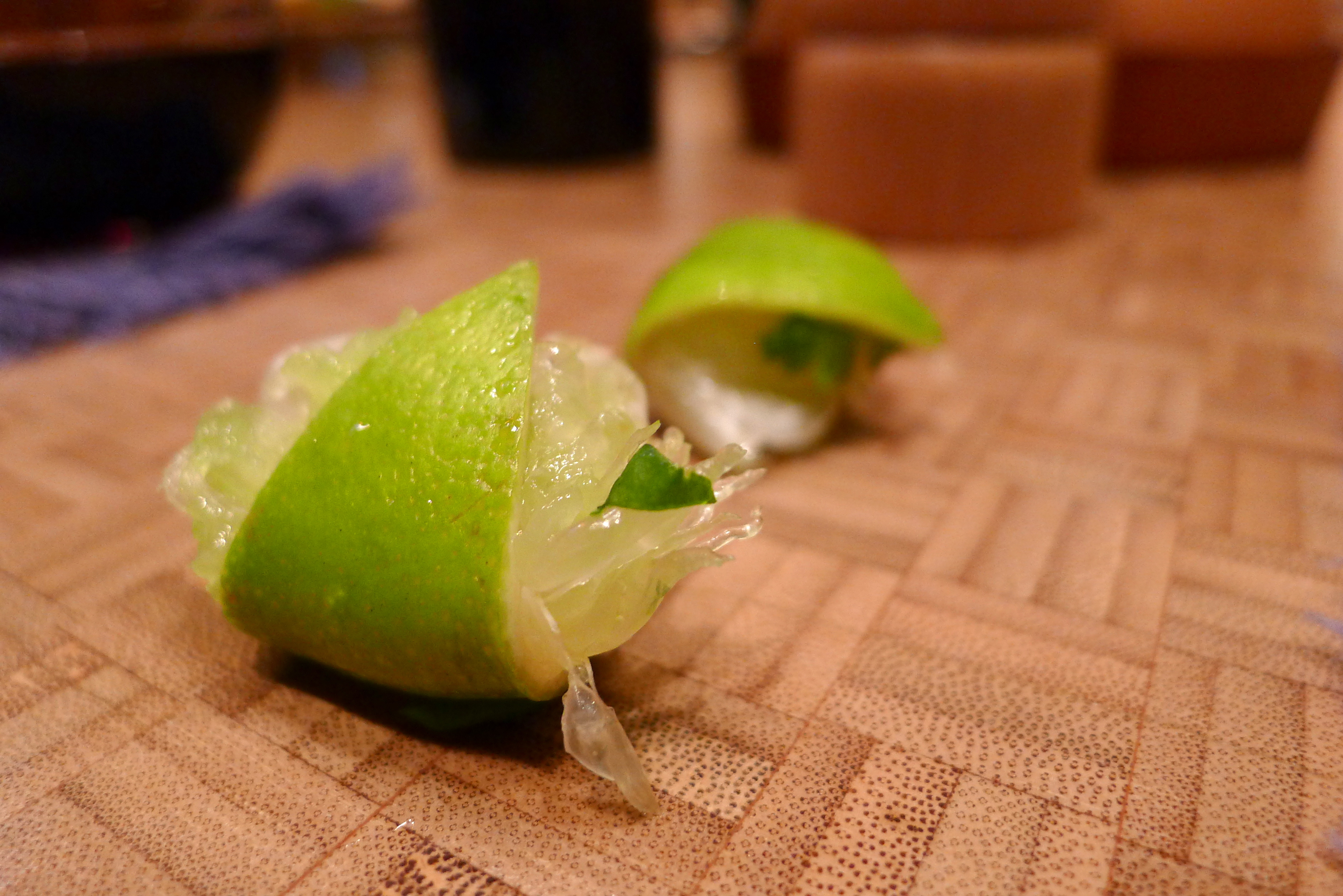 After simmering for an hour with a lid on, carefully remove the chicken breast from the pot and use two forks to shred the meat. Return the meat to the pot. Squeeze the juice of one lime into the soup. Get as much juice as possible from the lime by using a spoon to scrape the inside of the lime.