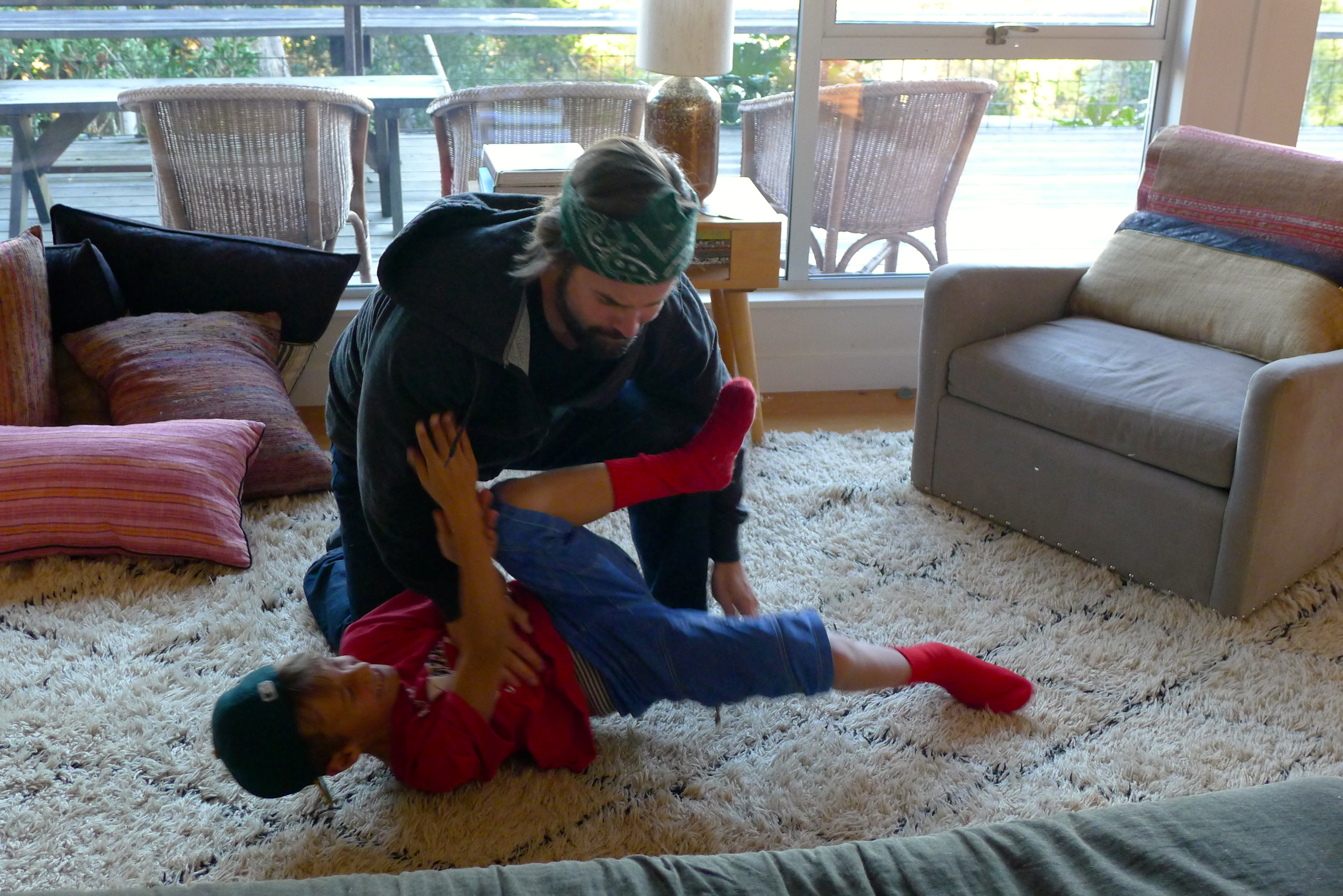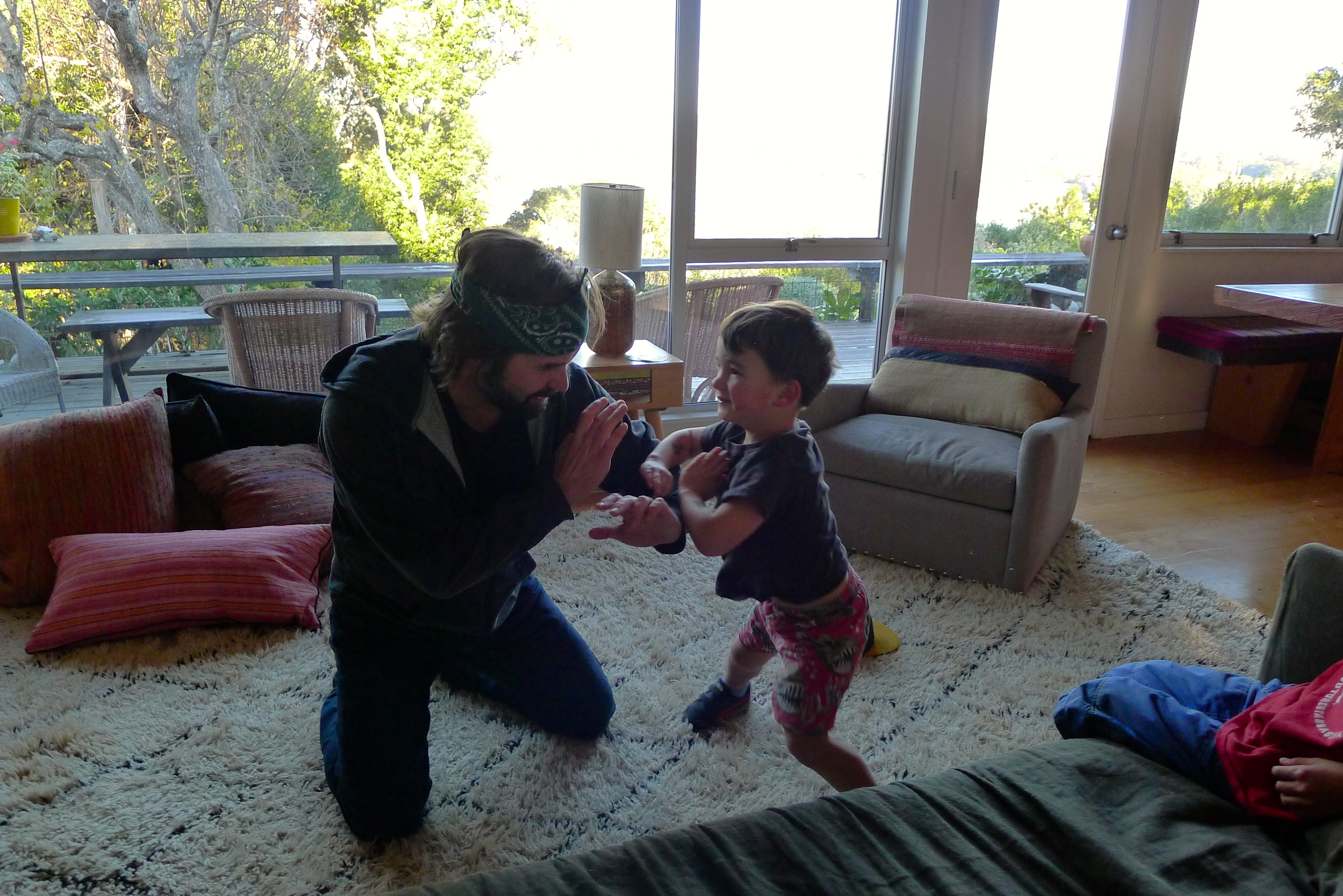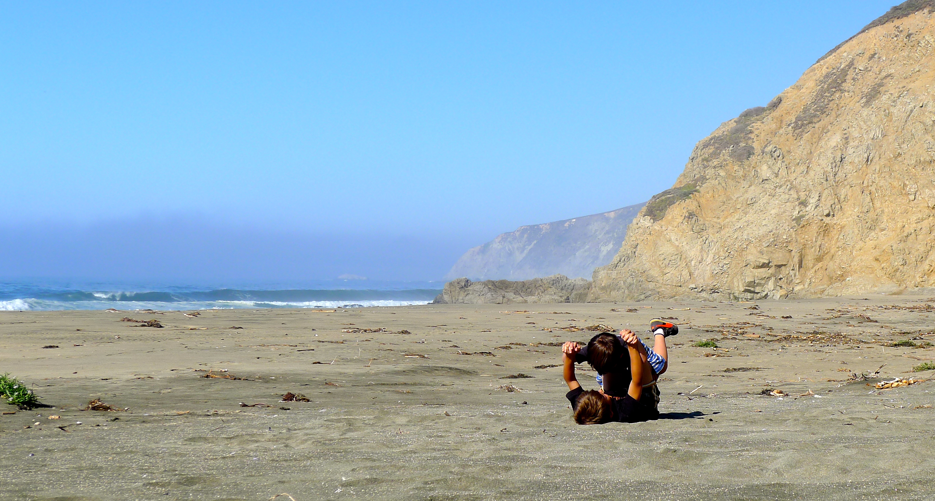 Sunday morning was slightly tainted by the knowledge that we were leaving. We went to the beach in Bolinas, getting our last ocean fix before meeting more friends at the Coast Café for lunch. We made it home with just enough time for what Ozzie and Huck considered the MAIN EVENT: individual wrestling matches with Johnny (aka the Hairy Ninja). Johnny/Ozzie matches are a tradition every time we visit, but this year, Huck would have his own battle. Amazing moves!