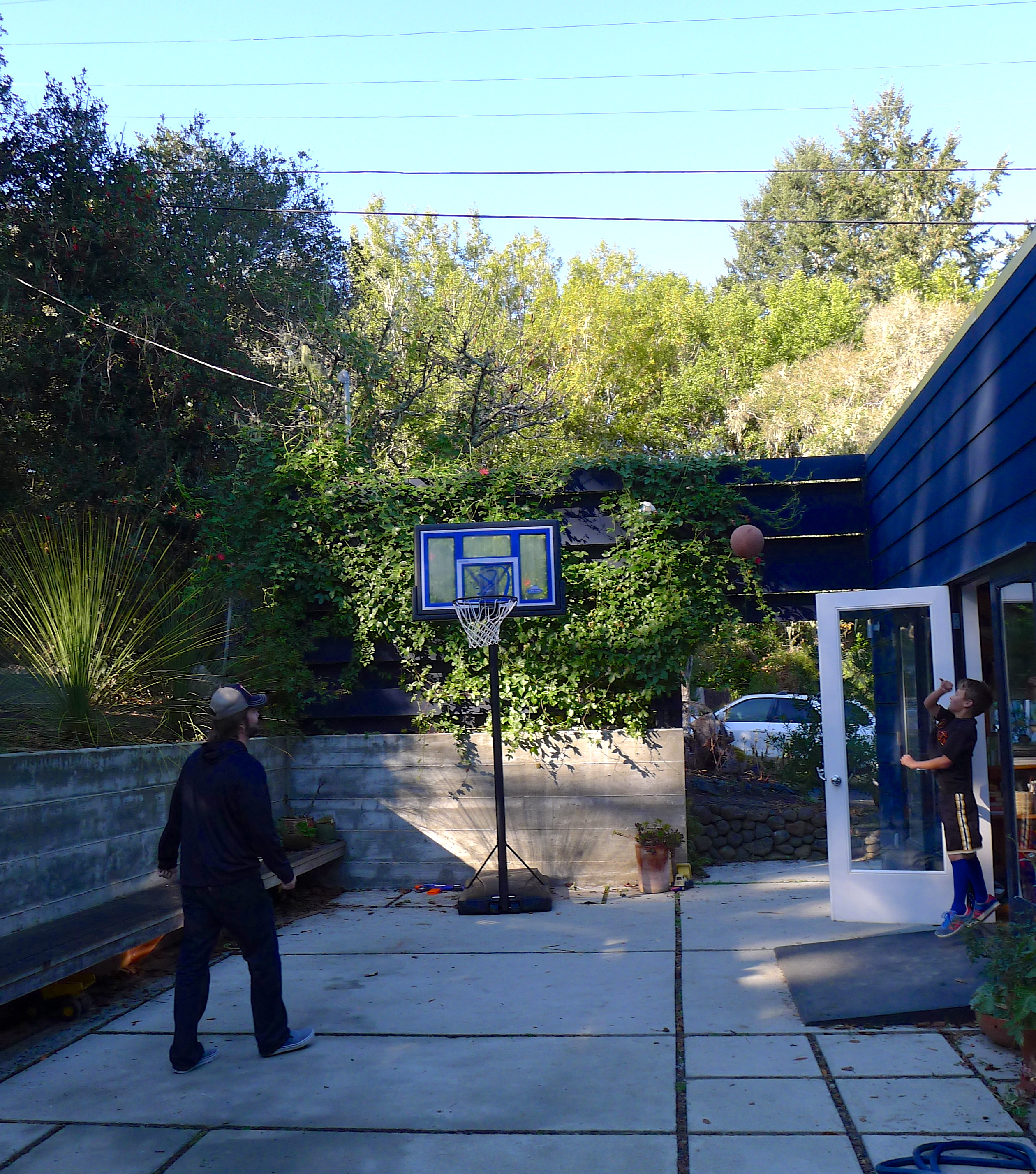 Whit’s wife, Lazuli, and their awesome older boy, Ozzie, were waiting for us at the house. Over the years, Ozzie has become infatuated with John, glued to his side and working hard to imitate and impress him. The basketball hoop certainly wasn’t lonely this week. Another member of the household also gravitated toward John during our trip. I love how cats always choose the lap of the person who doesn’t like cats.
