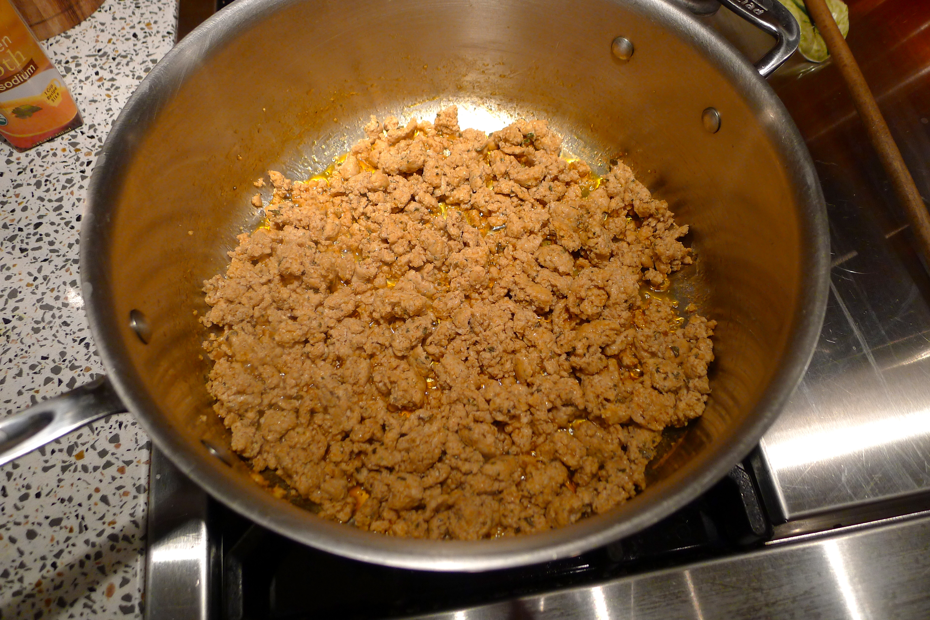 The butcher at my market ground up some pork into a spicy chorizo for me. It was spicy enough that the crushed red pepper in the photo never made it into the pasta! I started by browning the sausage in a pan while I introduced myself to the kale.