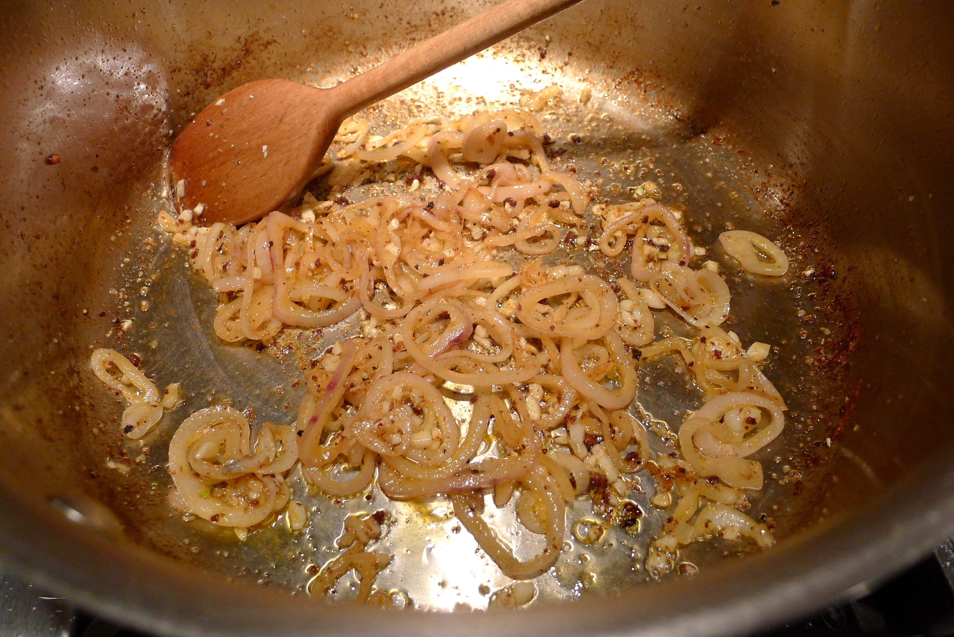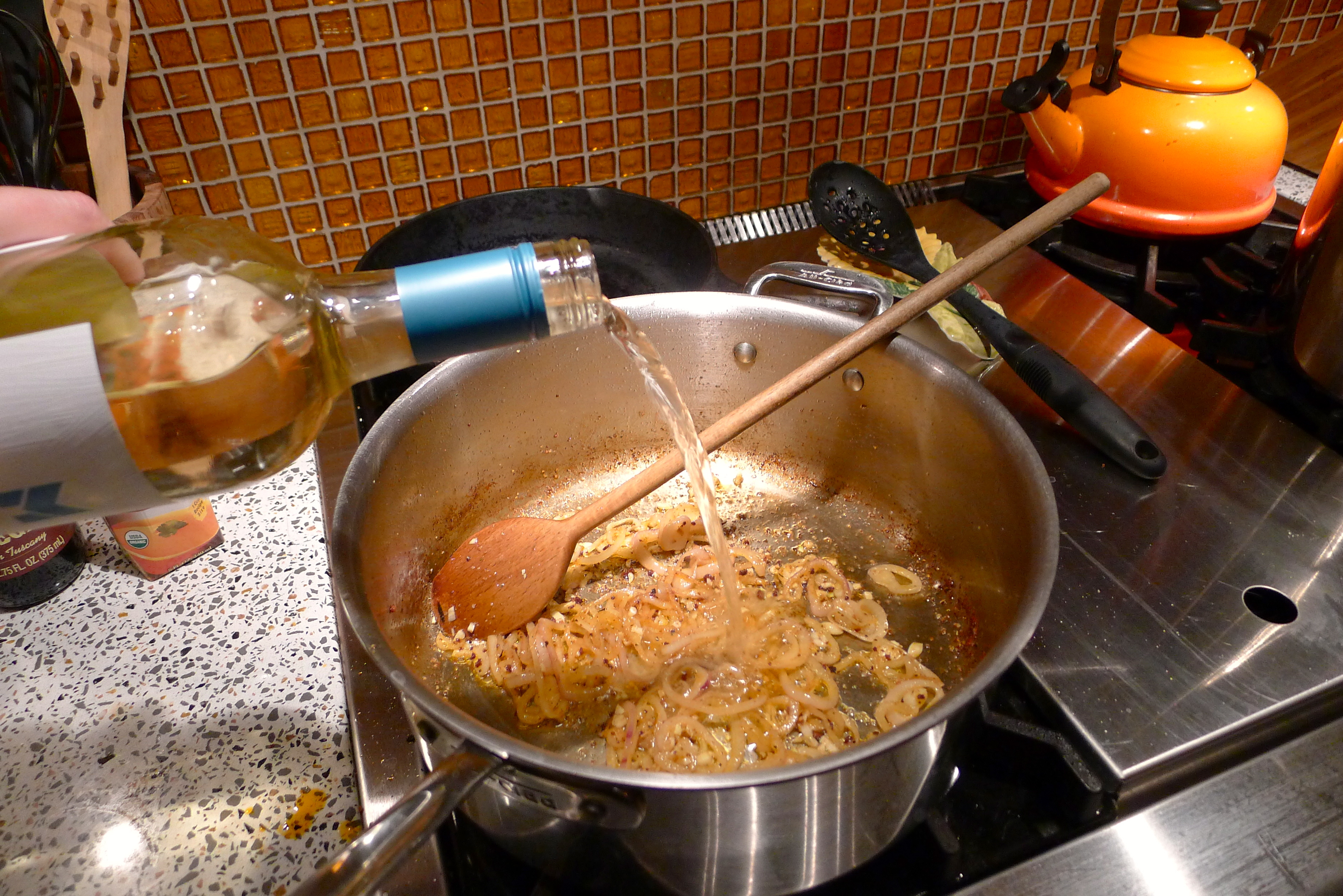 When the chorizo was browned, I removed it from the pan, swirled a bit of olive oil, and added the shallot and garlic. After a few minutes, I poured in some white wine to deglaze the pan, scraping up those browned yummy bits on the bottom of the pan. Next came some chicken stock, a little bit of red wine vinegar, and then I added the big pile of kale. I knew that, like spinach, it would wilt with the heat.