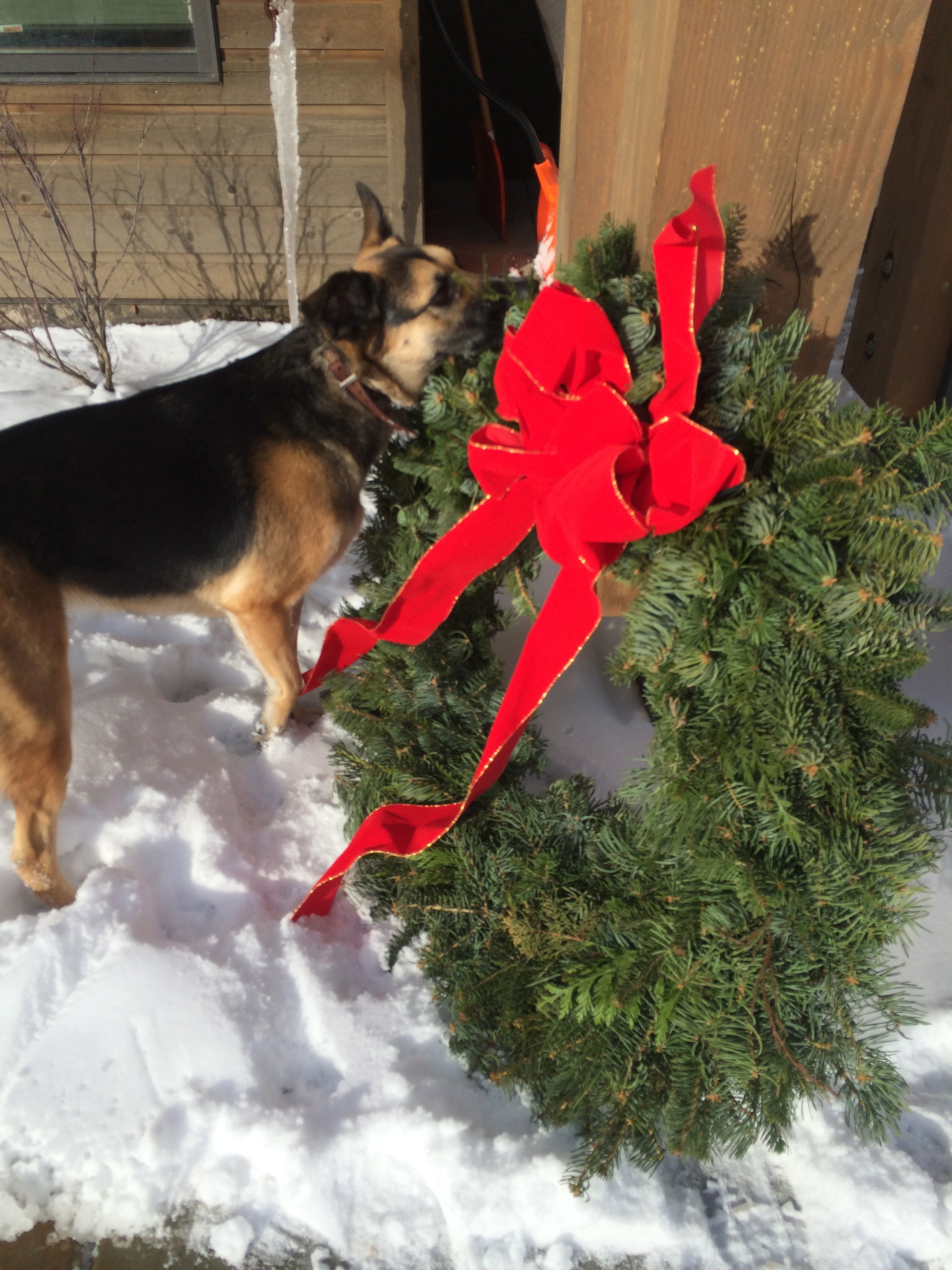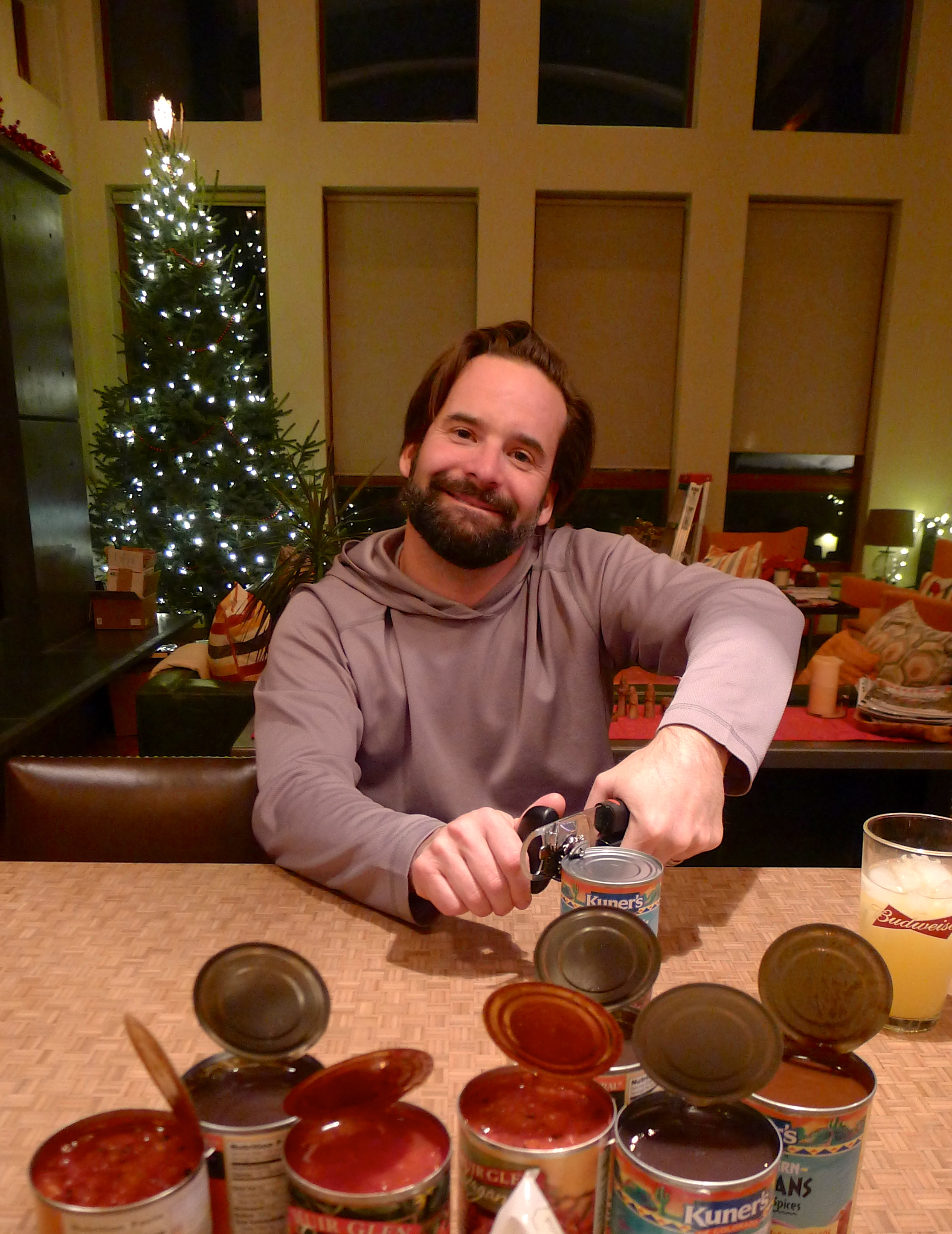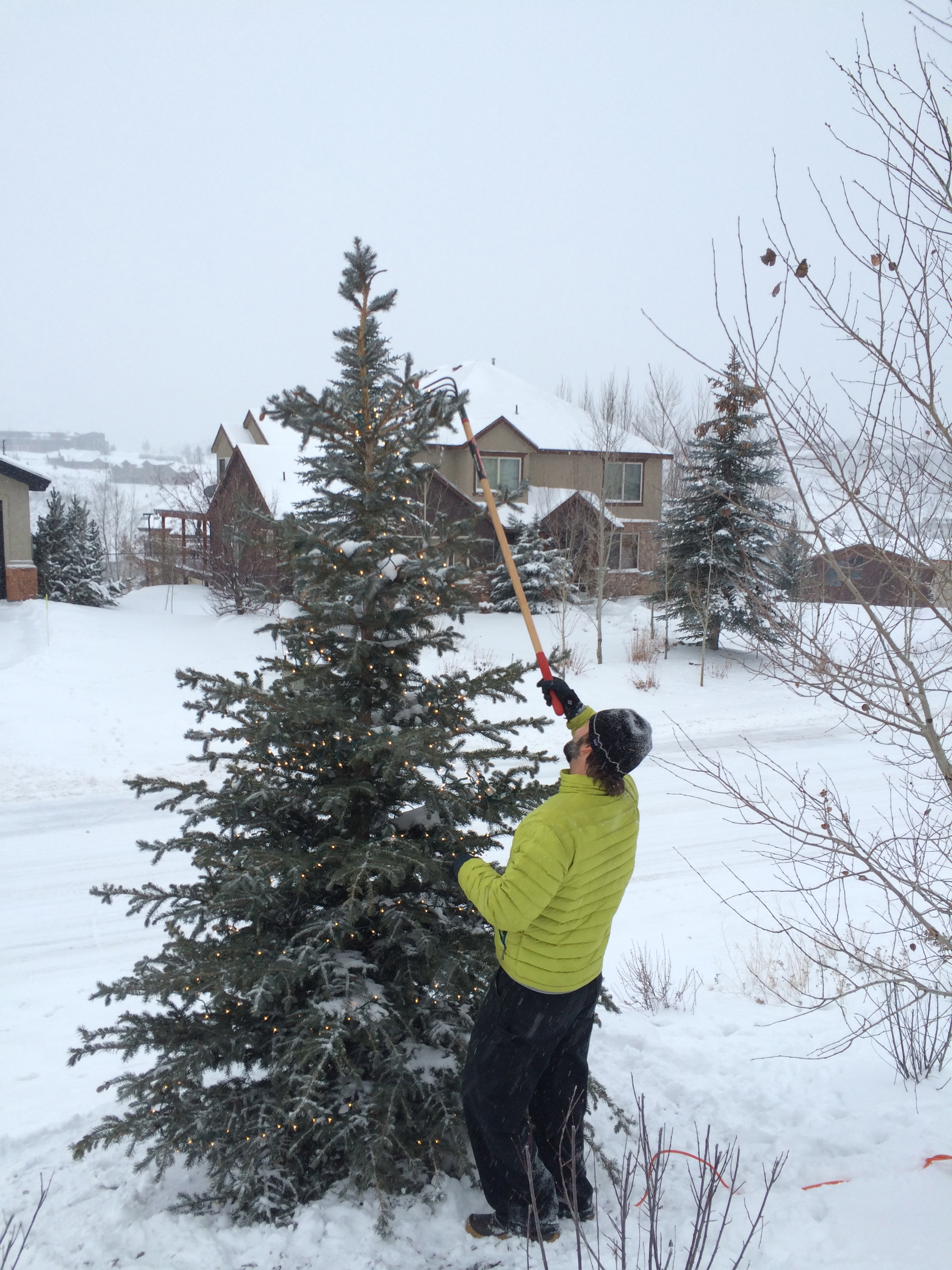 John employs his patented “hoe hook” move to decorate our tree.