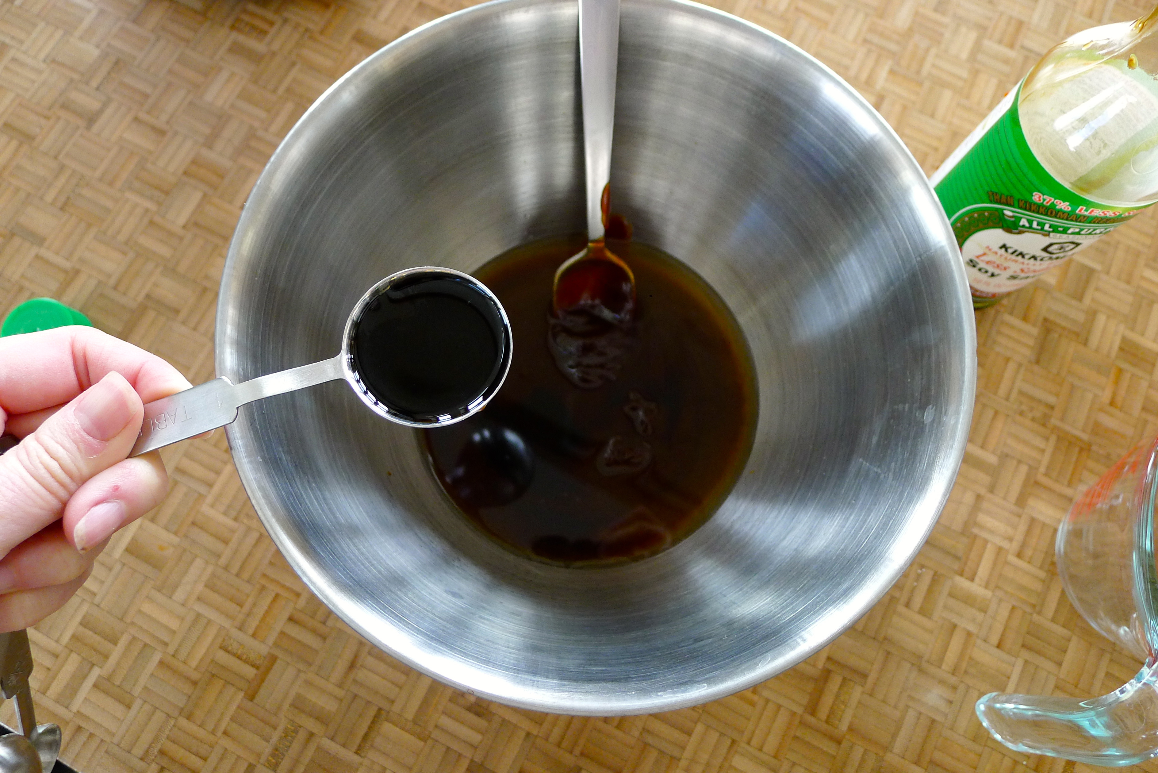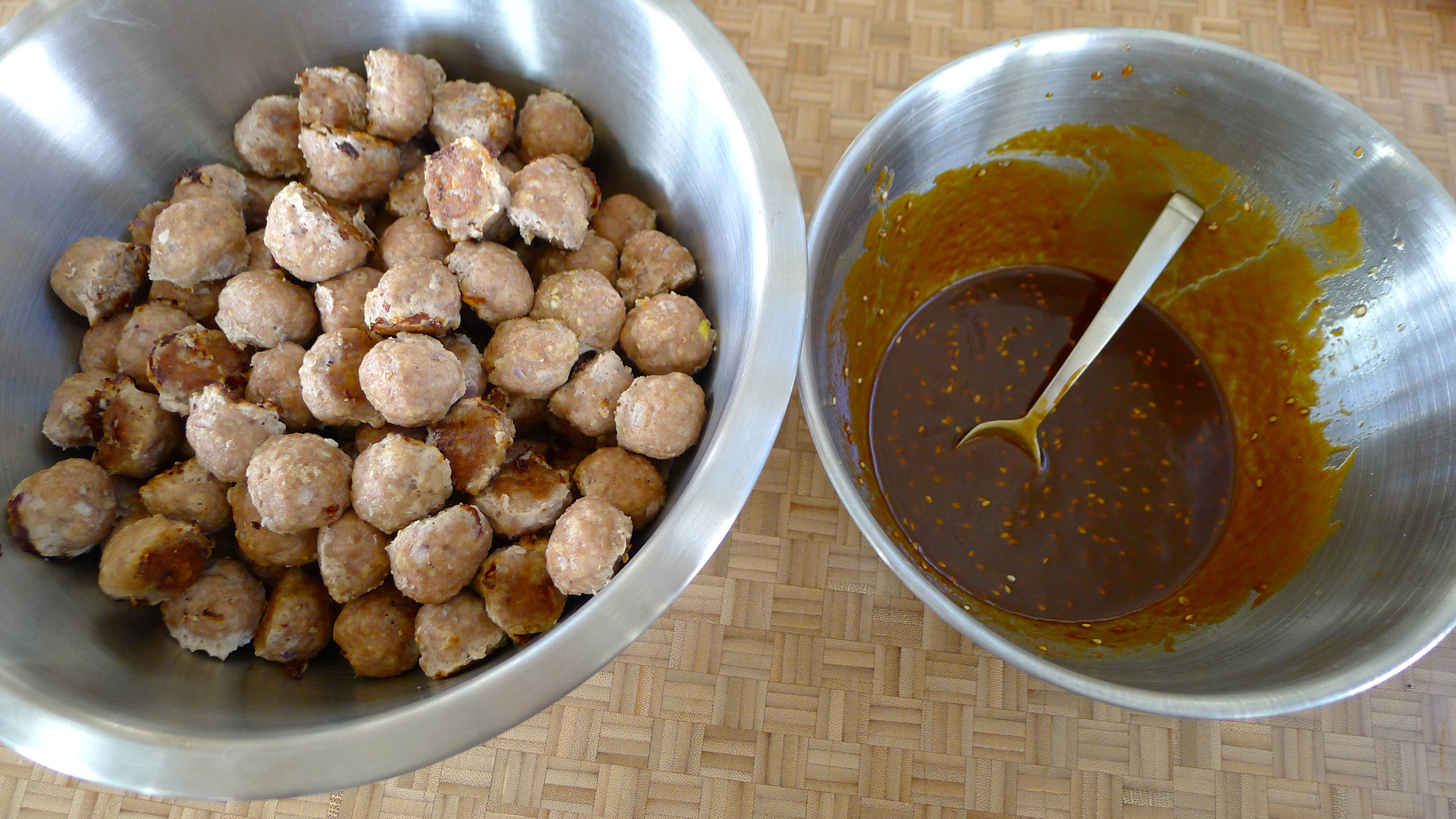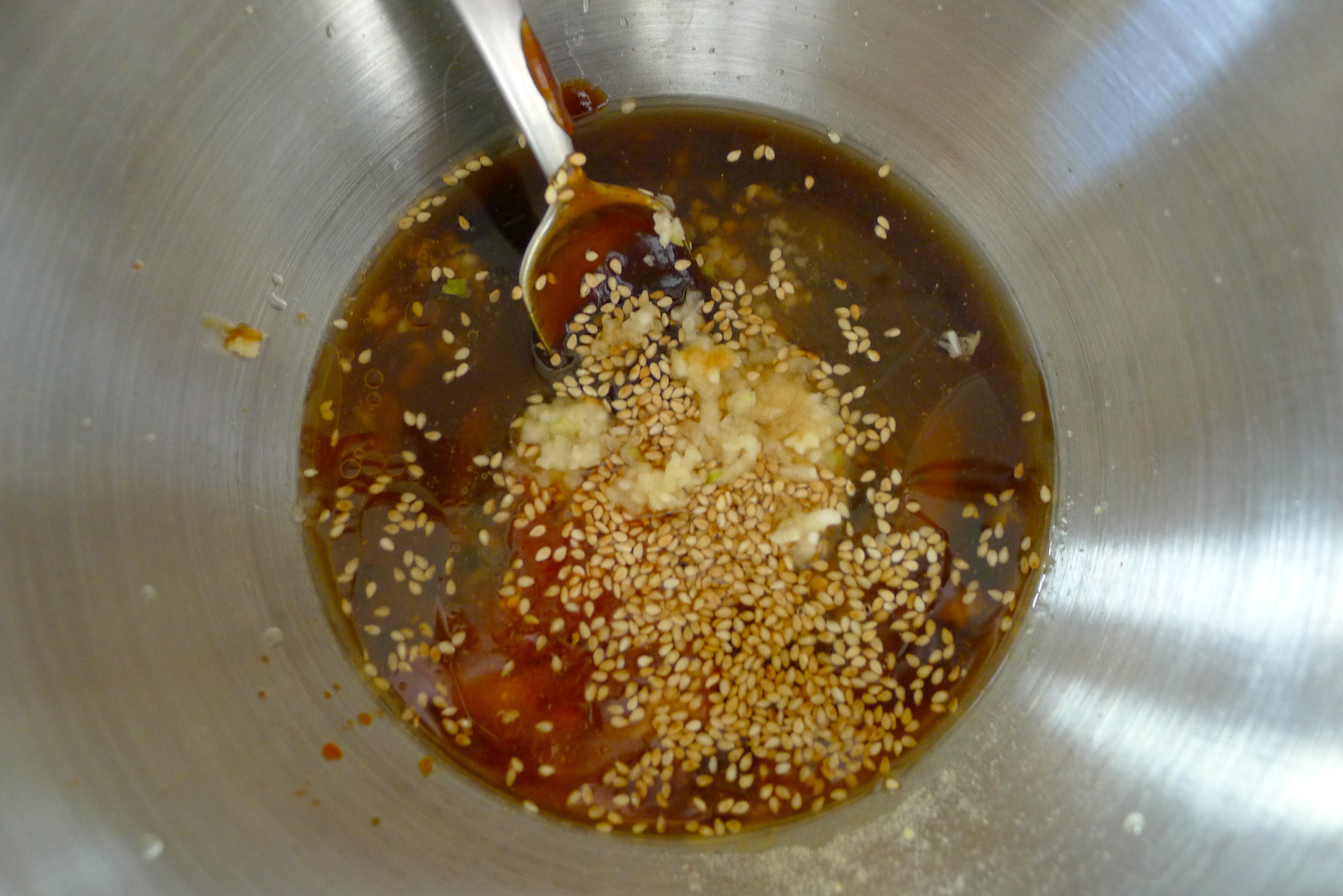 Next up: meatballs. These were a little more time-consuming to make, but everyone loved them! First, combine the ground turkey with sesame oil, ground ginger, a couple of eggs, some minced garlic and onion, Panko breadcrumbs, and sesame seeds. Roll out little one-inch meatballs and place them on a baking sheet. While they bake into golden deliciousness, start on the sauce!