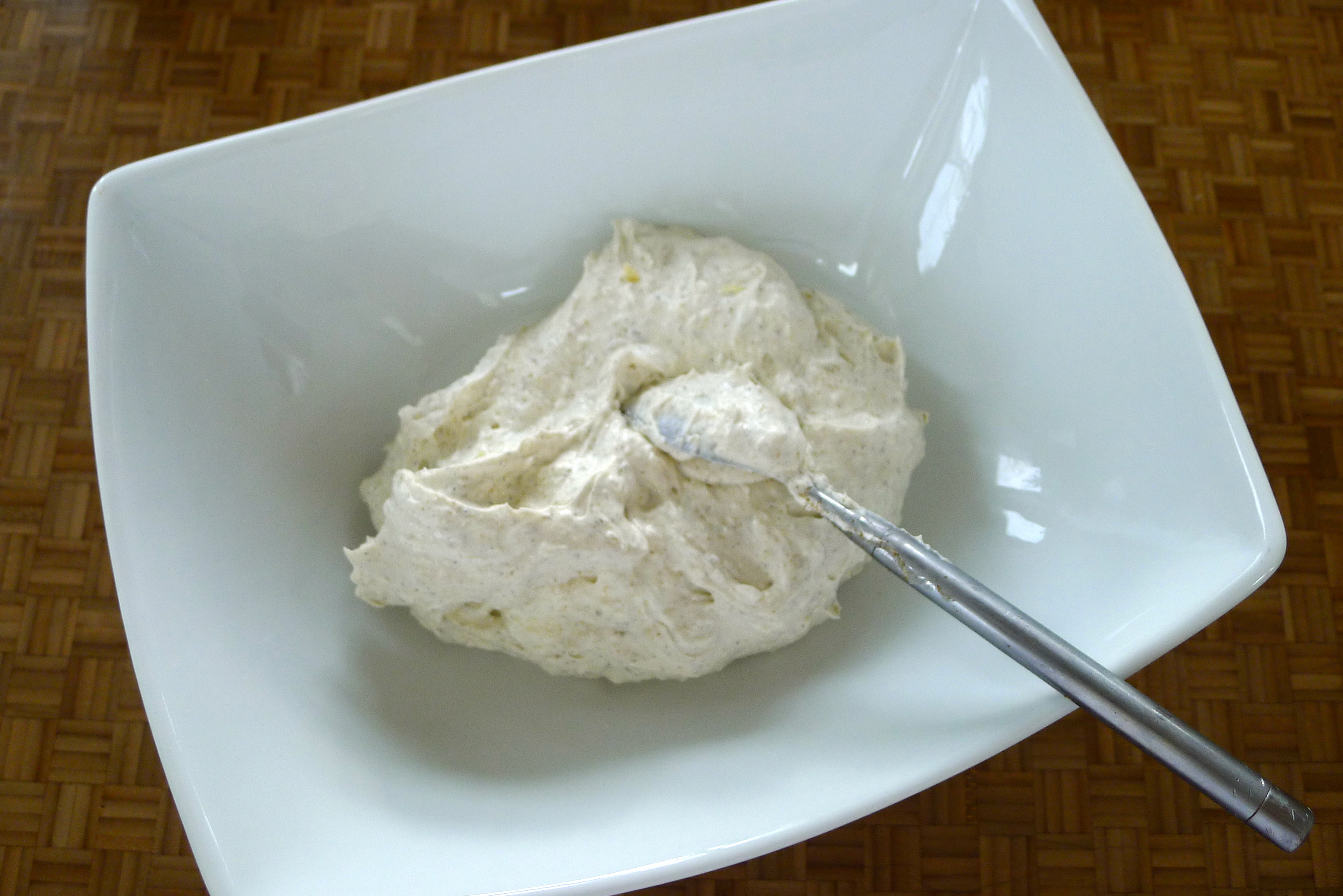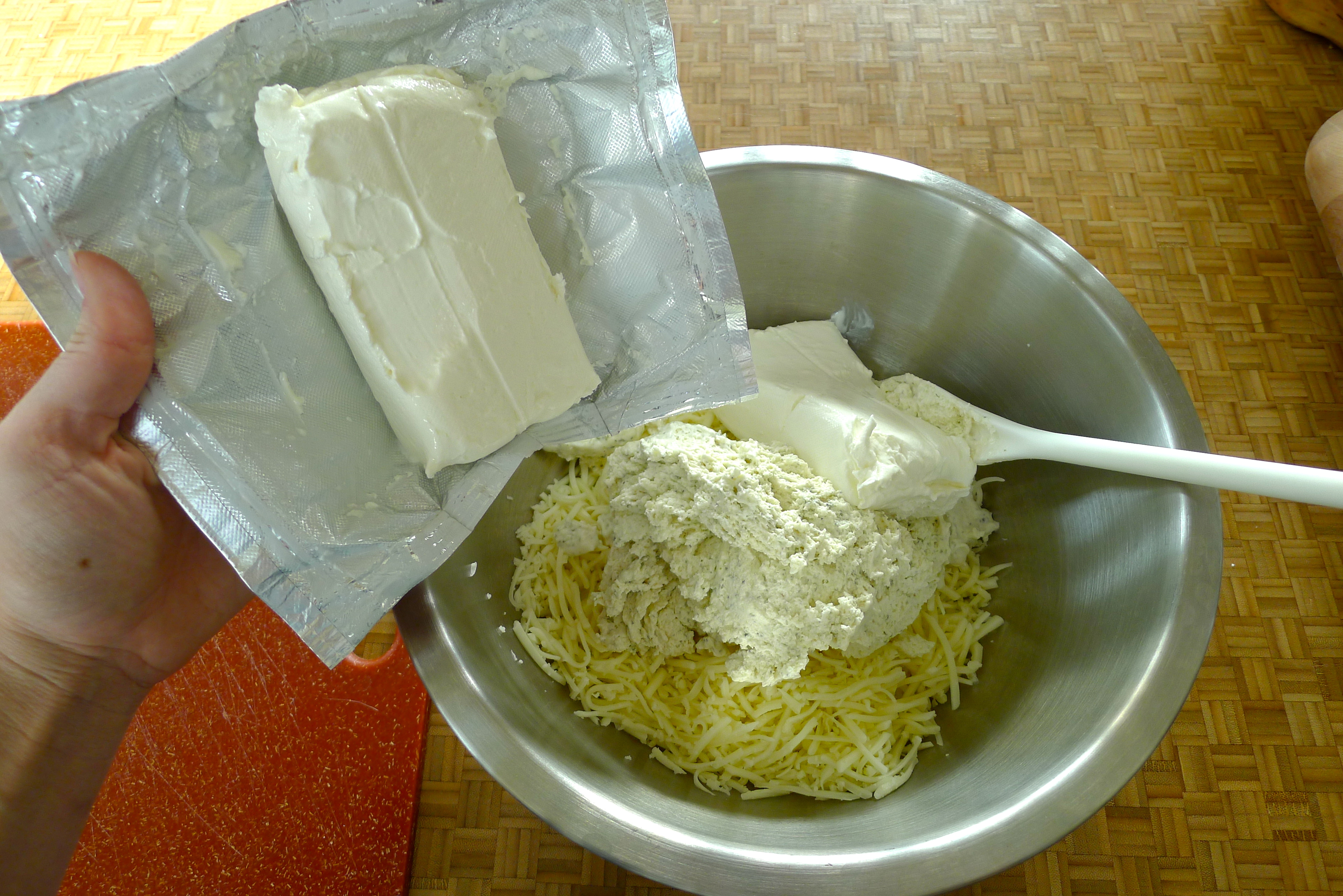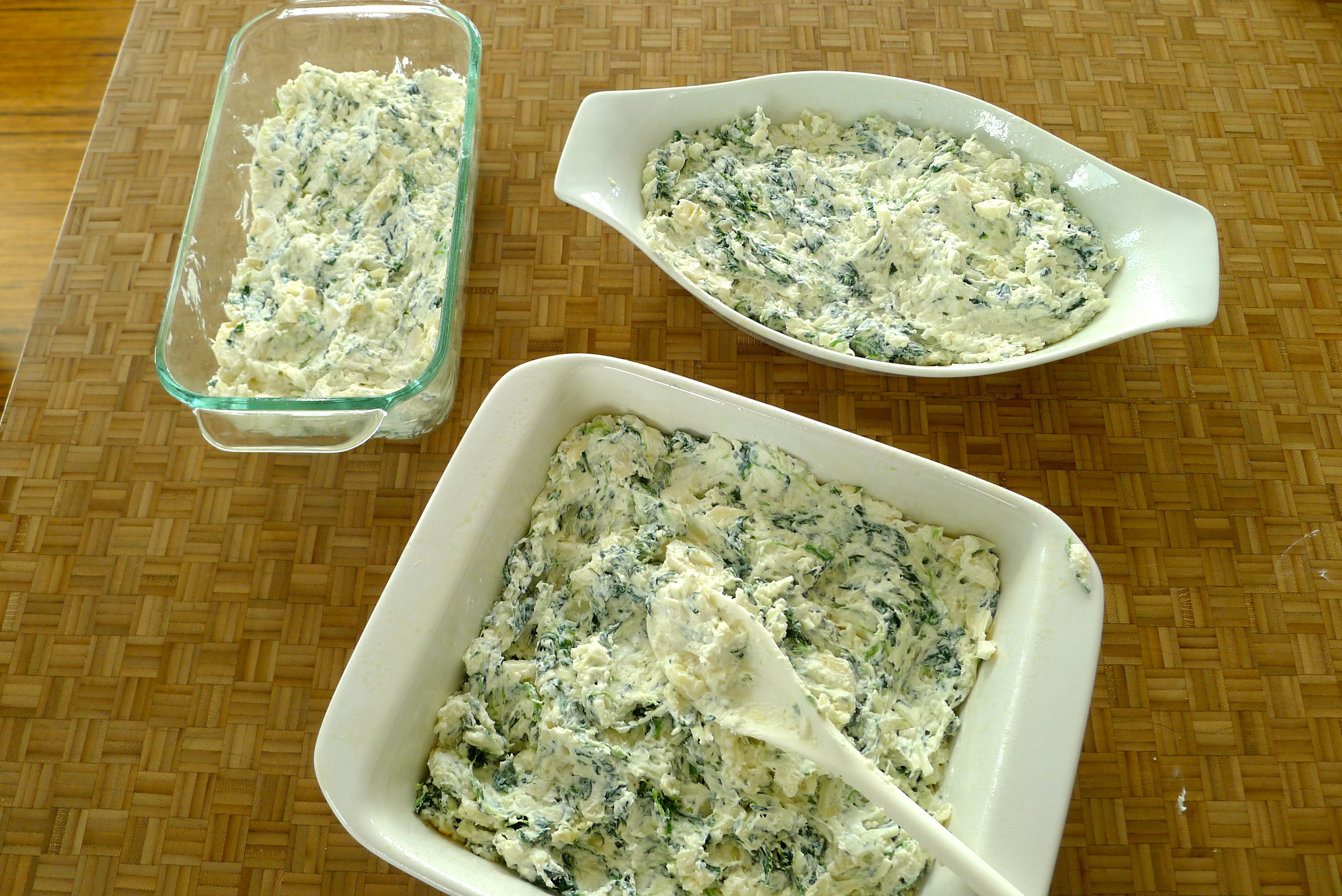 Start by thawing frozen chopped spinach. Squeeze as much moisture out of the spinach as you can. Chop up some garlic and drained hearts of palm. In a big bowl, combine shredded mozzarella and Asiago cheeses, sour cream, the garlic and hearts of palm, the spinach, fat free cream cheese, and some garlic-and-herb spreadable cheese (I use Boursin).