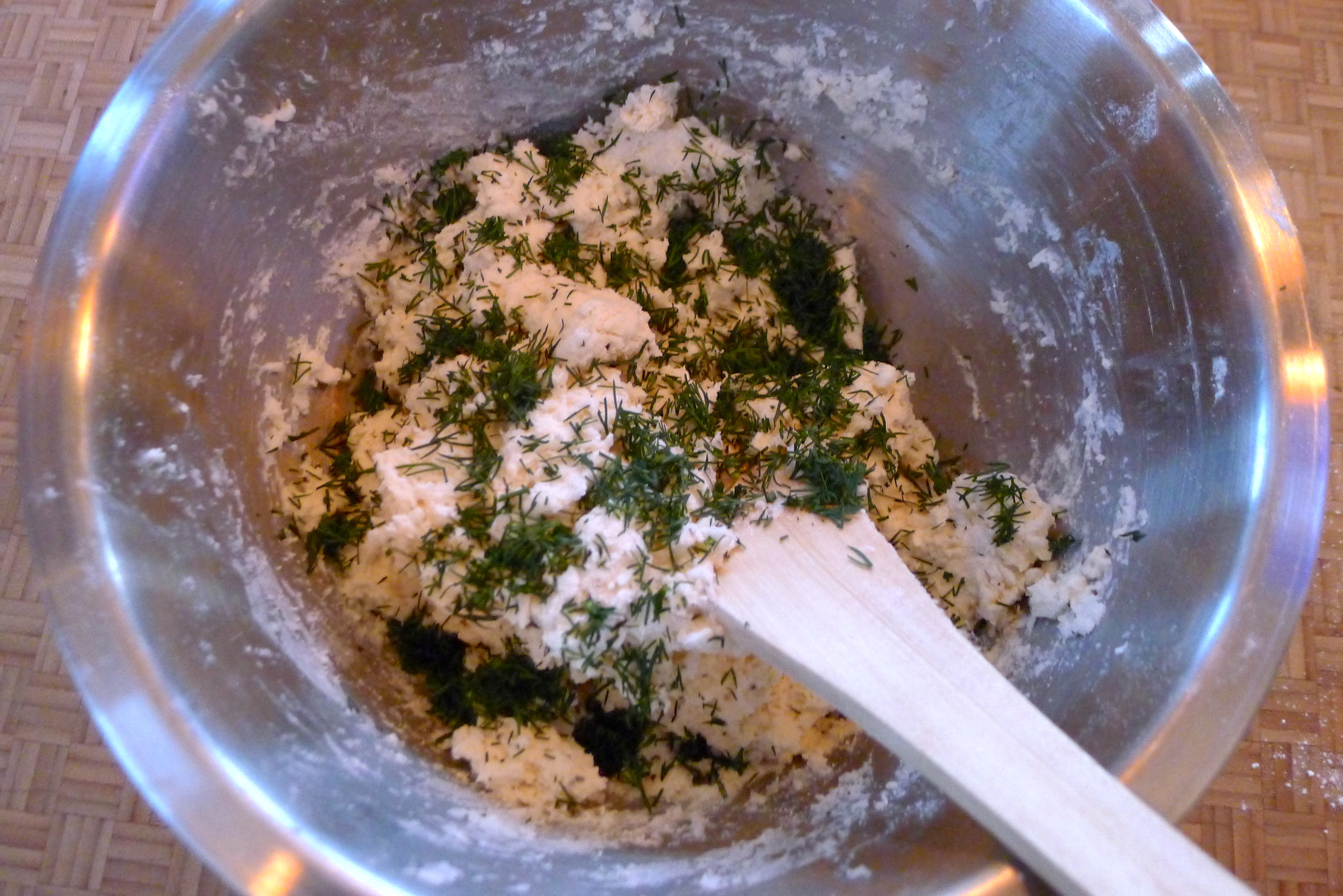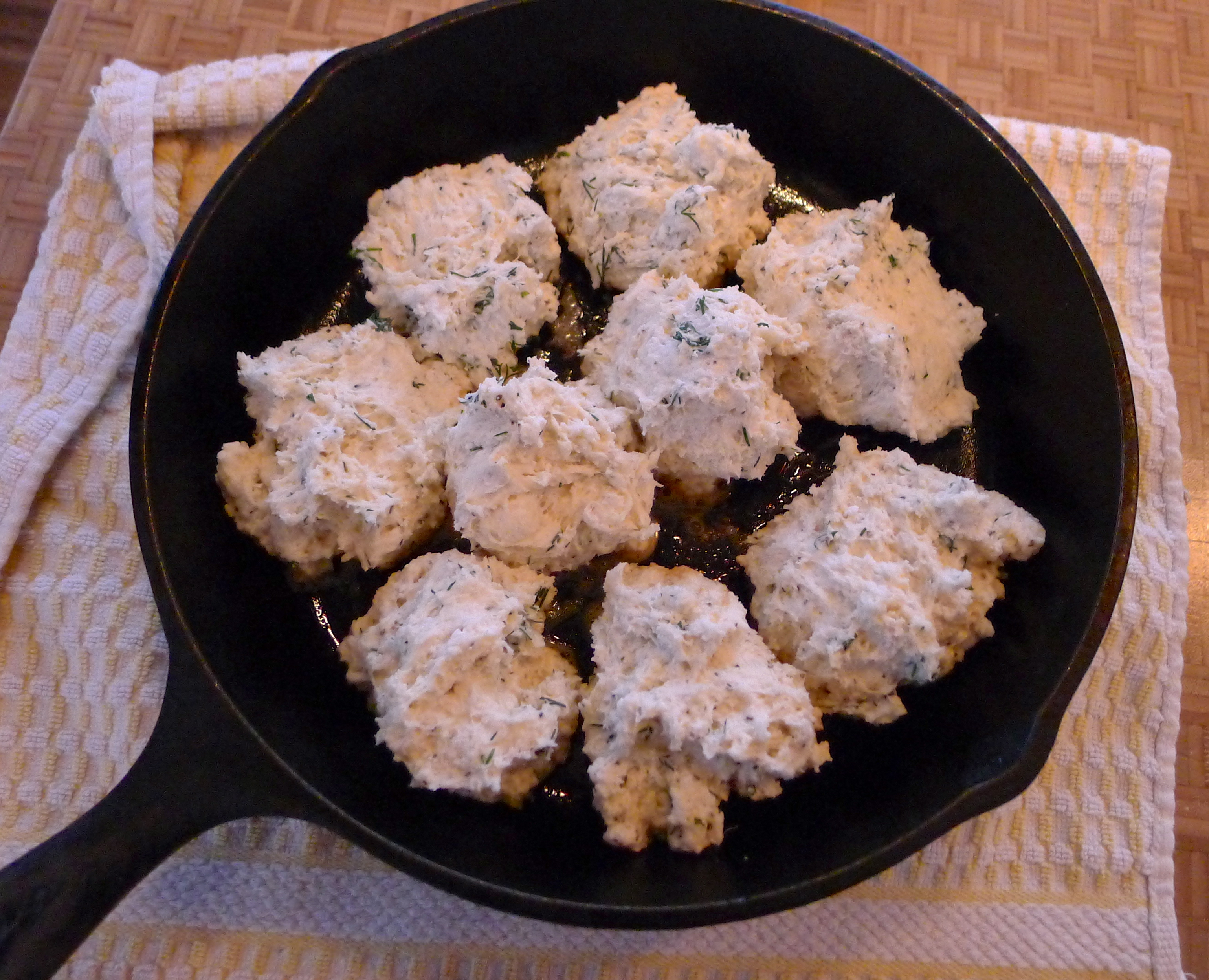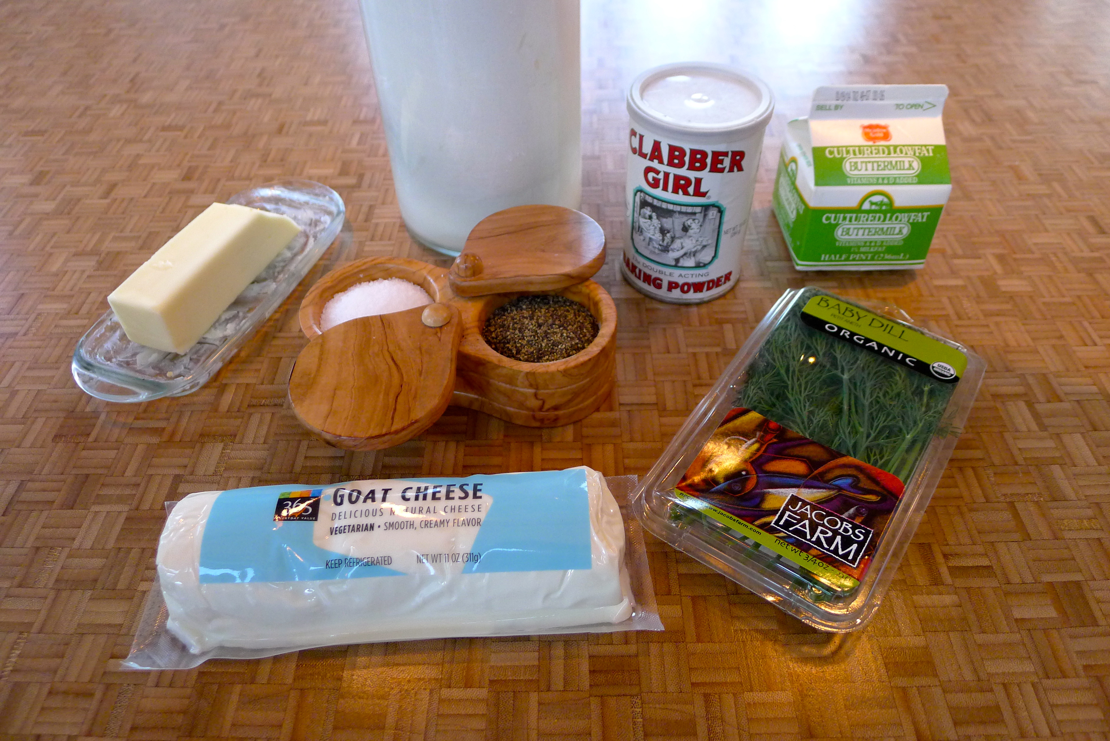 I dug a little well in the middle of the flour mixture and poured the buttermilk into it, then slowly stirred everything together. At the last minute, I decided to add plenty of fresh dill that I had in the fridge. The dough was pretty sticky, and you could see the butter and goat cheese throughout.