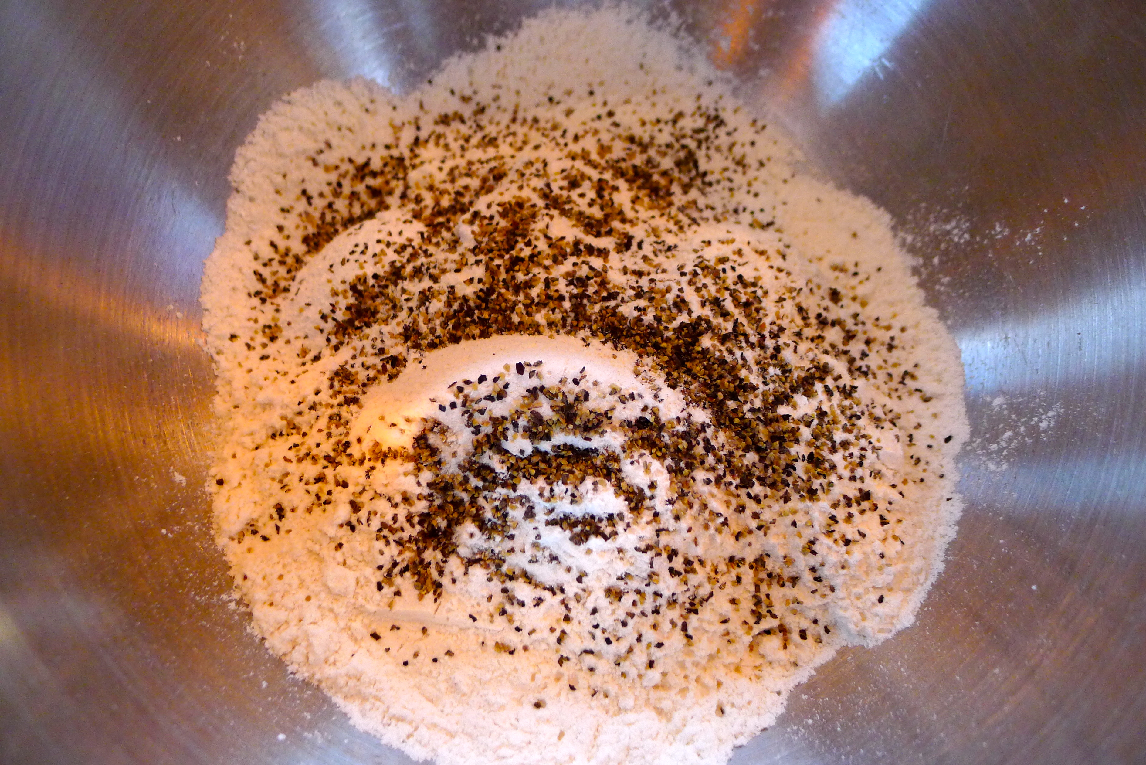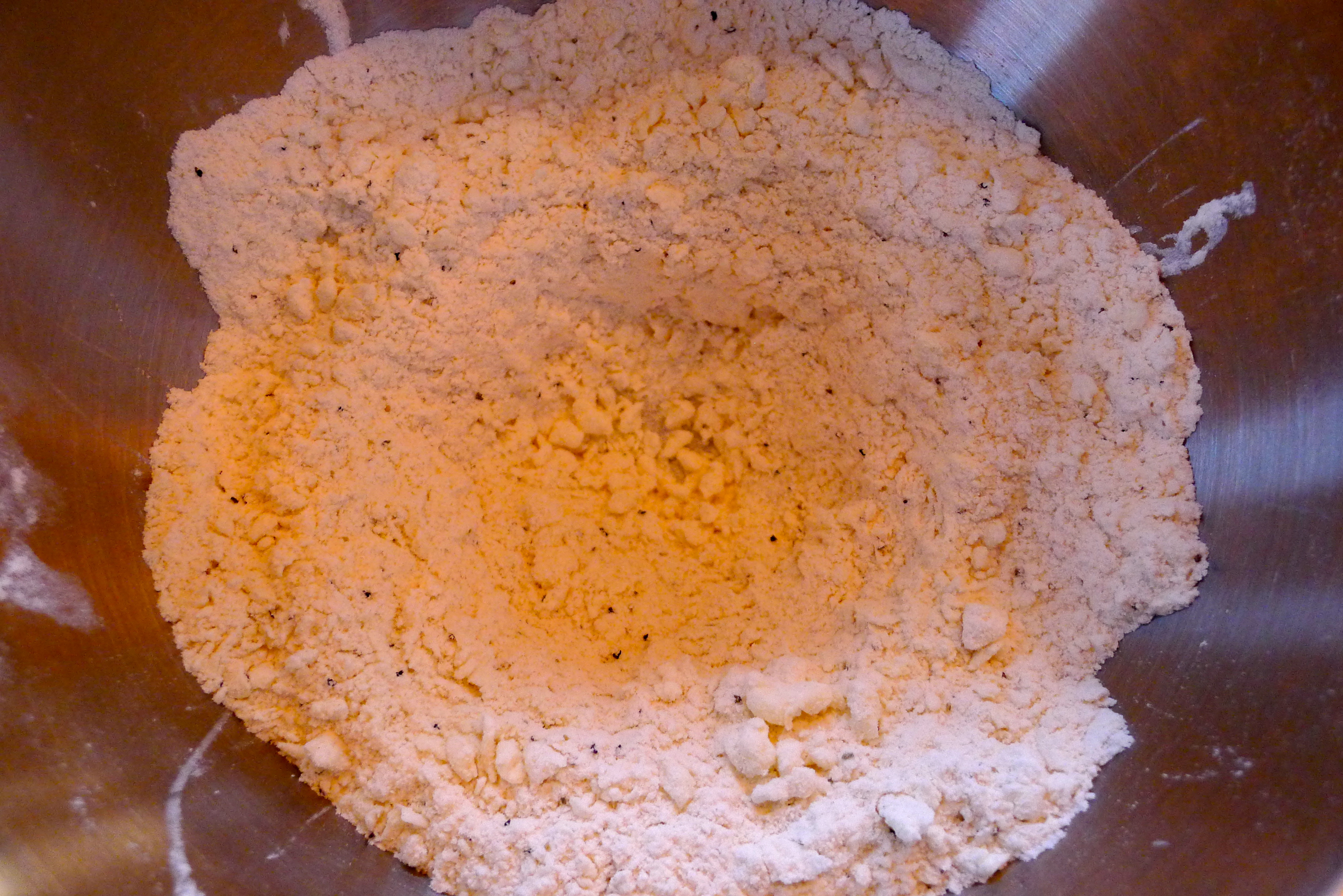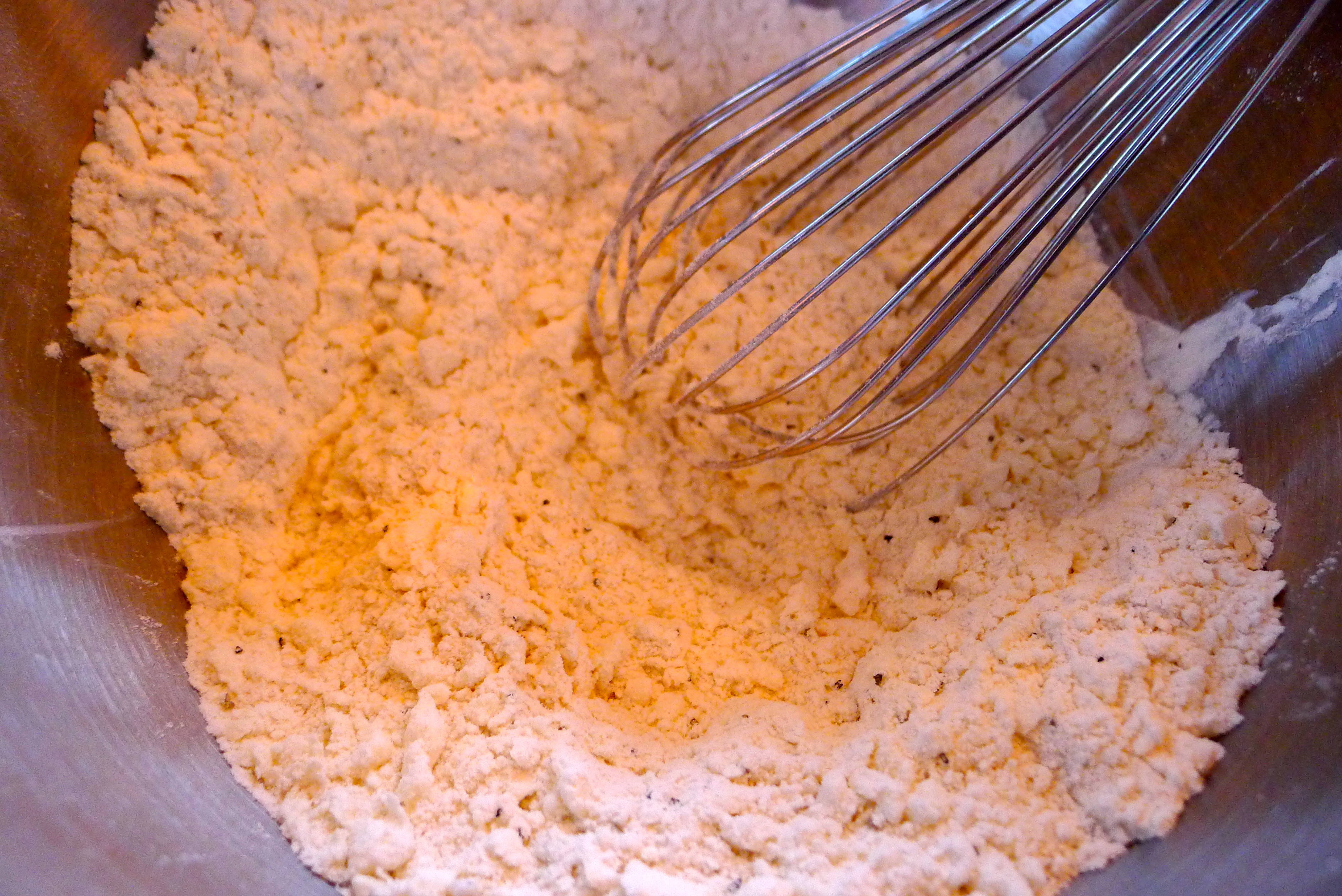Following the recipe pretty exactly, I whisked together flour, baking powder, salt and lots of black pepper. I crumbled a huge chunk of goat cheese into the bowl, and added cut-up cubes of butter. I don’t have a pastry cutter, but I found that a wire whisk allowed me to cut the goat cheese and butter into the dry ingredients pretty well.