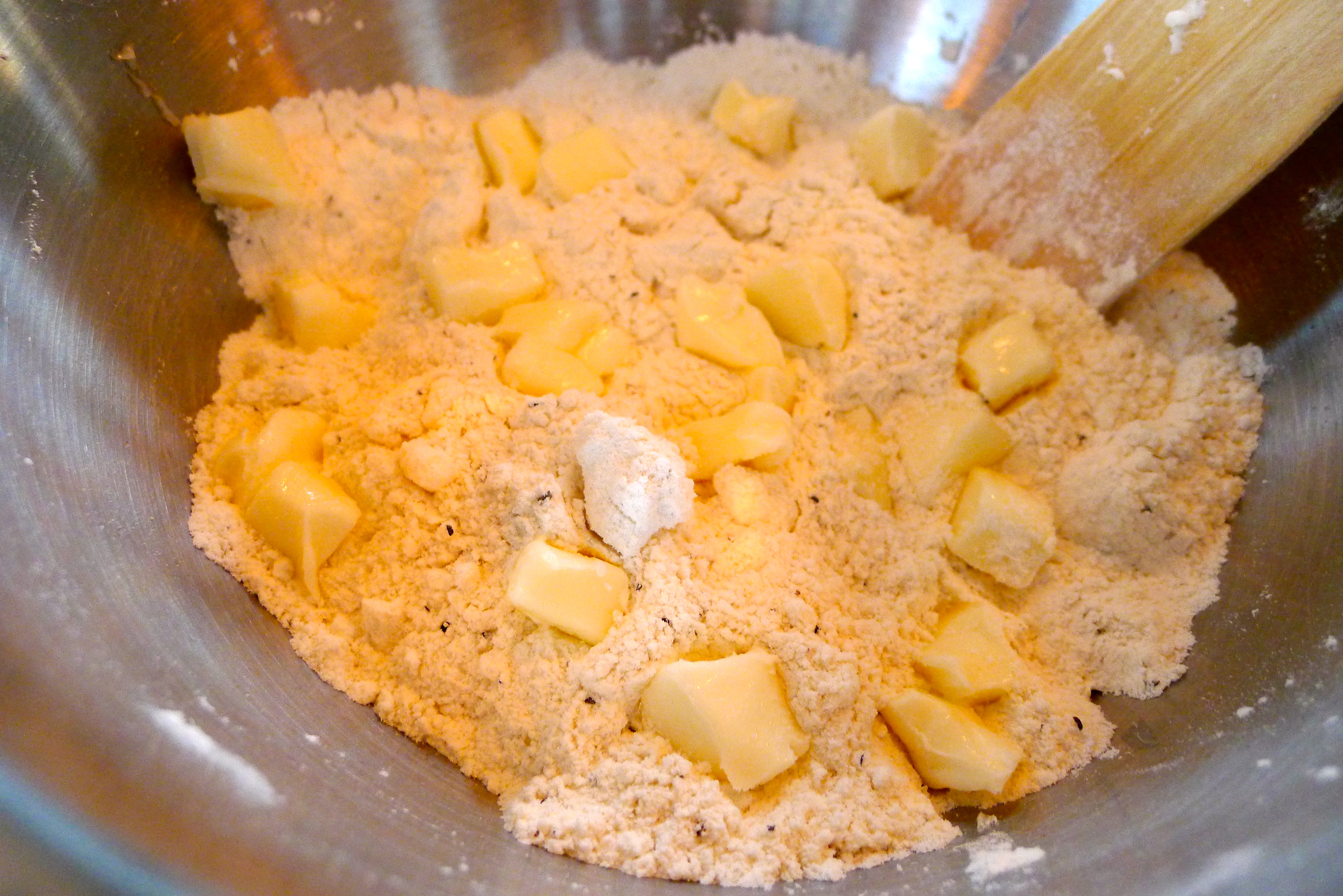 In a large bowl, whisk together the flour, baking powder, salt, and pepper. Crumble the goat cheese into the dry ingredients. Cut 4 tablespoons of the butter into small cubes and add to the bowl. Cut the butter and goat cheese into the flour mixture until there are no big pieces left (I used a wire whisk instead of a pastry cutter).