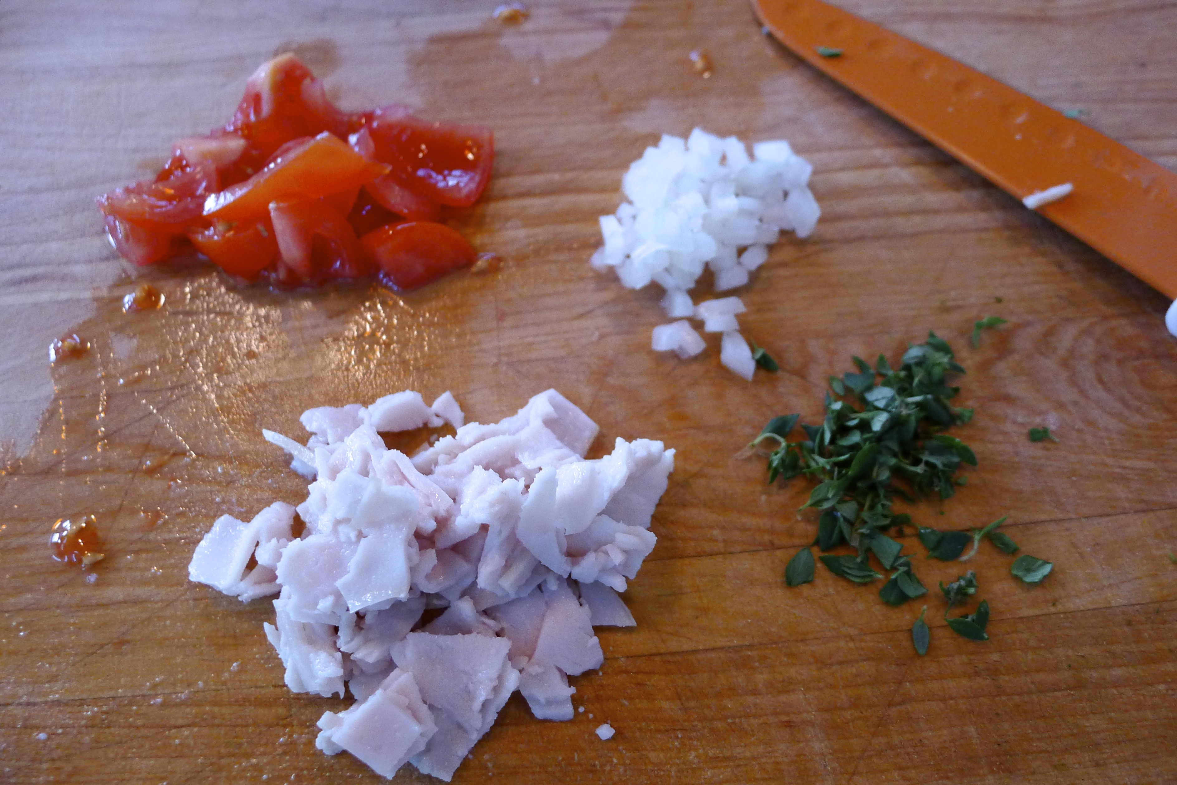 When cooking for one, there’s nothing better than a flavorful, fresh recipe that comes together easily. These eggs were just that! Following the process of the original recipe, I pulled whatever sounded interesting out of the fridge: onion, tomato, fresh thyme, soft goat cheese, even some deli turkey.