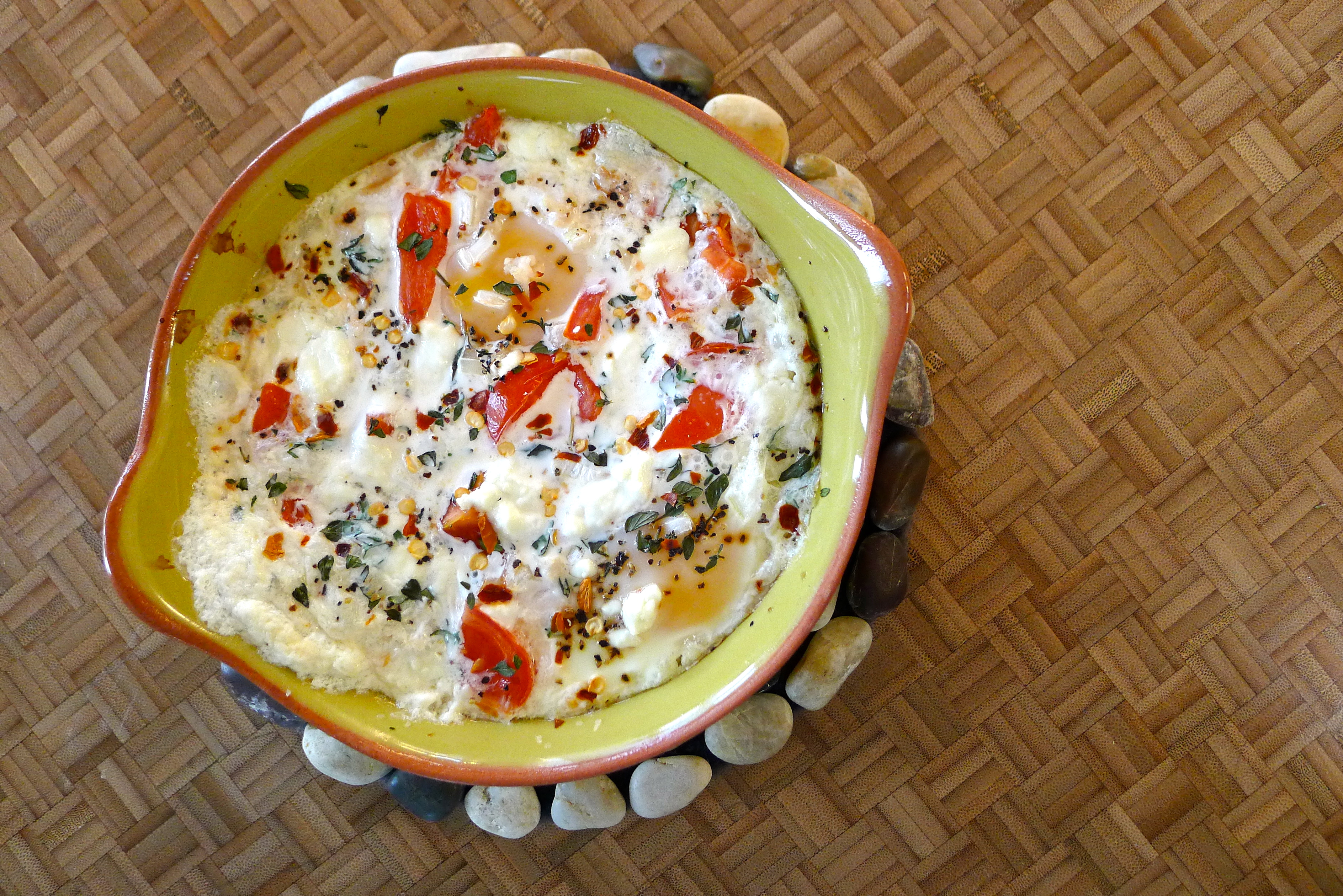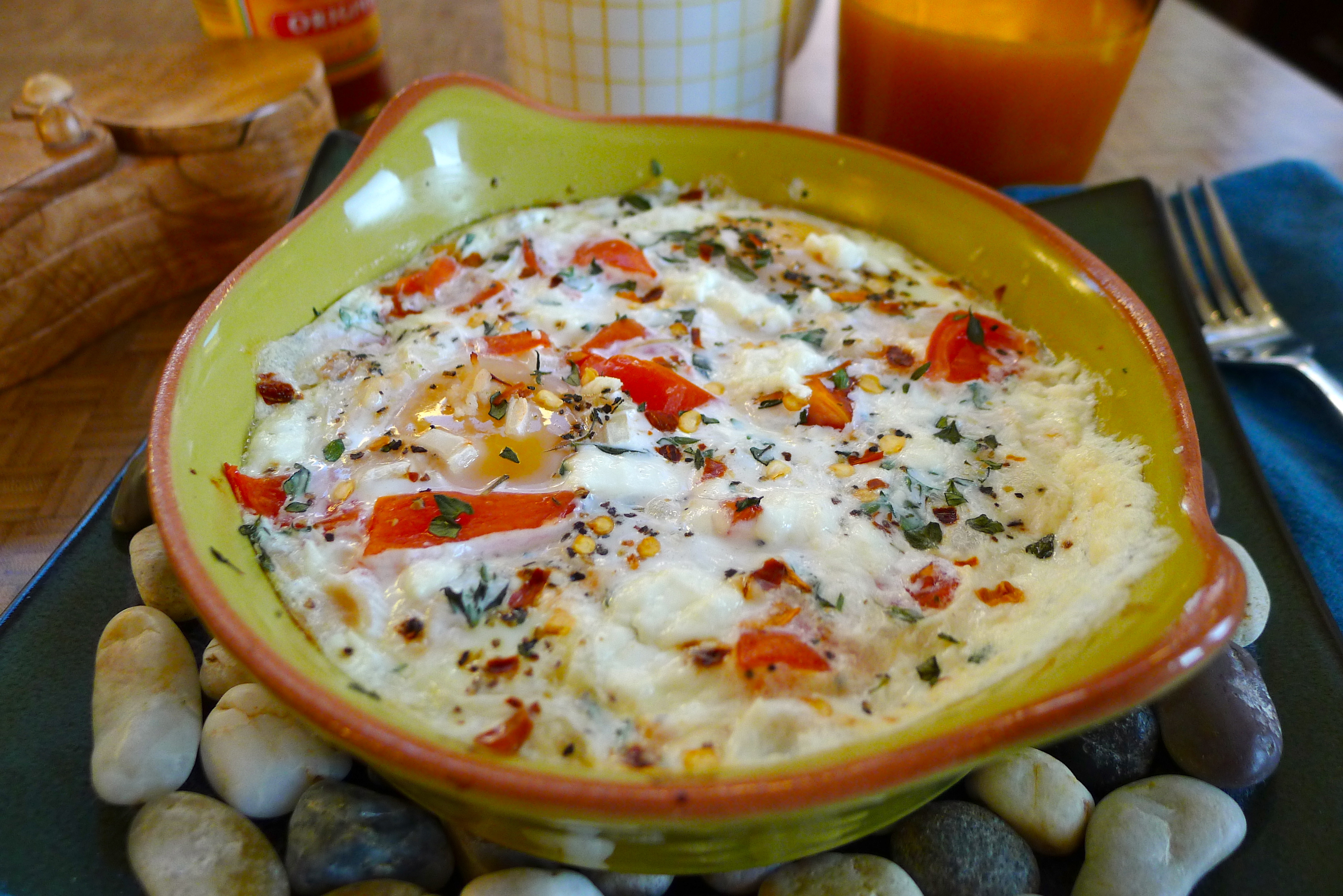 Preheat oven to 400 degrees. Butter a small casserole dish or ramekin. Crack the eggs into it. Sprinkle your “extras” over the eggs. Season as desired. Bake for 15-20 minutes, depending on how you like your eggs. Enjoy while watching the sun rise (or set- breakfast for dinner is always delicious!). Yum!