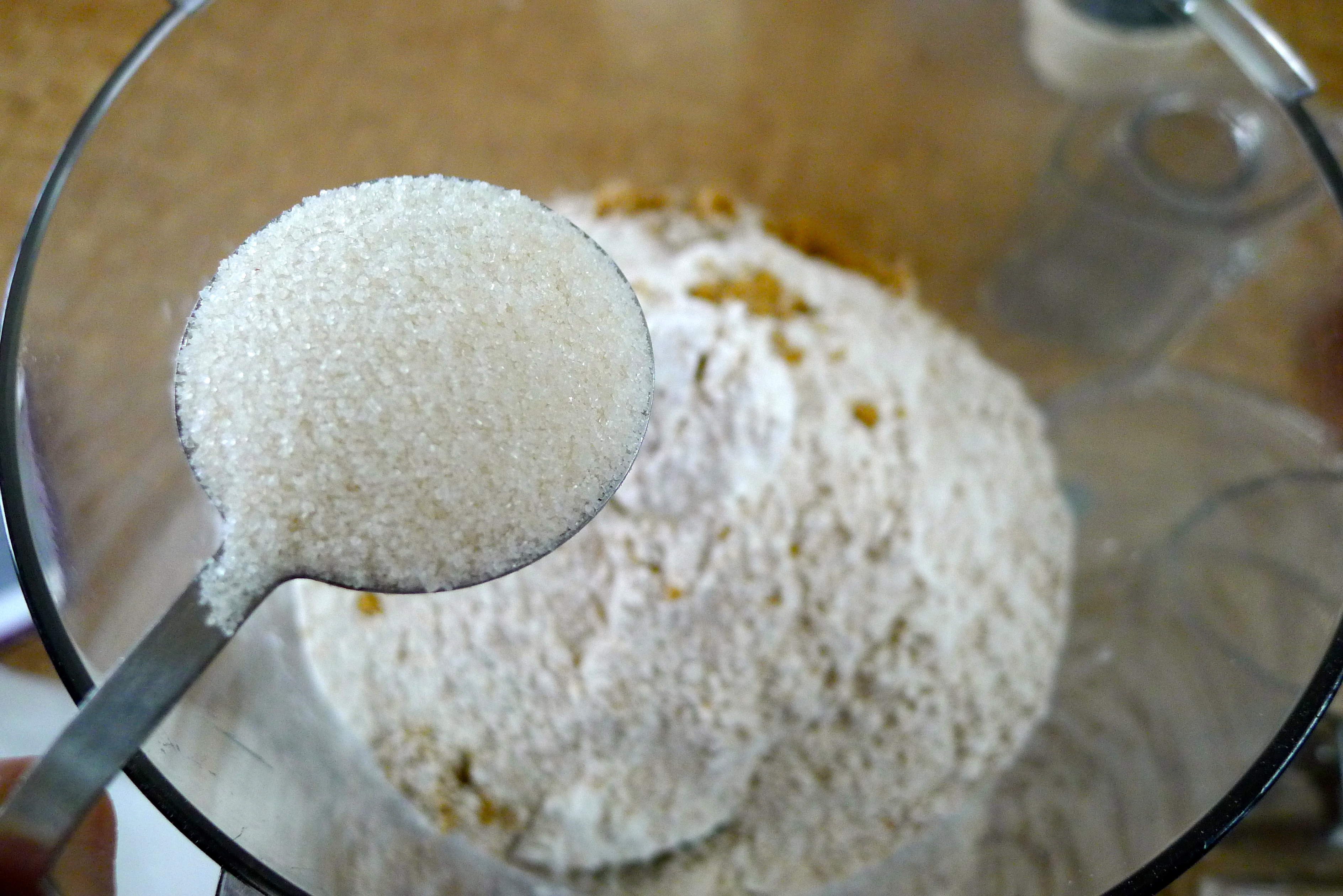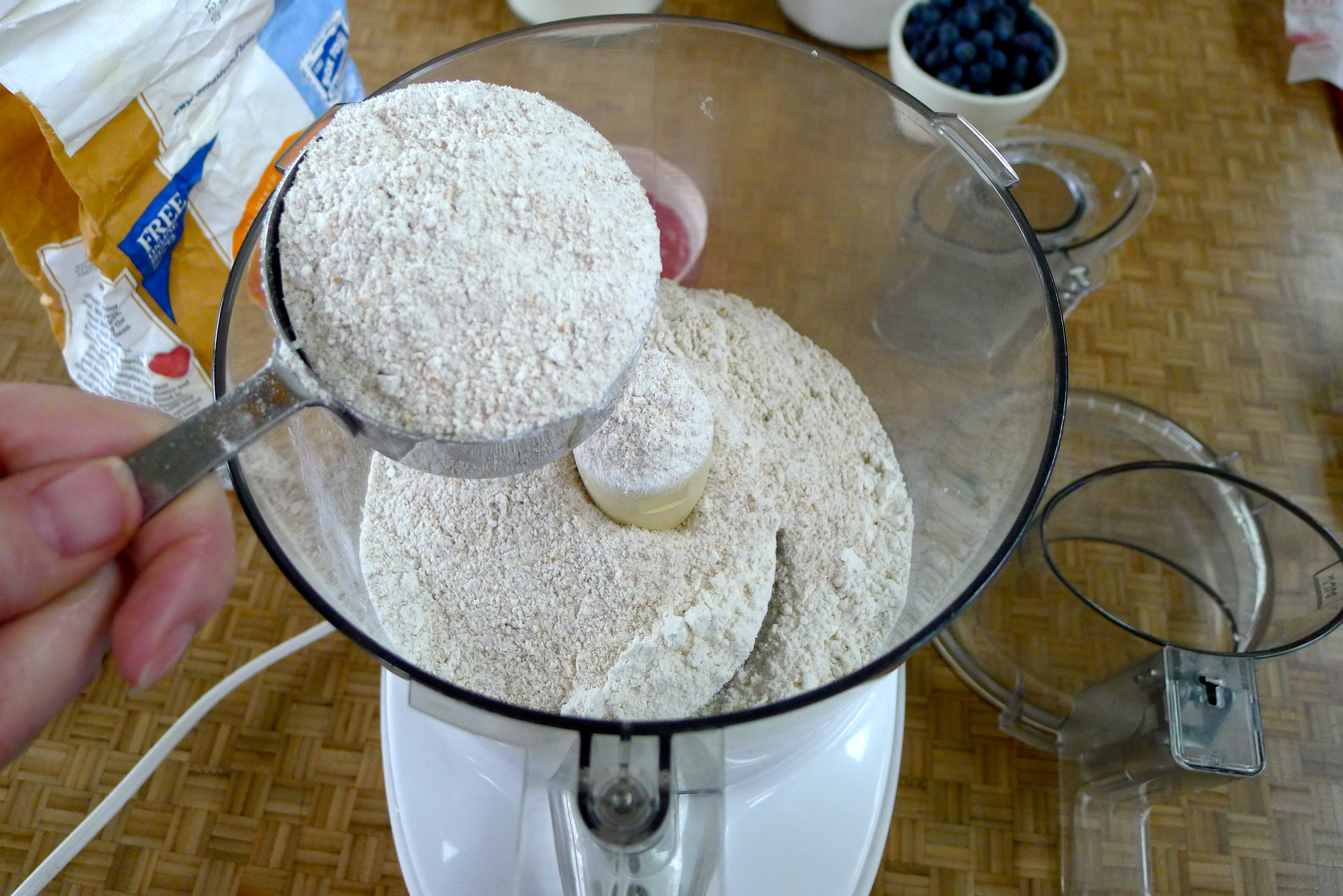 In a food processor, combine the flours, sugar, baking powder and soda, salt, and lemon zest. Add the butter and oil and pulse until crumbly. Pour the mixture into a bowl.