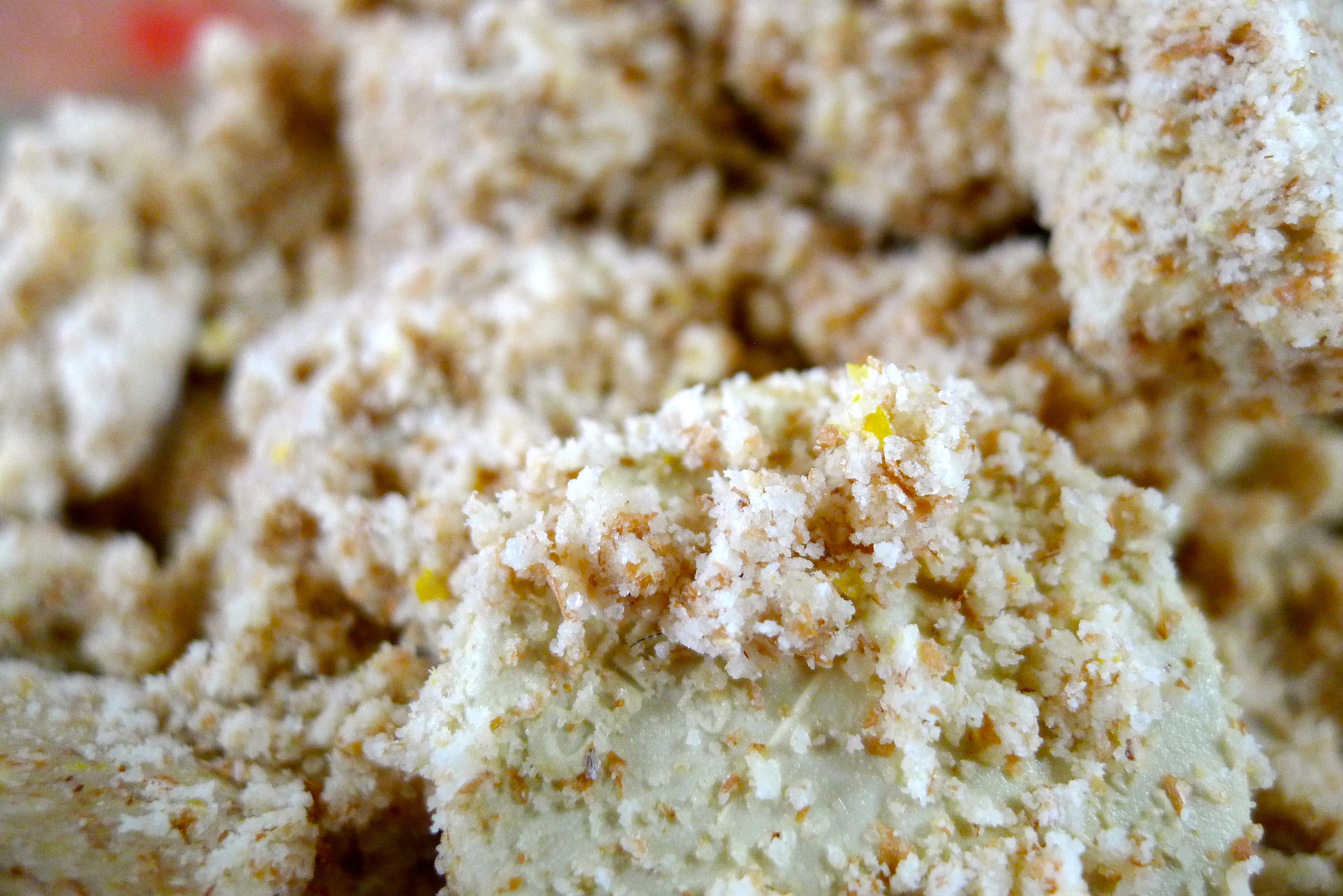 I added cold butter (chopped into cubes) and olive oil and pulsed the mixture until it was nice and crumbly, then transferred it into a bowl.