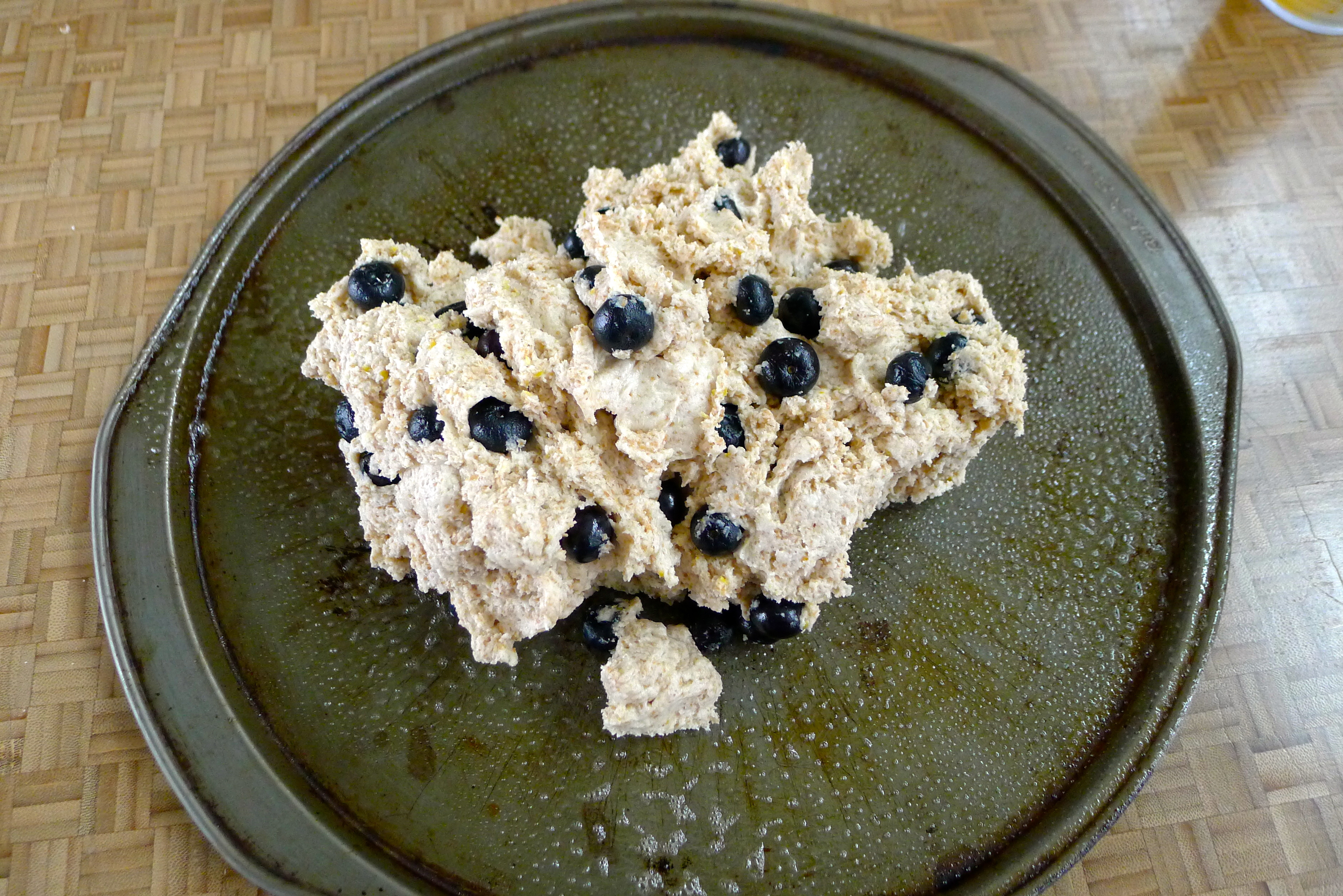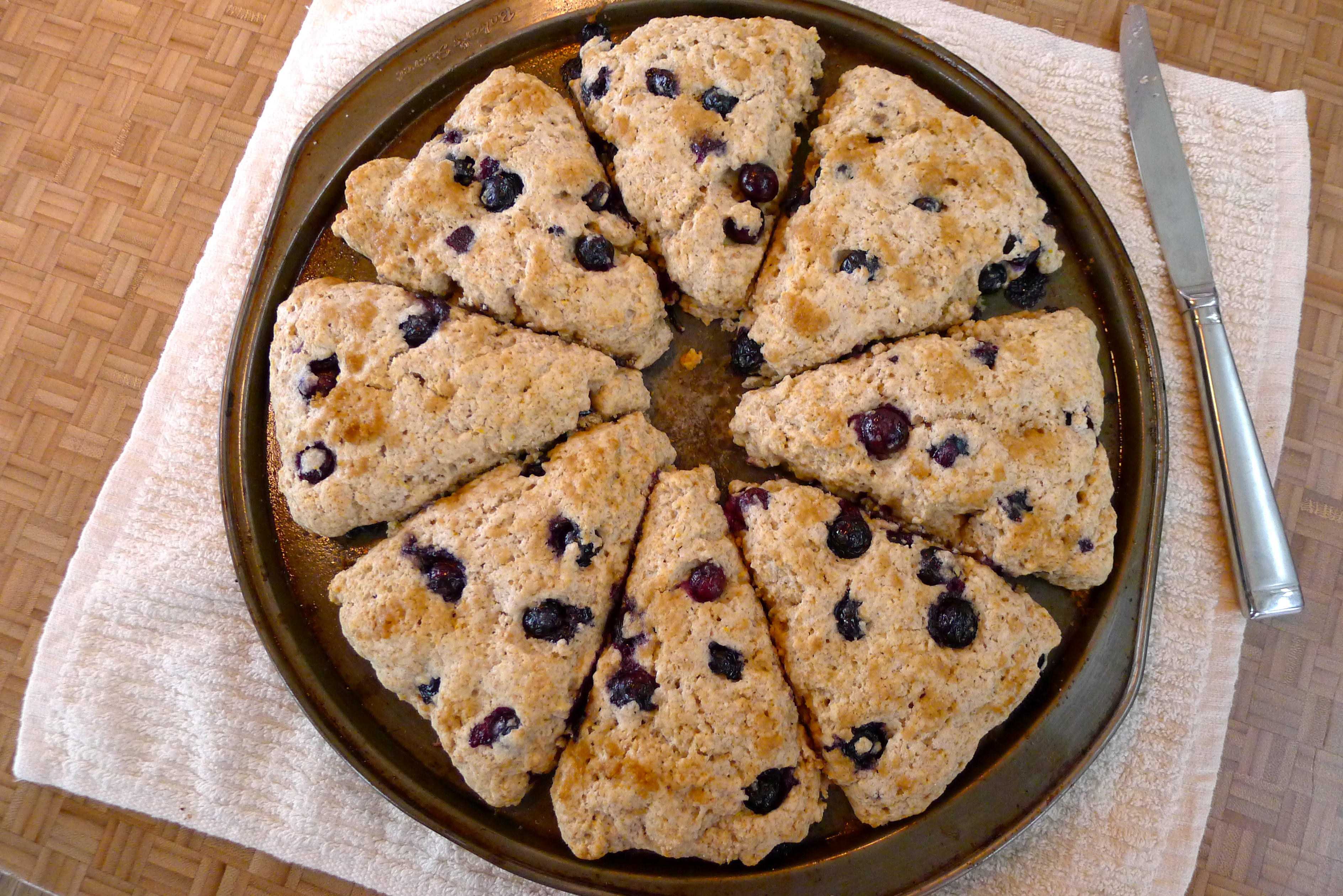 Add the milk and berries and stir gently until combined. Dump the dough onto the baking sheet and pat into a circle, 1 inch thick. Brush with milk and sprinkle with brown sugar for extra sweetness. Cut the circle into 8 wedges and spread them out on the baking sheet. Bake for about 20 minutes or until slightly browned.