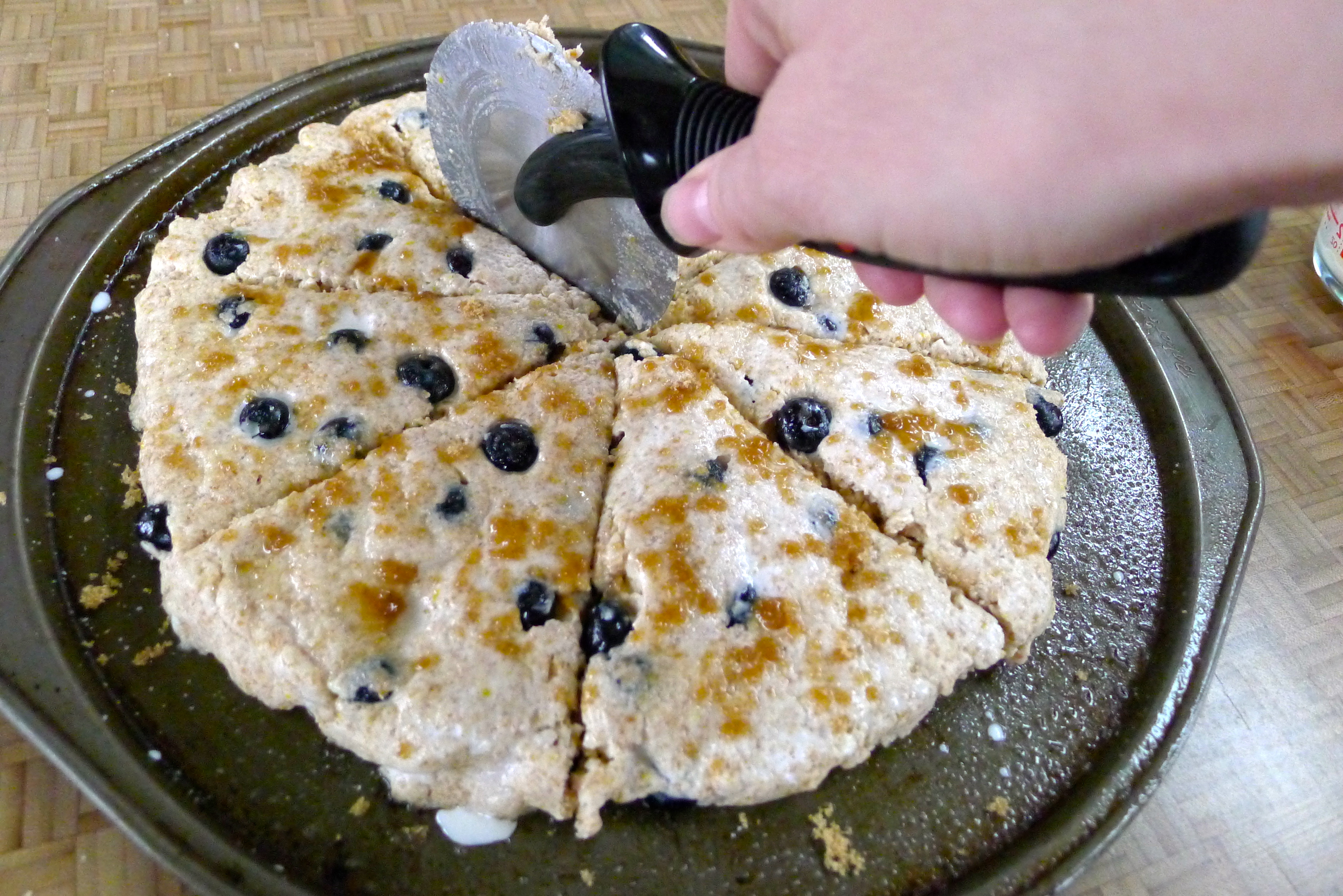 I used a pizza cutter to slice the scone-cake into wedges and spread them out on the pan before baking. When they came out of the oven, they were browned on top and the brown sugar had caramelized. Yummy!