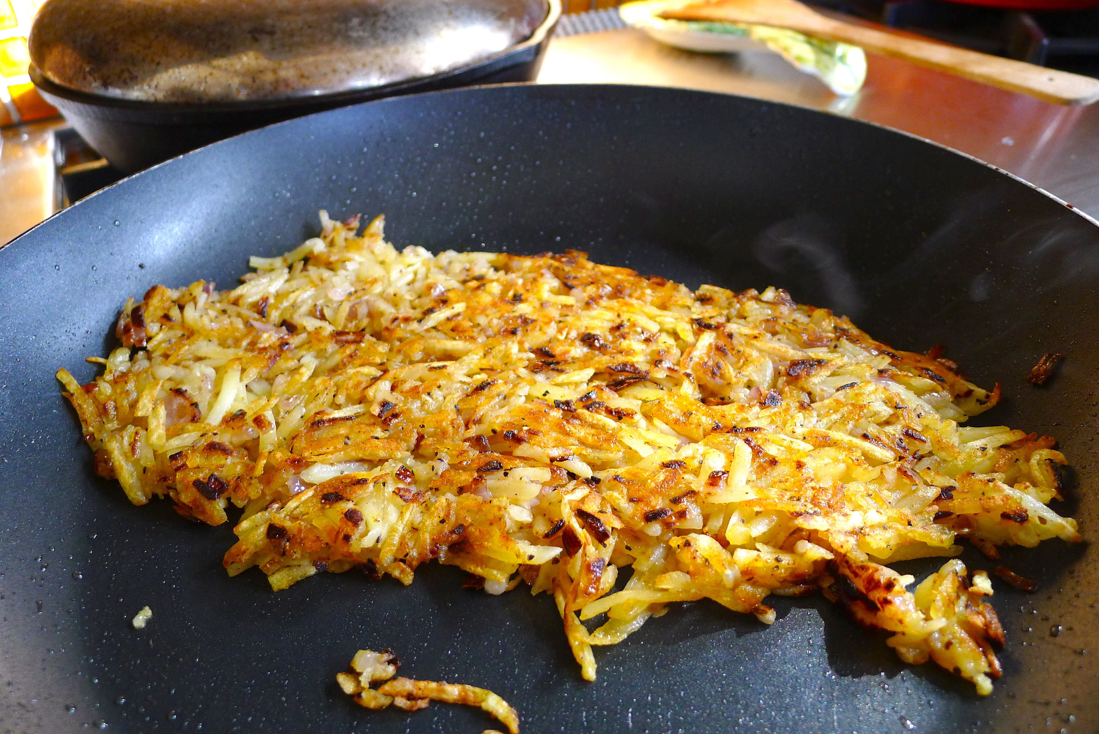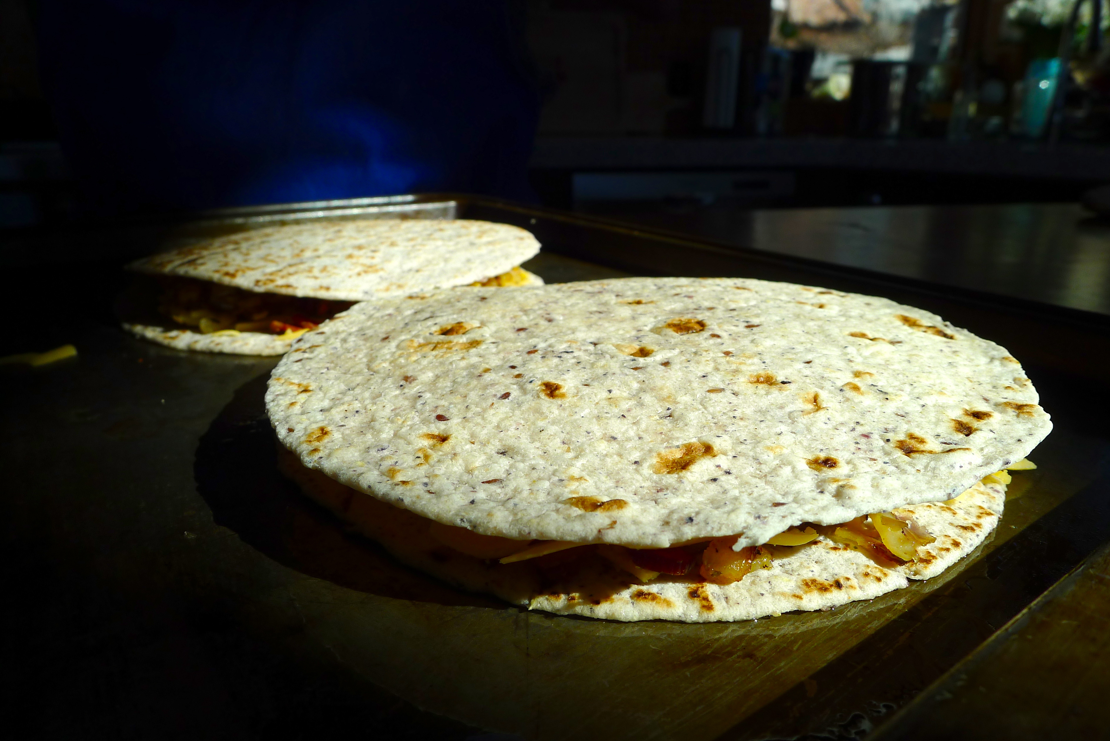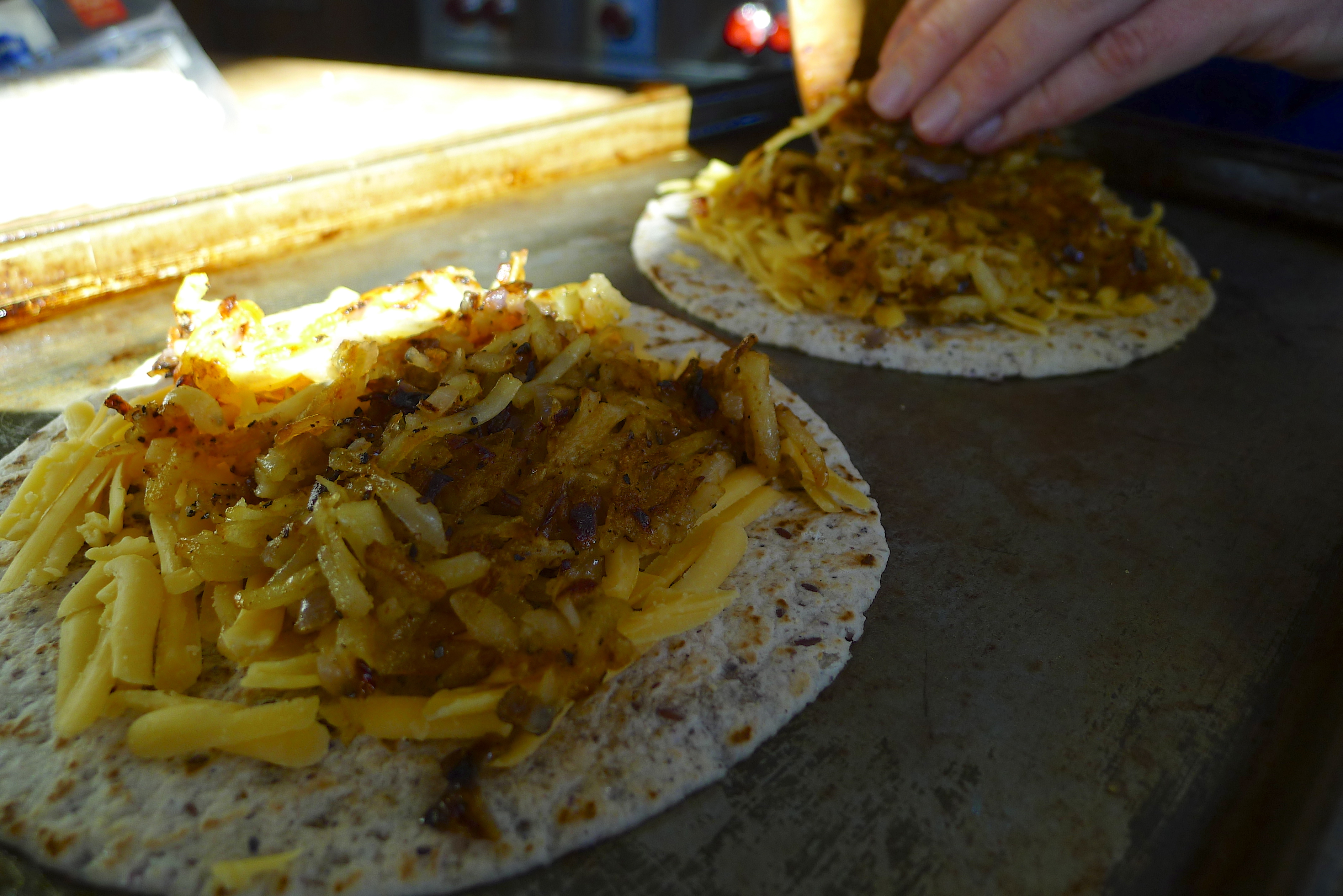 After family snuzzle time with Cholula in bed, I switched on the Cooking Channel. Bobby Flay was working some magic with tortillas and hash browns, and it looked fabulous. John was inspired and created a breakfast better than any restaurant’s: Breakfast Quesadillas. Yum! He started with the taters. He sautéed chopped onion in some oil and added a package of frozen organic hash browns. He seasoned them and let them get browned and delicious.