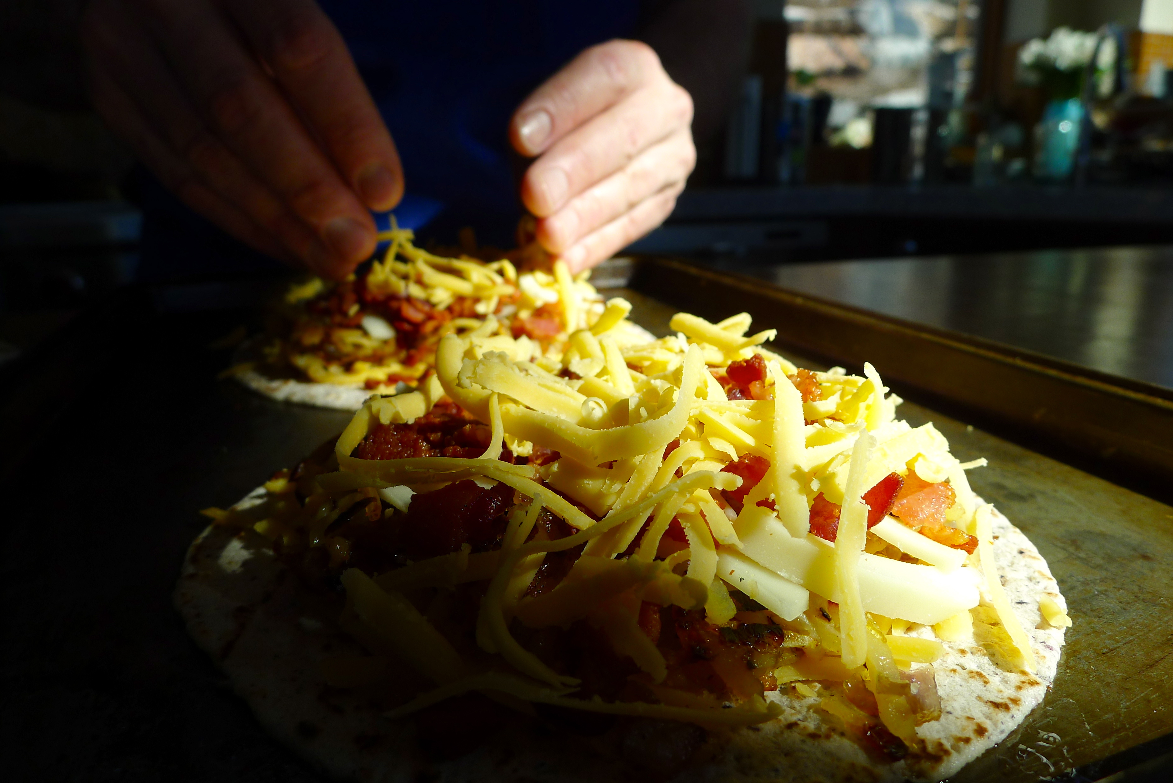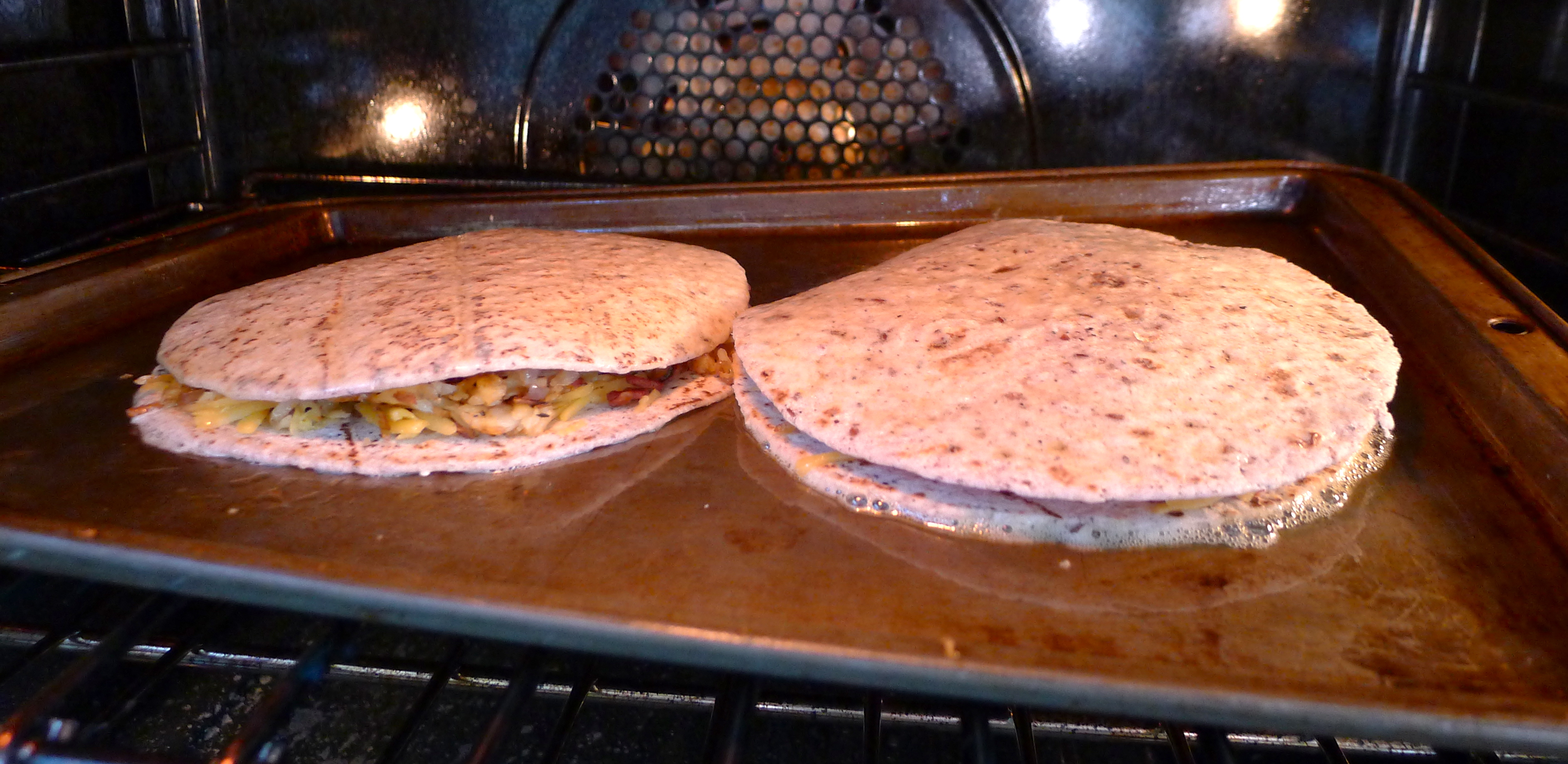 Time to assemble the quesadillas! He sprayed a sheet pan with olive oil cooking spray and laid out two tortillas. First came a layer of cheddar, then potatoes, then provolone, then bacon. He topped it with a bit more cheese and another tortilla and popped the pan in a hot oven for ten minutes. He flipped the quesadillas and let the other side brown for a few more minutes while he cooked two eggs (over medium).