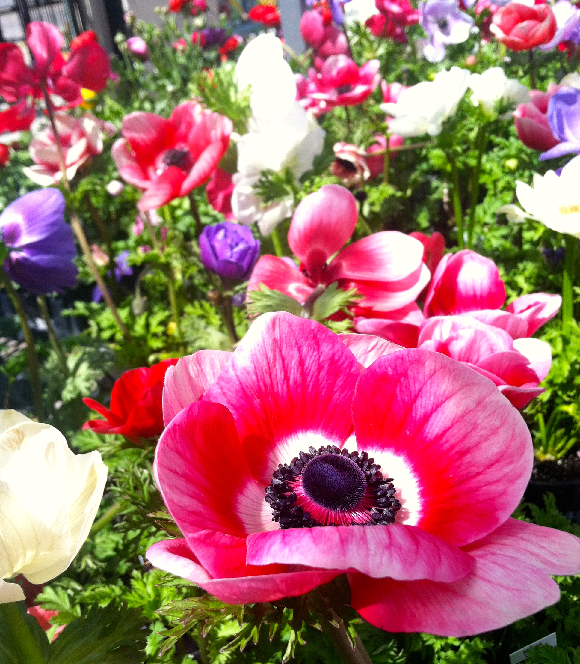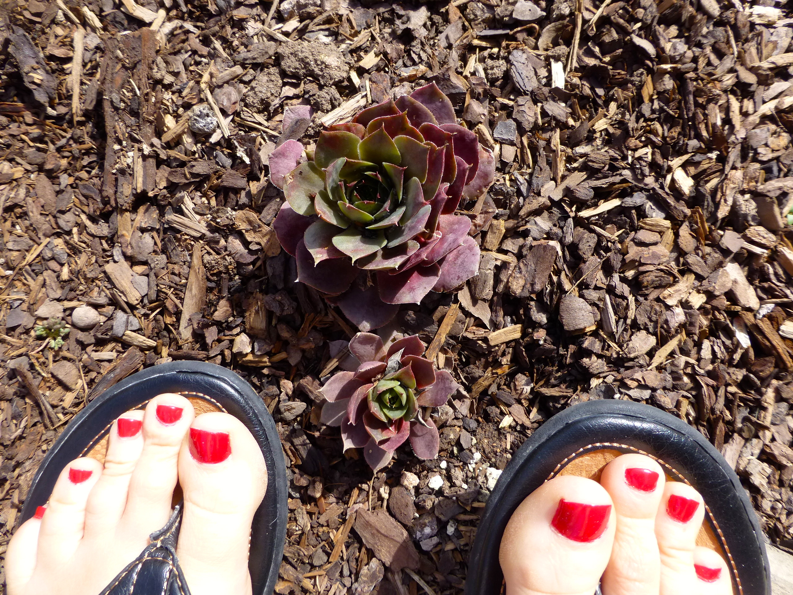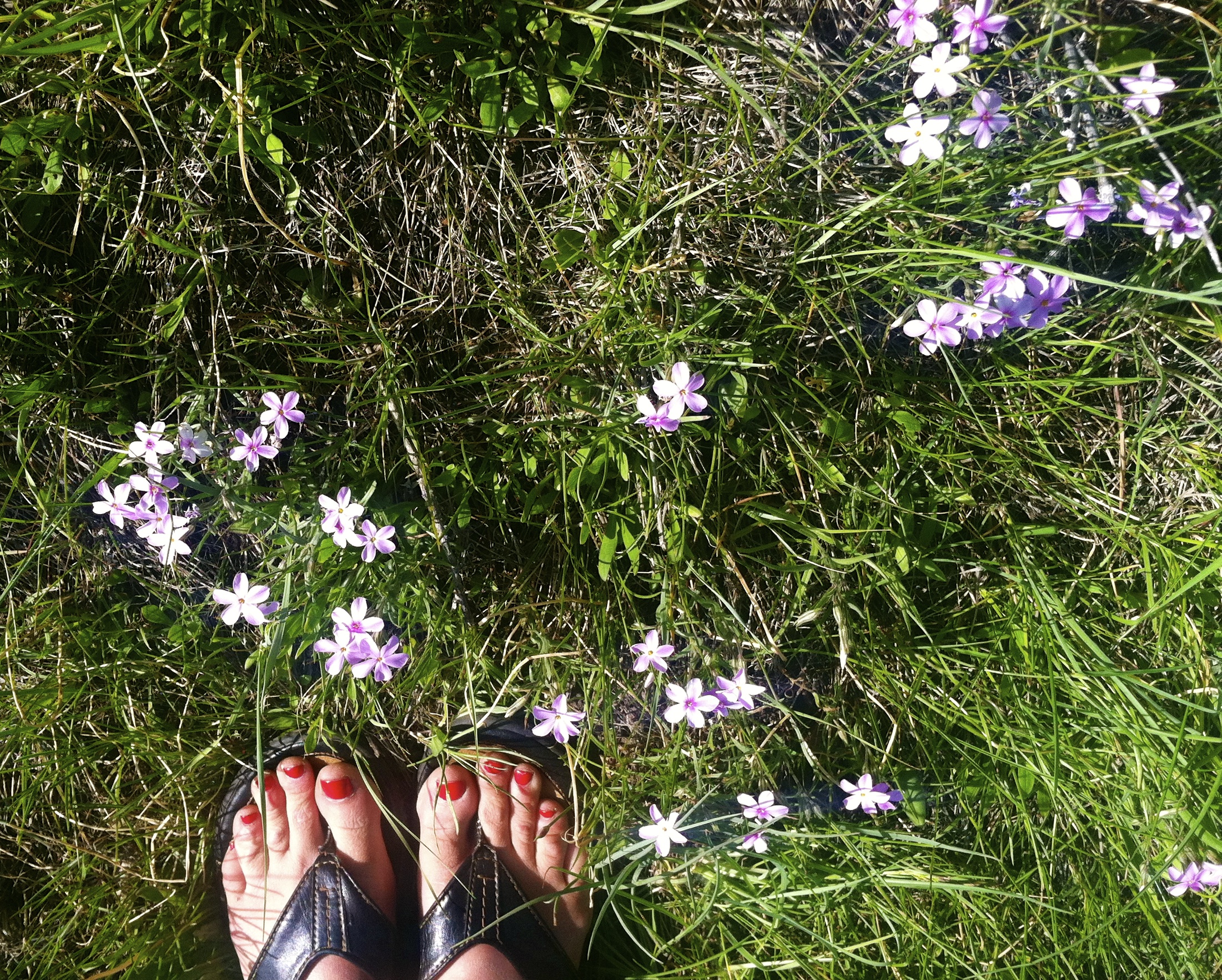 Flowers everywhere– in my home, on the hillside, in my garden. Pedicured toes, warm weather shoes, and a happy reunion with my dresses. Dog diving!