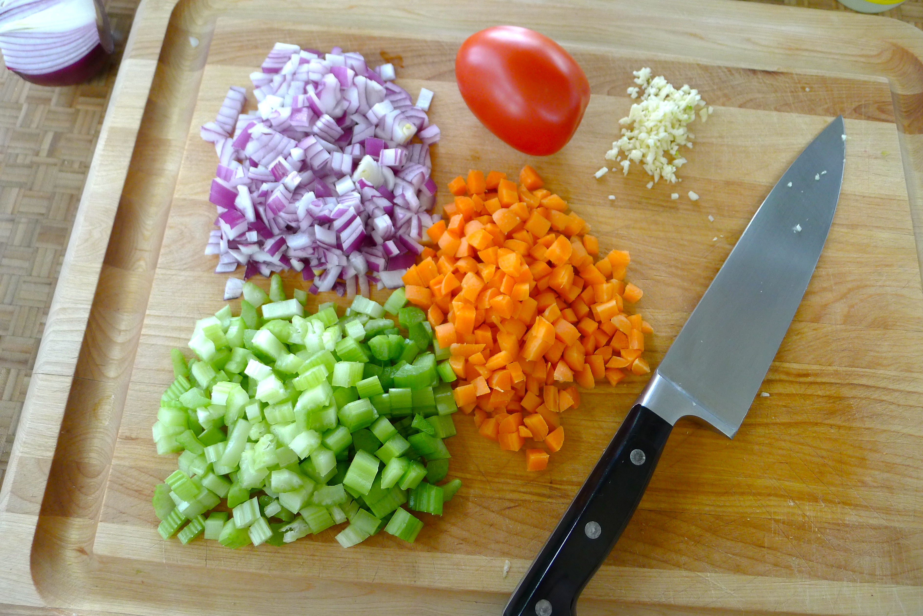 The soup starts with what Italians call a soffrito: onion, carrots, celery, and a little garlic. I sautéed them in oil until they softened and added four chopped roma tomatoes.