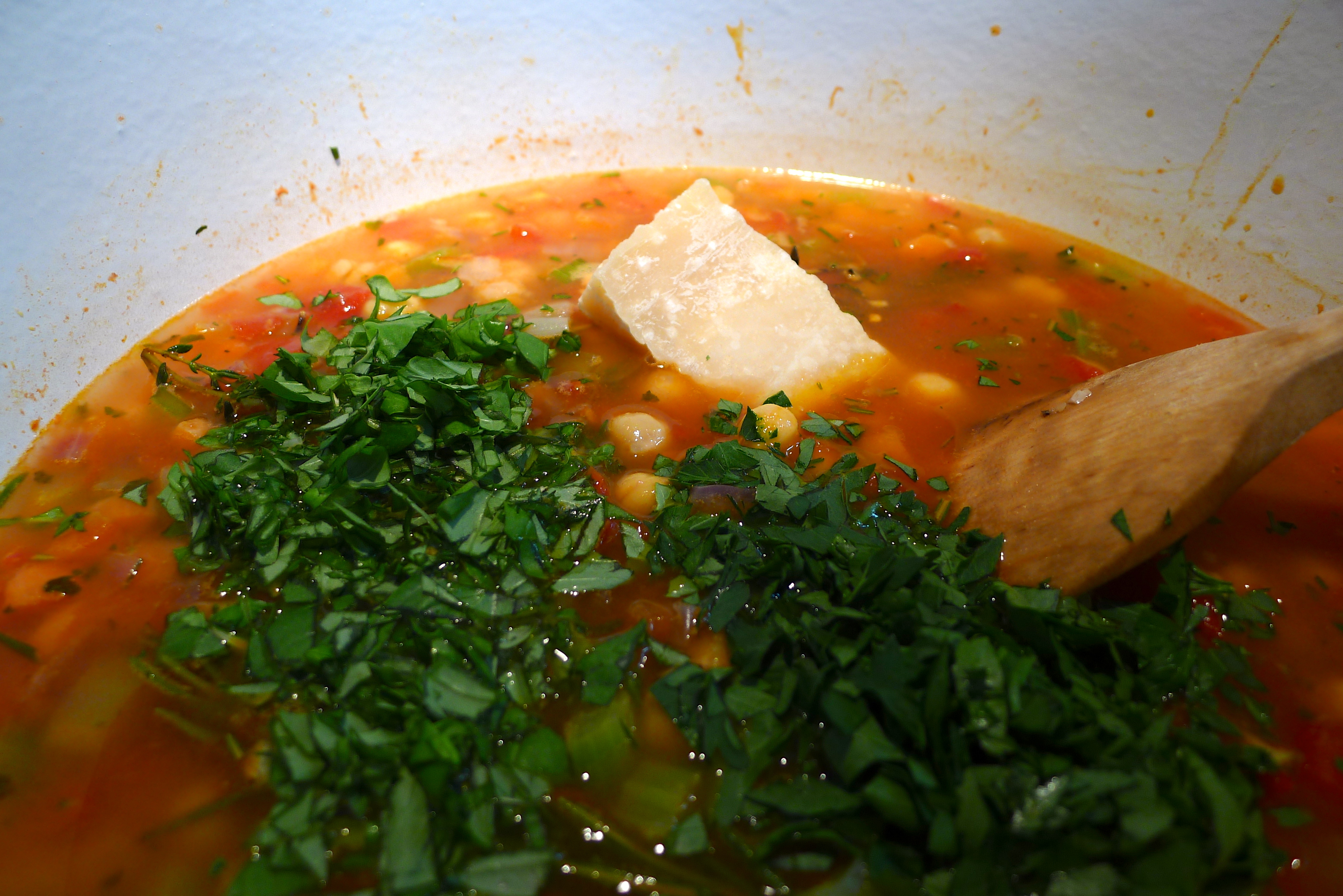 Heat the oil in a Dutch oven or soup pot over medium heat. Add the onion, carrots, celery, and garlic. Sautee until the veggies start to soften. Add the tomatoes, red pepper, oregano, thyme and rosemary sprigs and cook for 6-7 minutes, stirring occasionally. Add the basil, parsley, Parmesan rind, chickpeas, wine, and broth. Bring to a boil, then reduce the heat and simmer for 45 minutes.