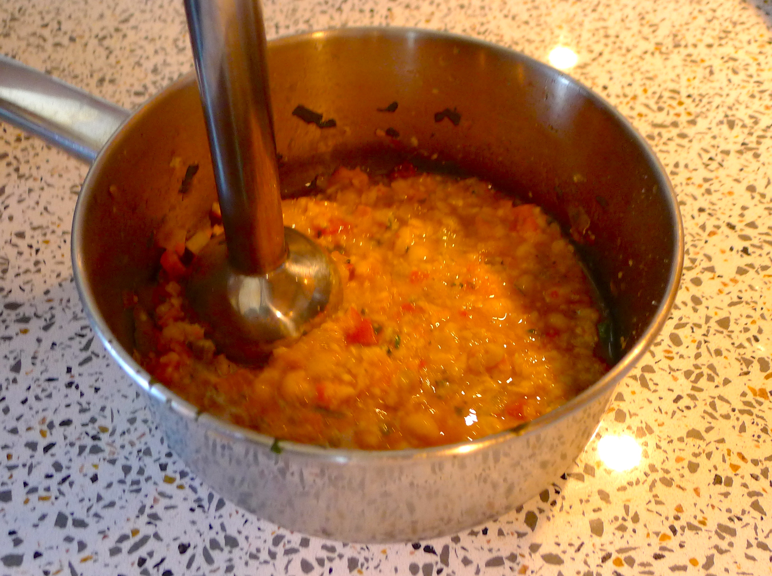Forty-five minutes later, I fished out the thyme and rosemary sprigs and the Parmesan rind. I scooped about a cup of the soup into another pot and pureed it with a hand blender.