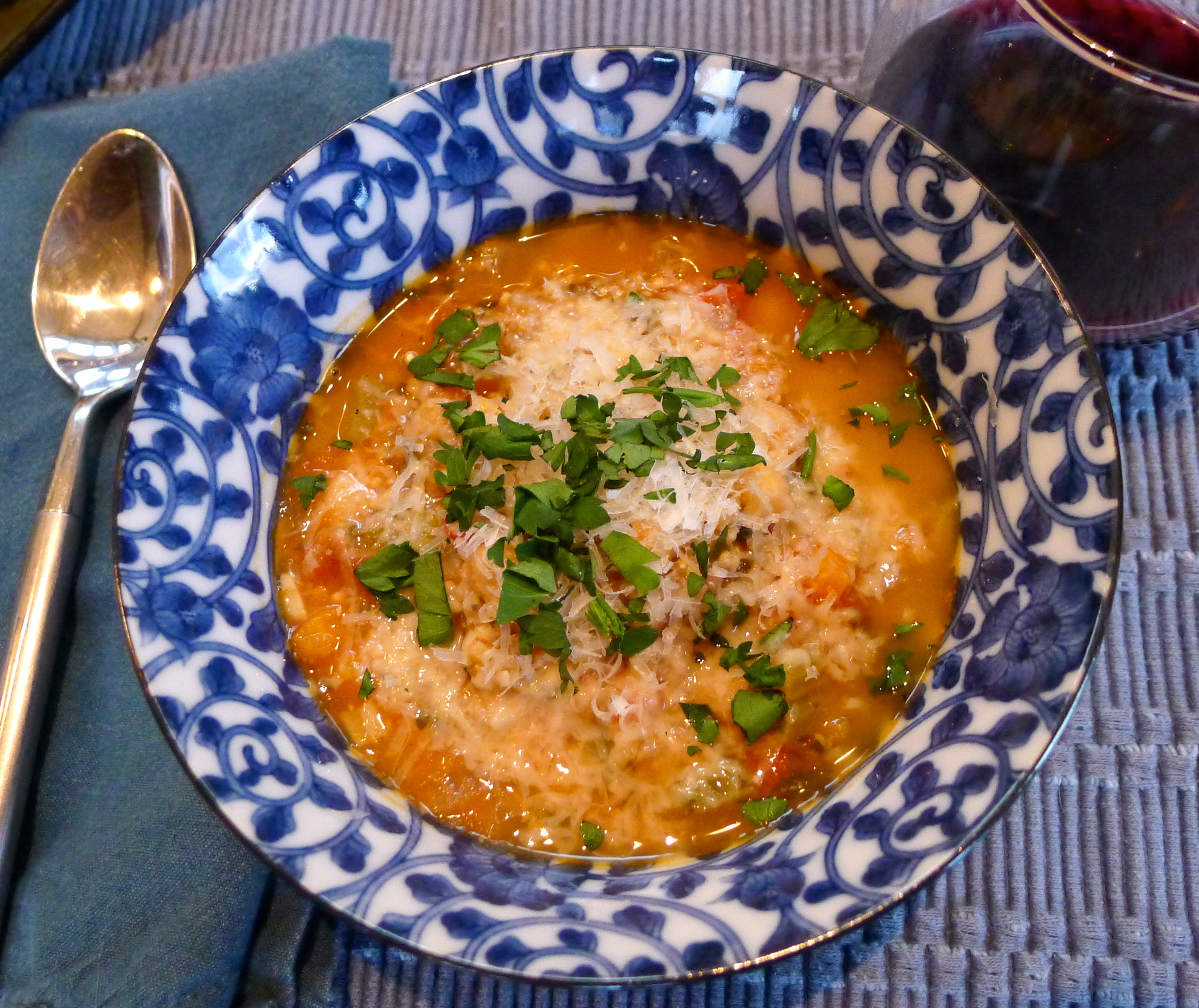 While the tomatoes cooked down a little bit, I chopped fresh basil and parsley. Into the pot they went, along with one of my favorite flavor-makers in Italian recipes: a Parmesan rind. (I keep a bag of them in the freezer for soups and sauces.) I also added chicken broth and wine. Once the soup started to boil, I lowered the heat to a simmer and sampled the wine while snowflakes started to fall outside.