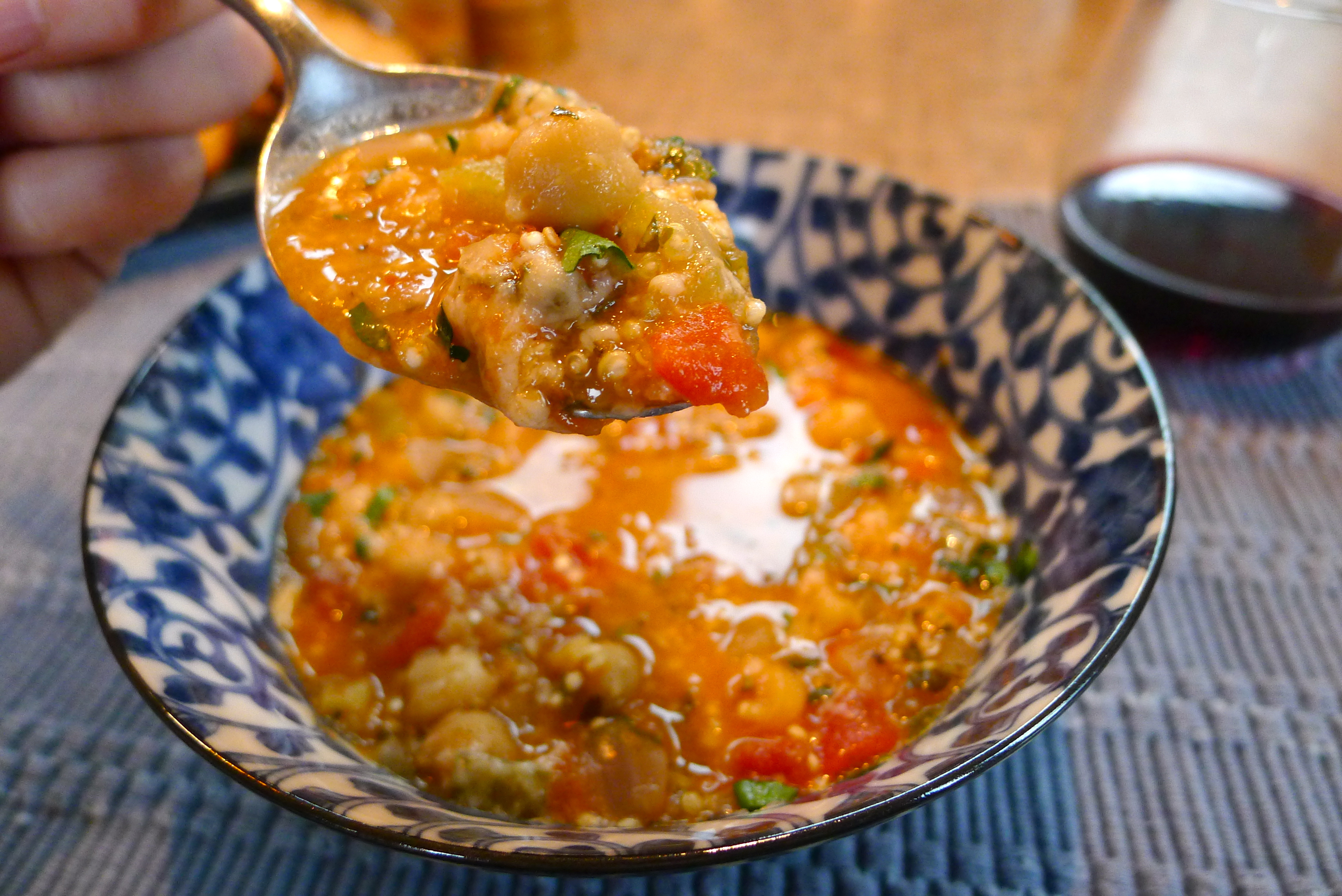 Before adding the puree back into the pot, I stirred half a cup of dry quinoa into the soup and let it get tender for 15 minutes or so. The puree went back into the soup, thickening it slightly, and it was time to taste it.
