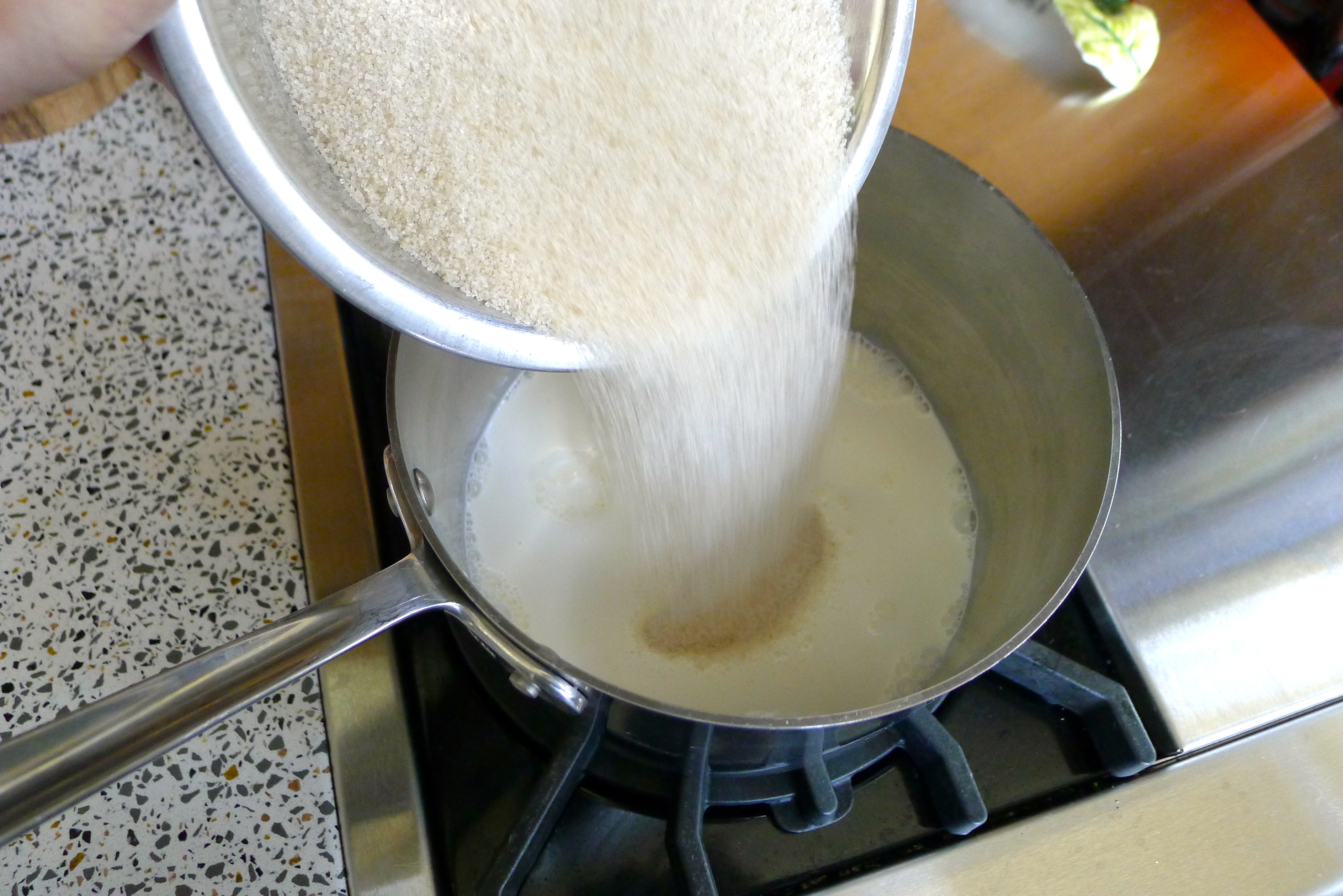 Making ice cream is often super simple, but it takes a little time and patience. I started by stirring sugar into some half and half on the stove until the sugar dissolved. Then, I added some sour cream (off the heat) and whisked it until it was smooth. I snuck a taste- YUM!