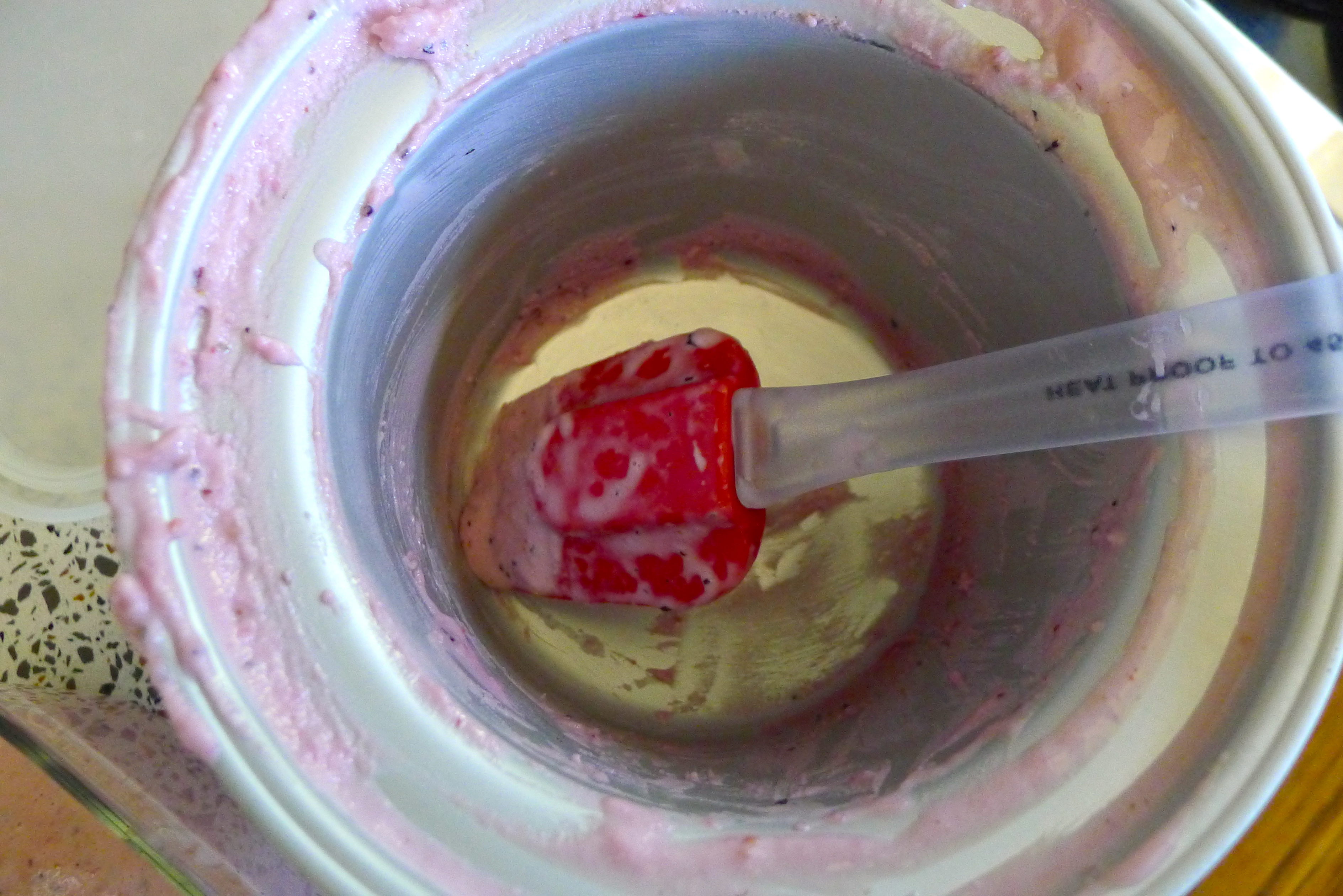 Once the ice cream maker had done its duty, I scooped the soft serve into a container to freeze up into true ice cream. More waiting! Finally, we scooped bowlfuls of mixed berry sour cream ice cream and dove in, spoons first.