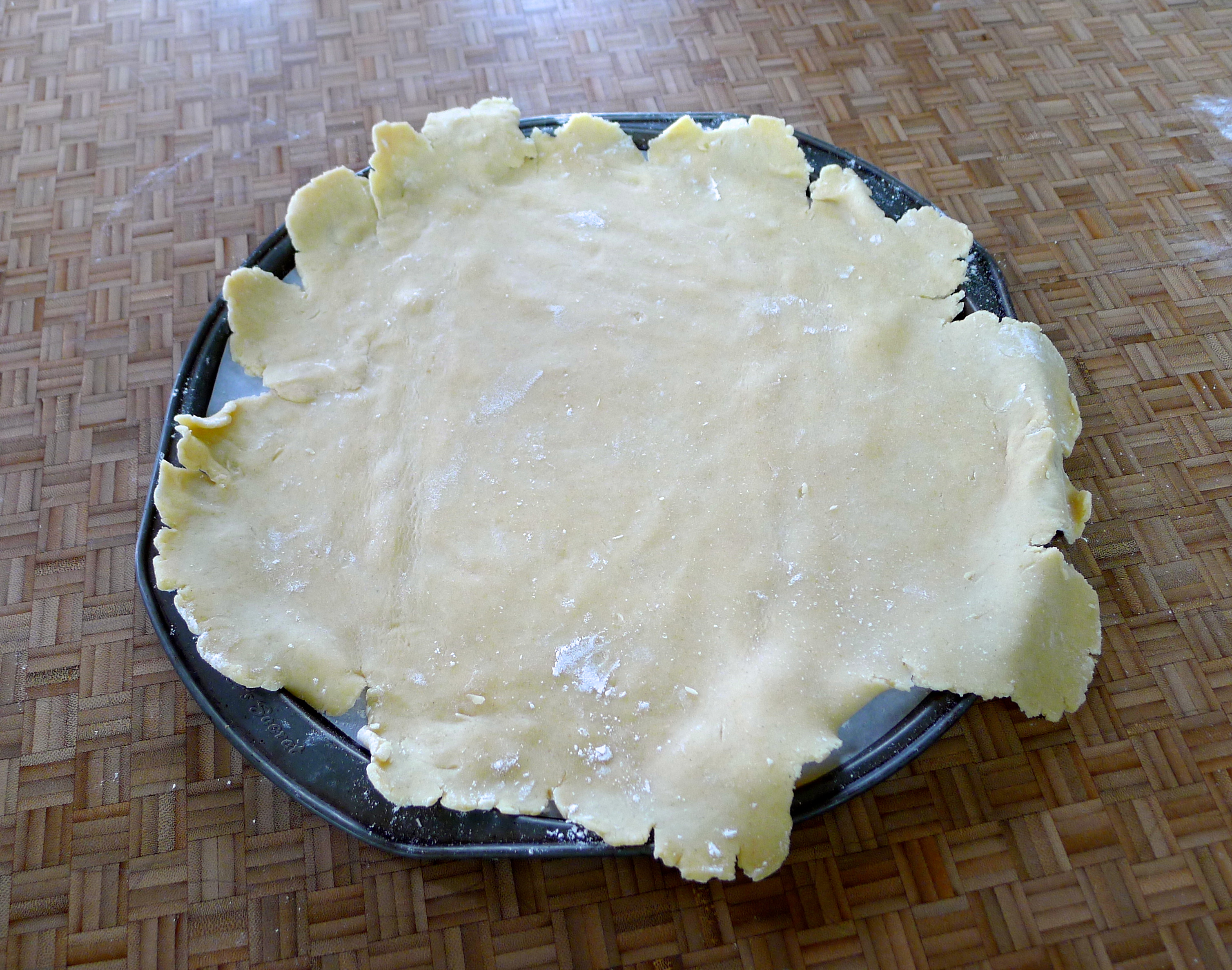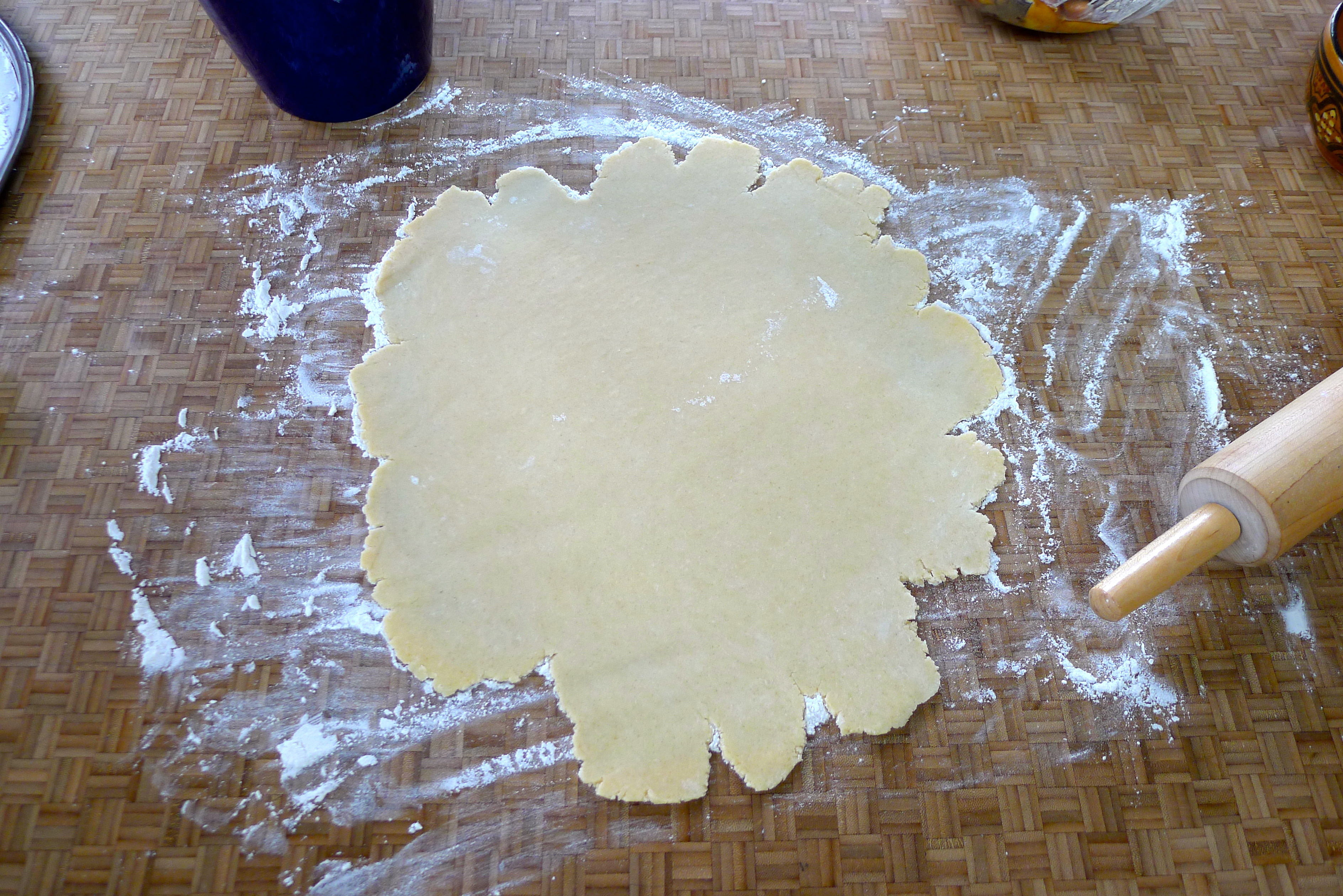Roll out the ball of dough into a thin circle. Don’t worry if the edges are rough! Line a baking sheet with parchment paper and dust it with flour. Move the dough onto the baking sheet.