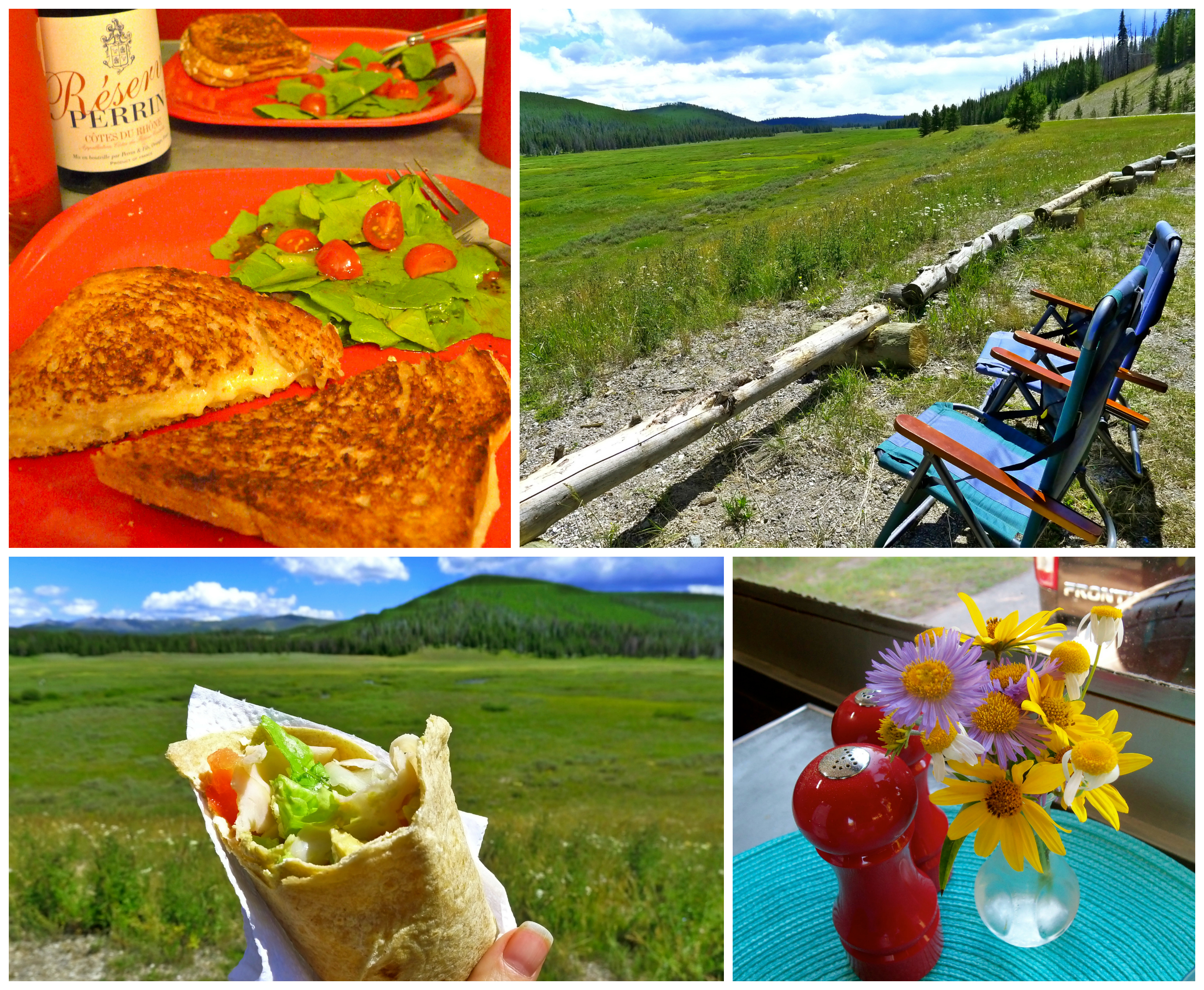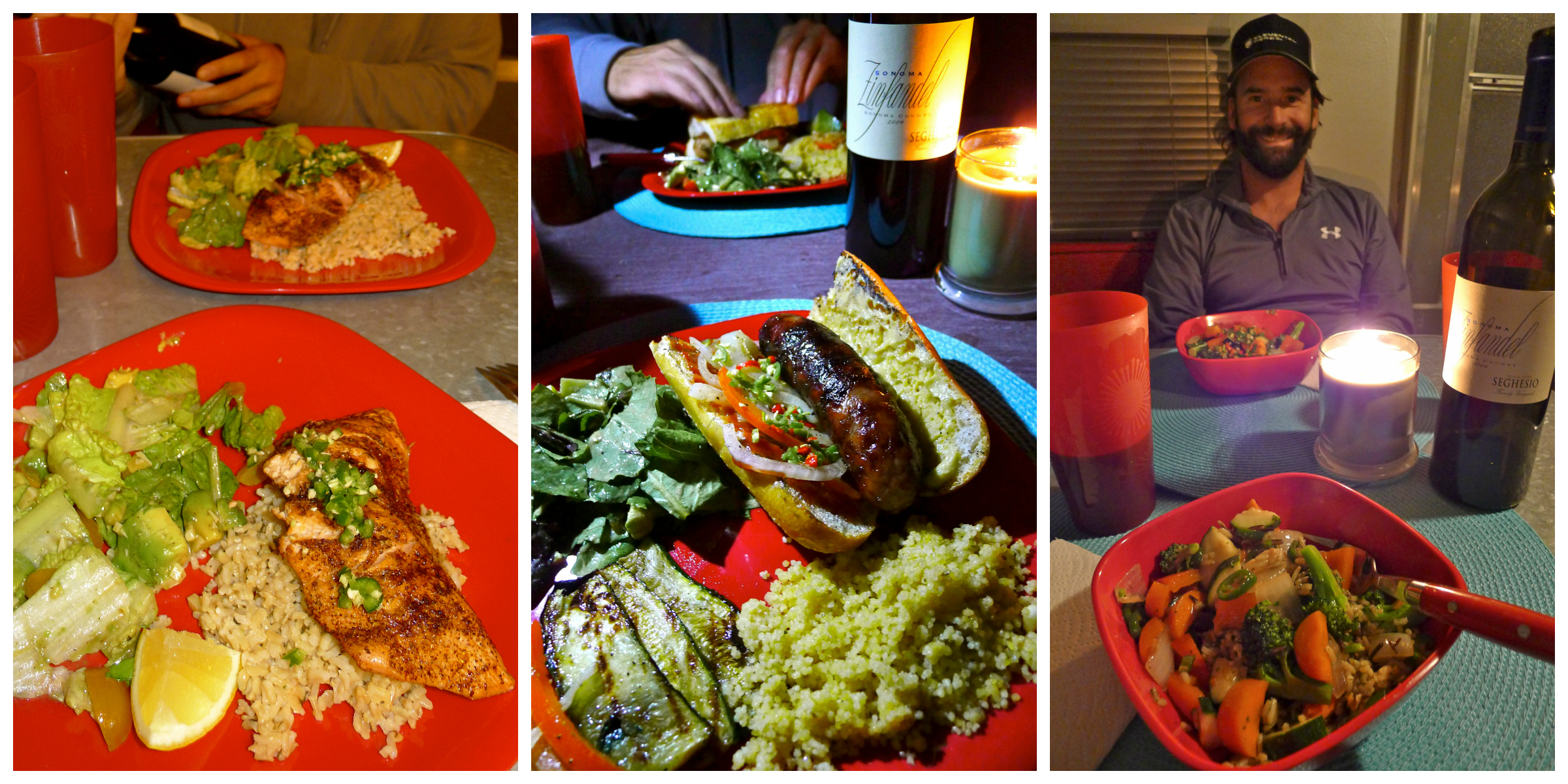 We enjoy happy hour with cheese and crackers, just like we do ate home, only in camp chairs and with ever-changing scenery. We sip yummy wines and light a candle.