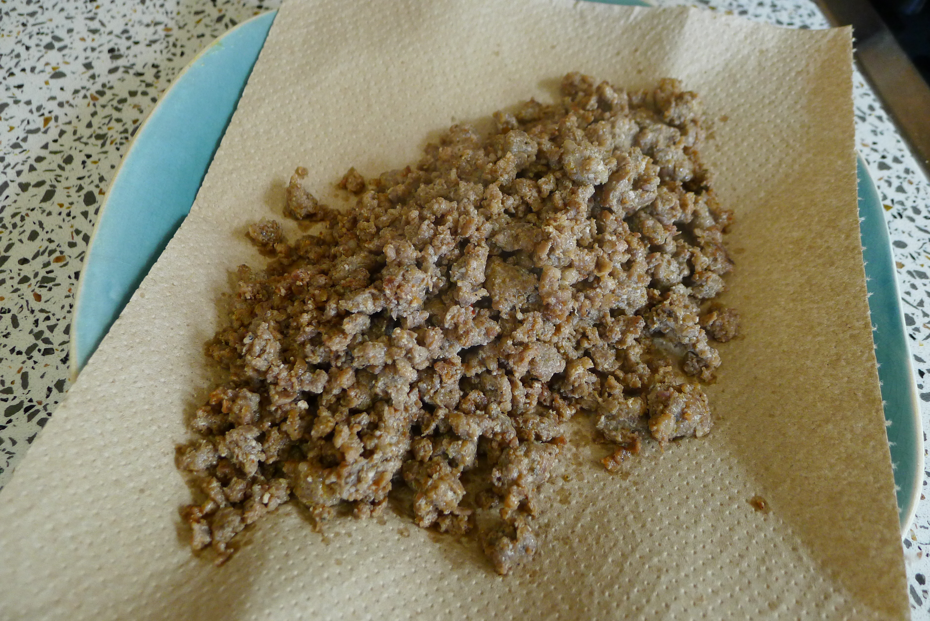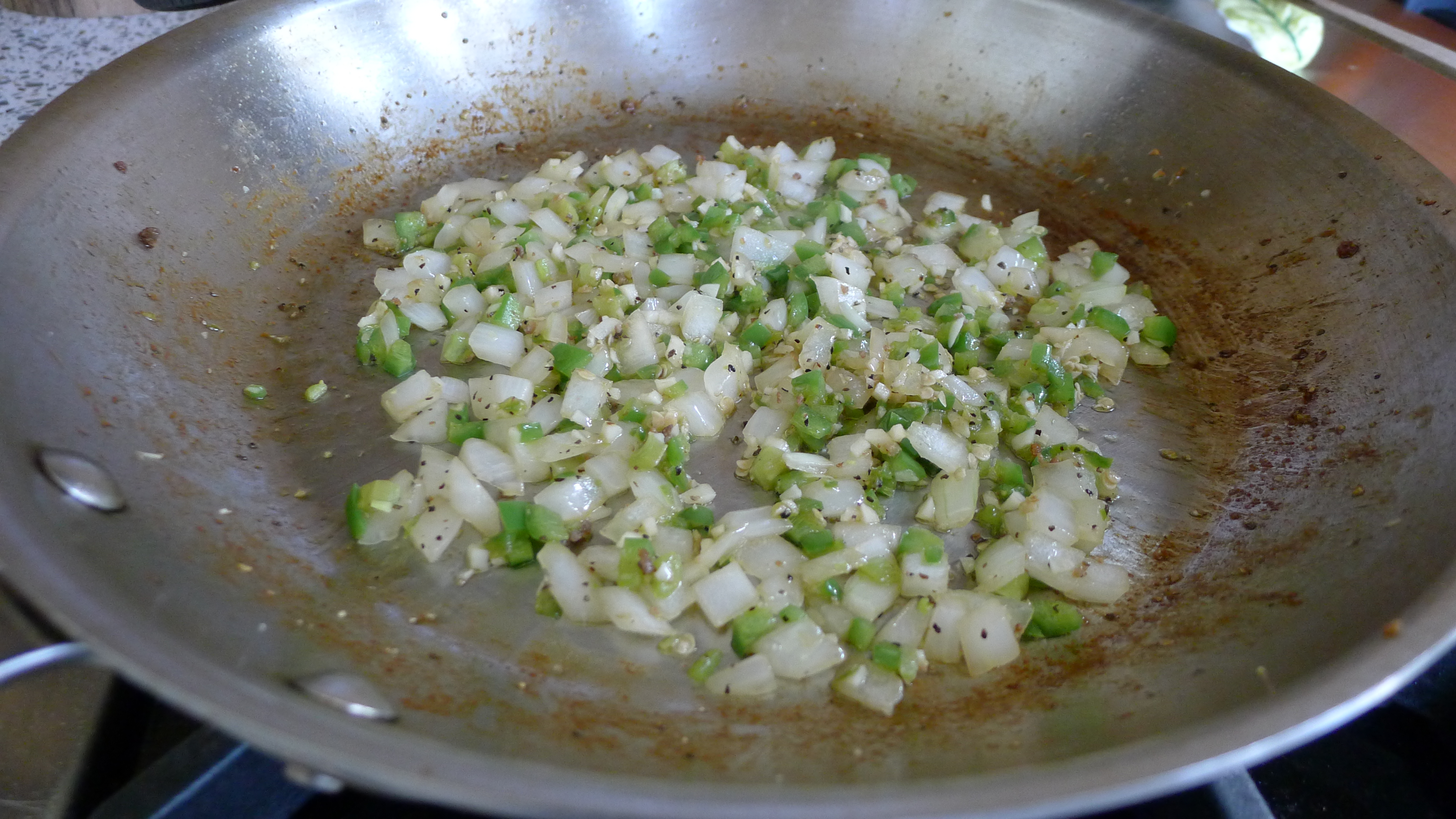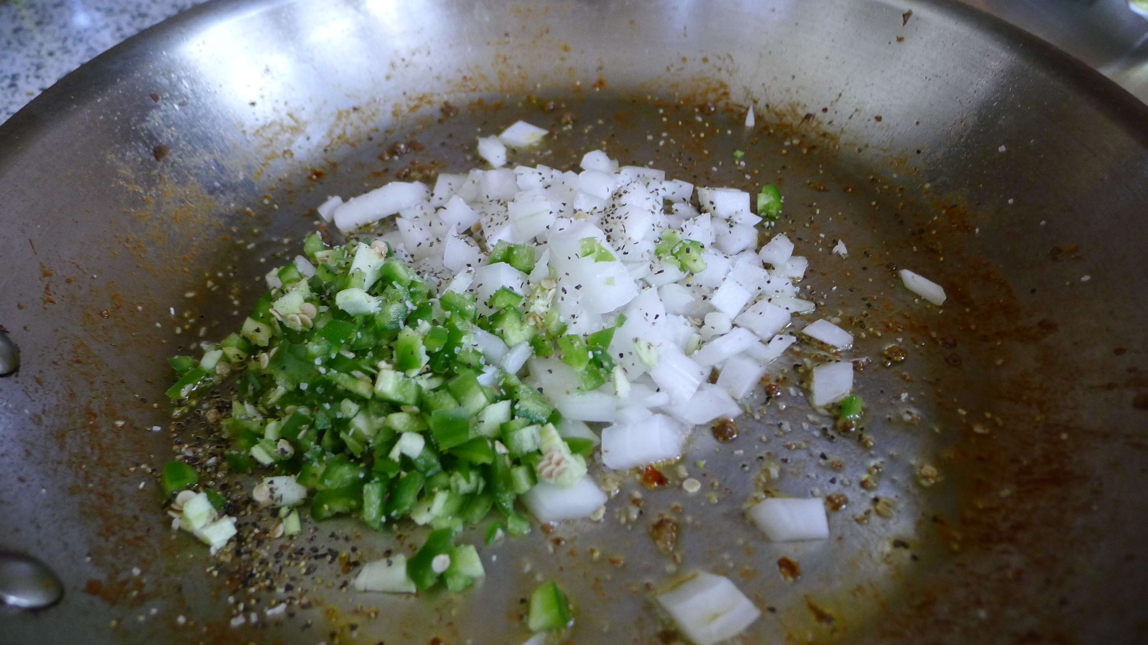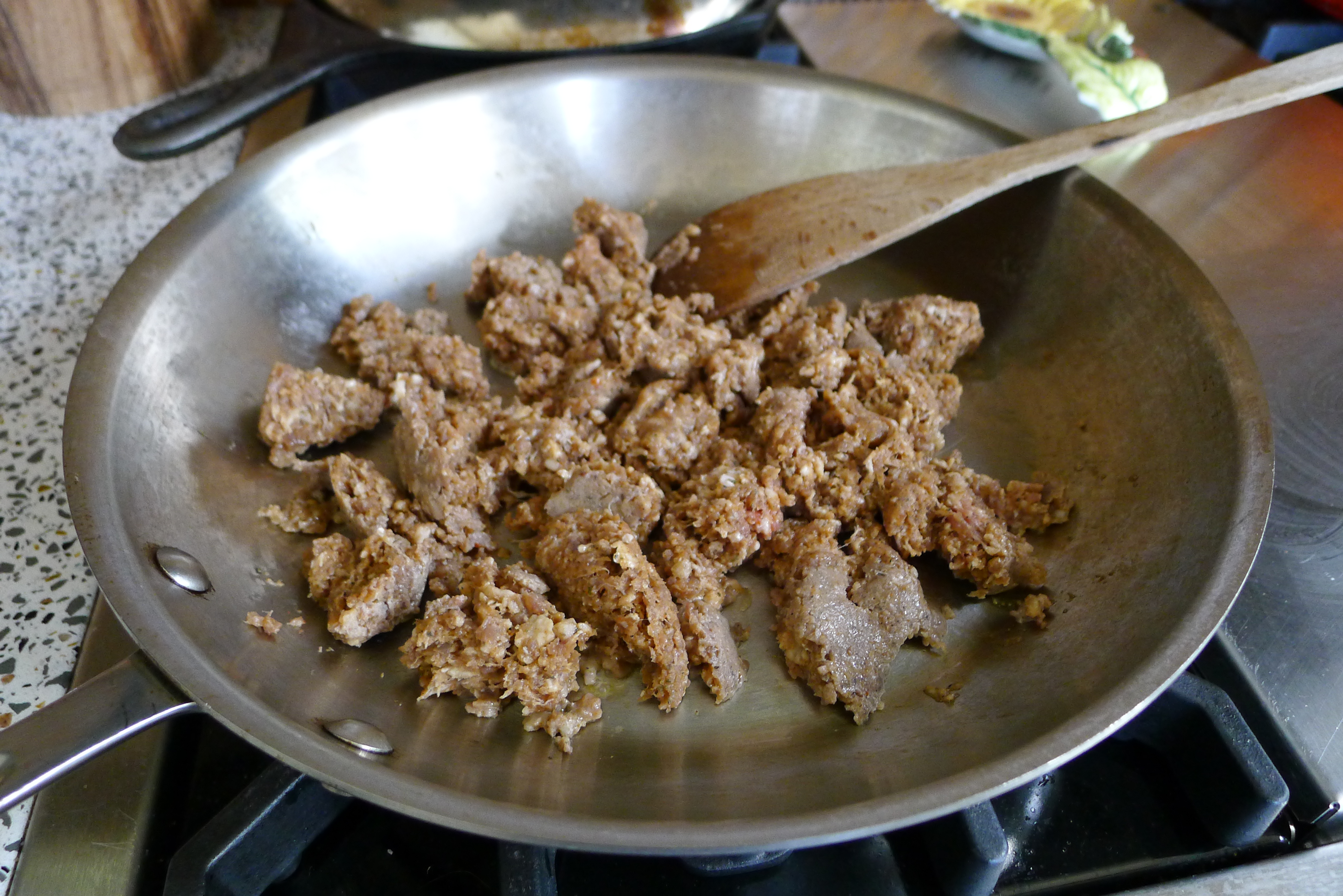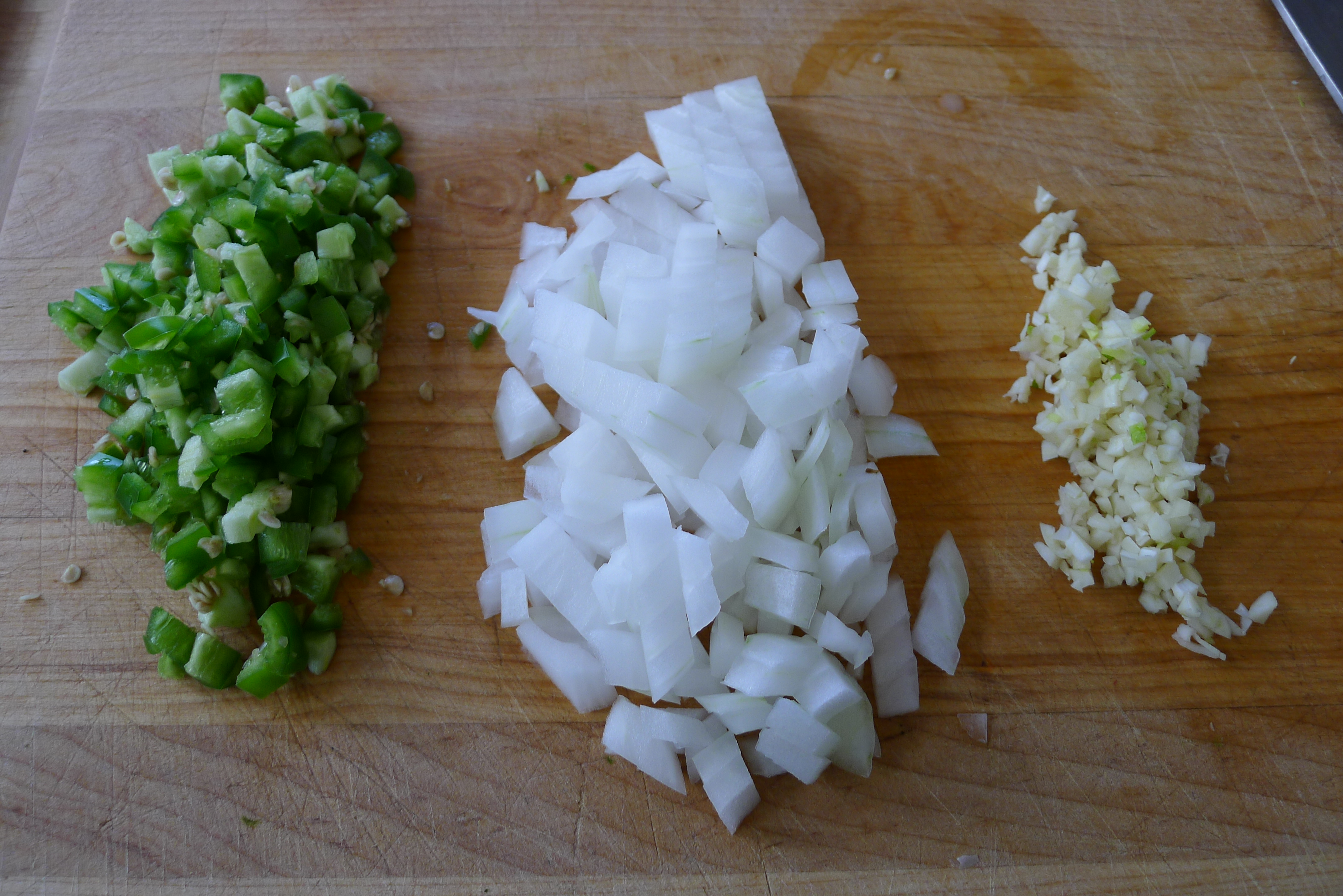 I started by browning a big batch of spicy breakfast sausage and letting it drain on a paper towel. While the sausage did its thing, I chopped up some veggies: onion, garlic, jalapeno.