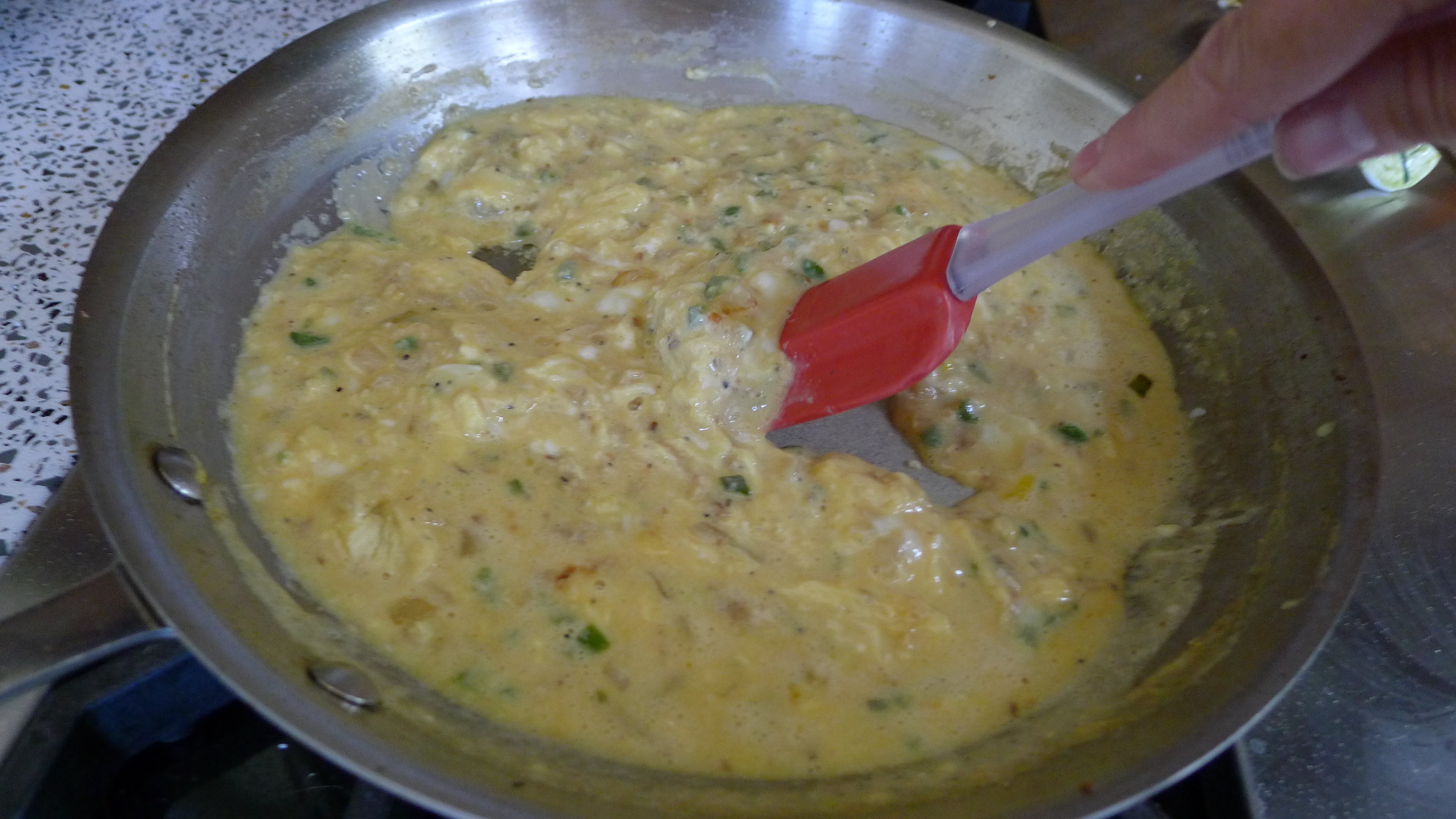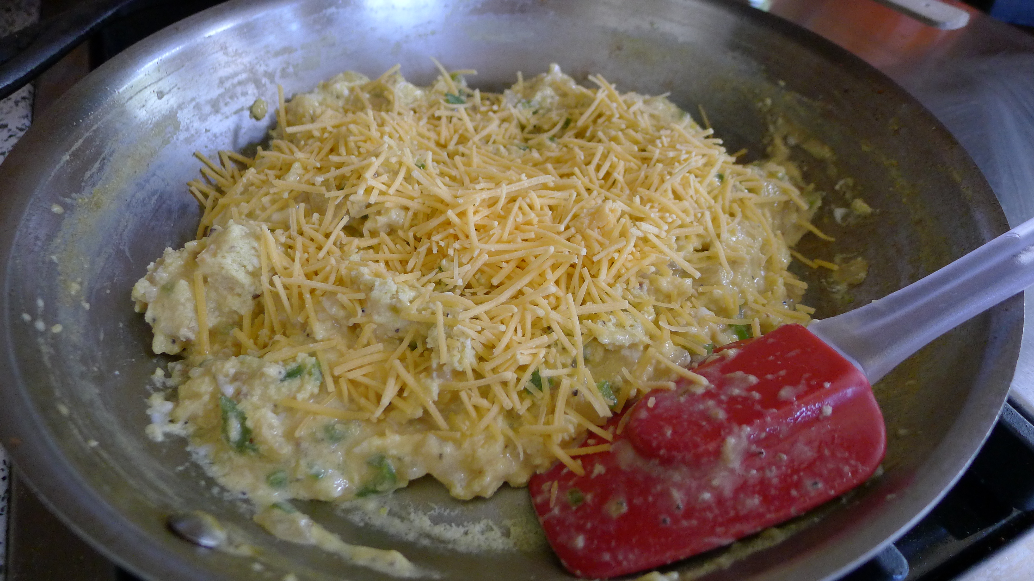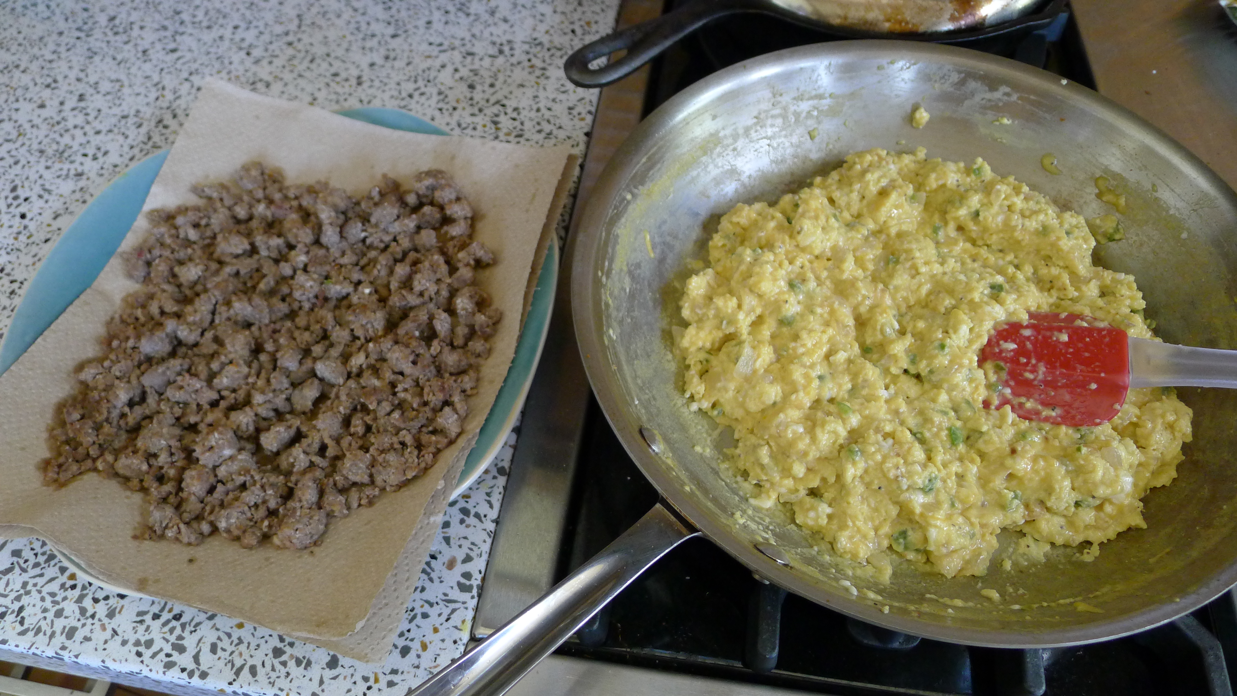 At home, brown the sausage and remove from the pan, draining on a plate lined with paper towels. Give the pan a swirl of olive oil and add the onion and jalapeno. After a minute or two, add the garlic and seasonings to taste. In the meantime, whisk the eggs with the milk and add salt, pepper, and crushed red pepper. Add the egg mixture to the pan with the veggies and scramble until almost cooked. Add a generous handful of shredded cheese and stir to combine. Remove from heat.