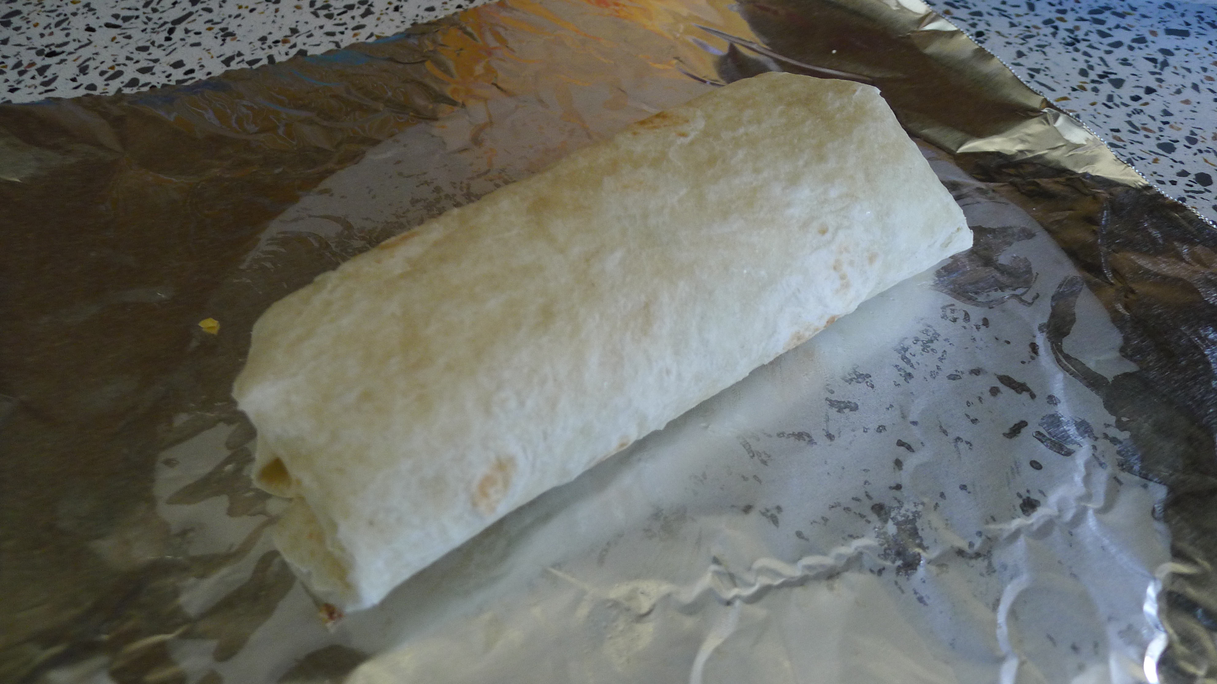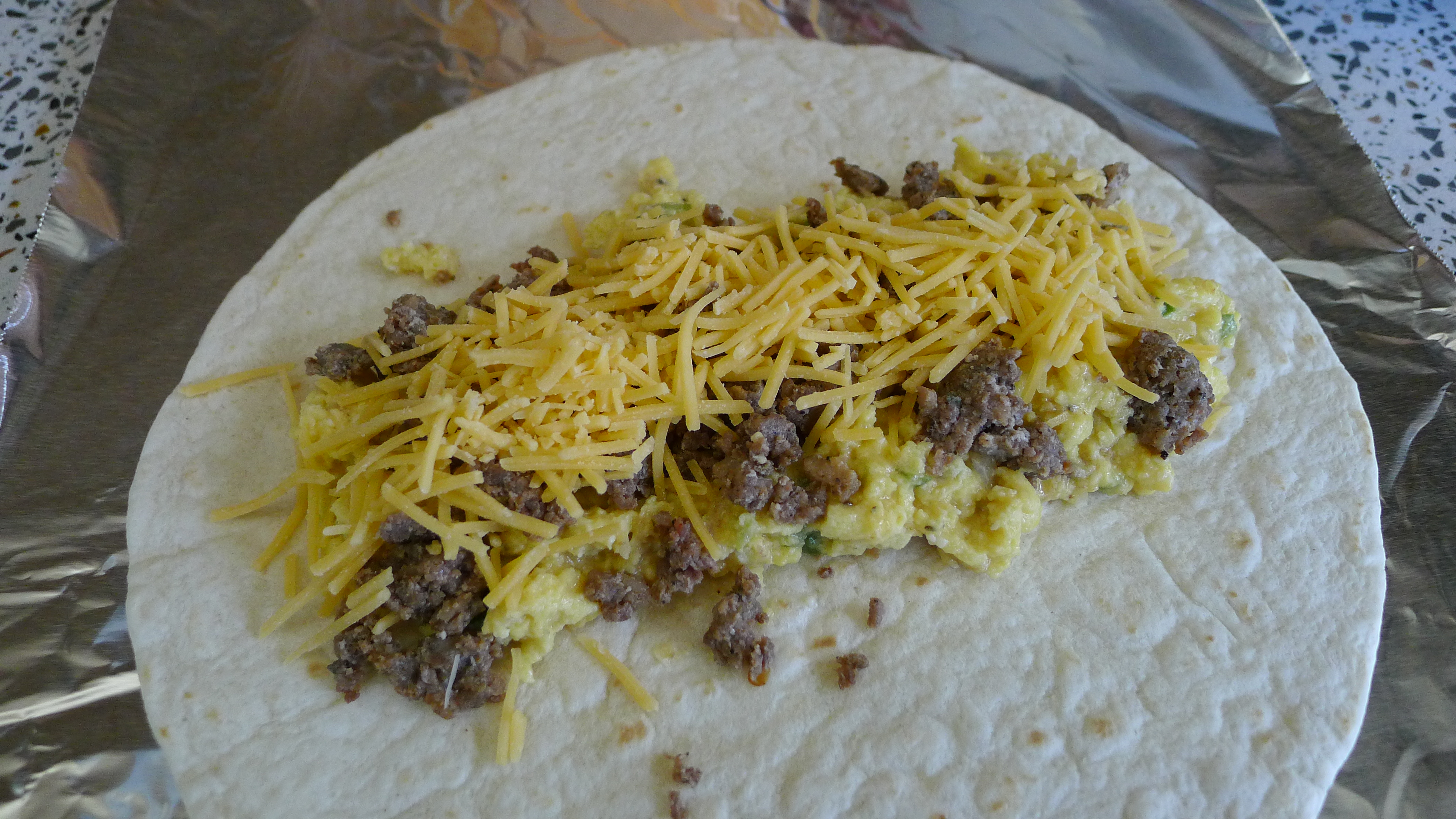 To assemble the burritos, warm them in a microwave for 10 seconds or so. Scoop some of the egg mixture onto the tortilla. Add some of the sausage and more cheese. Wrap the burrito tightly and then wrap it in aluminum foil. Continue for all five tortillas. Pop the burritos into the freezer.