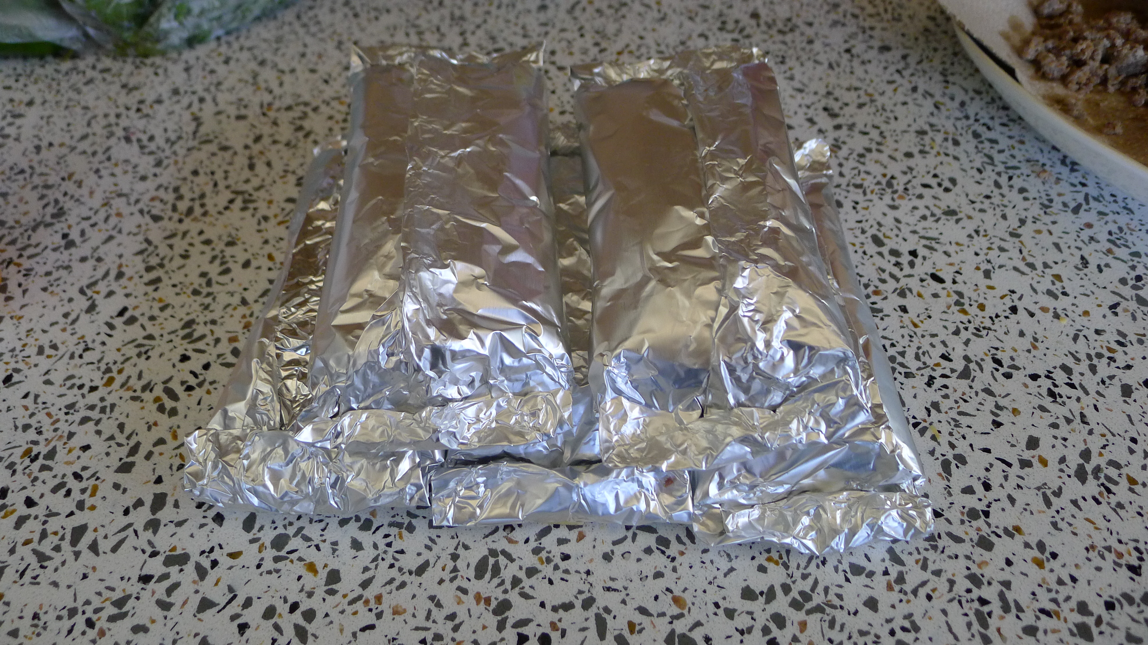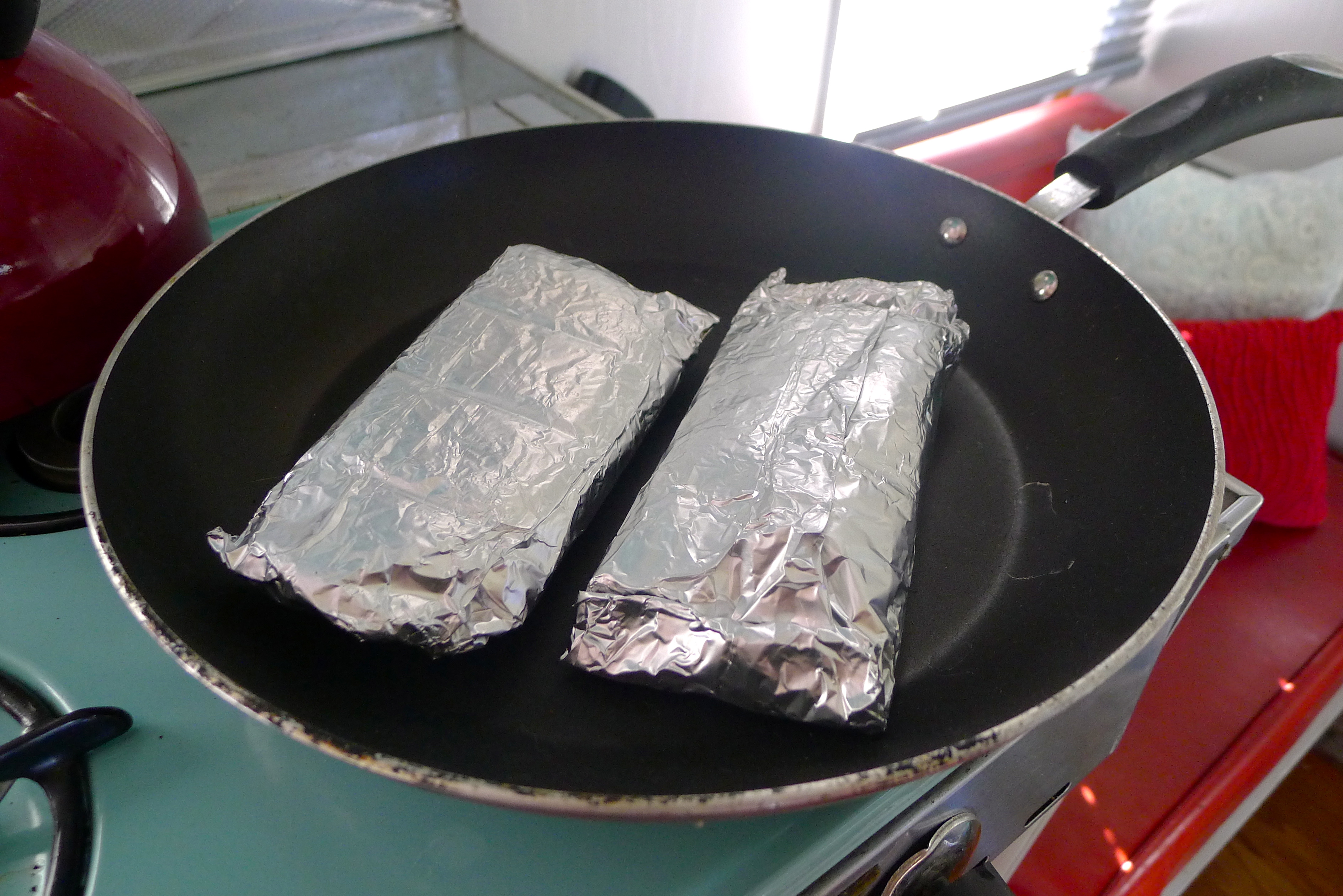 We took the burritos from the freezer and packed them in the cooler we use for food. By the time we were ready to eat them, they’d thawed. That morning, I left them in the foil and turned them in a hot pan on the stove for a while. Then I took off the foil and cooked them a bit longer, so that the tortilla got a little browned and the cheese inside was sure to be melted. I think it would be easy to throw the burrito packets right onto a grill, too.