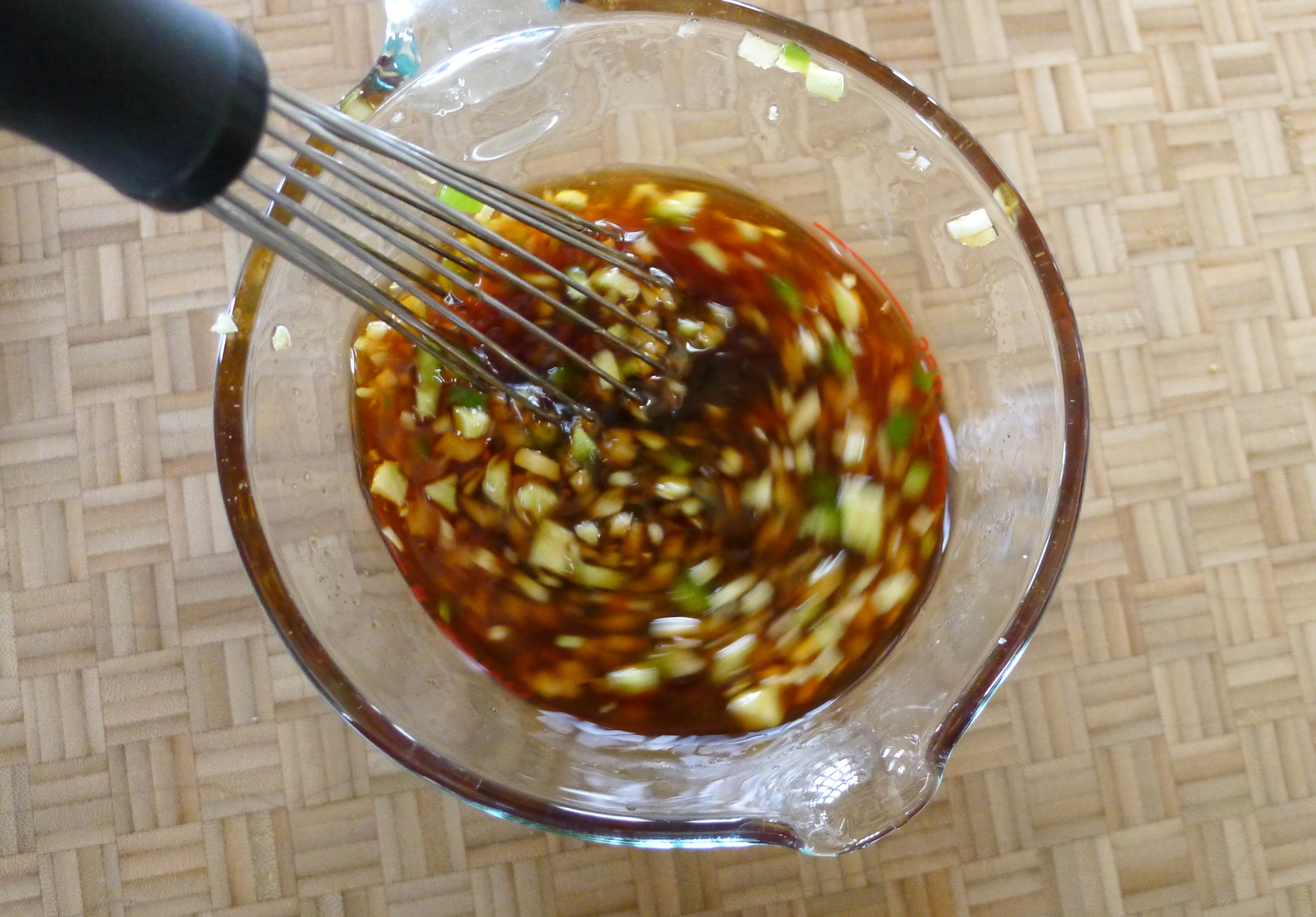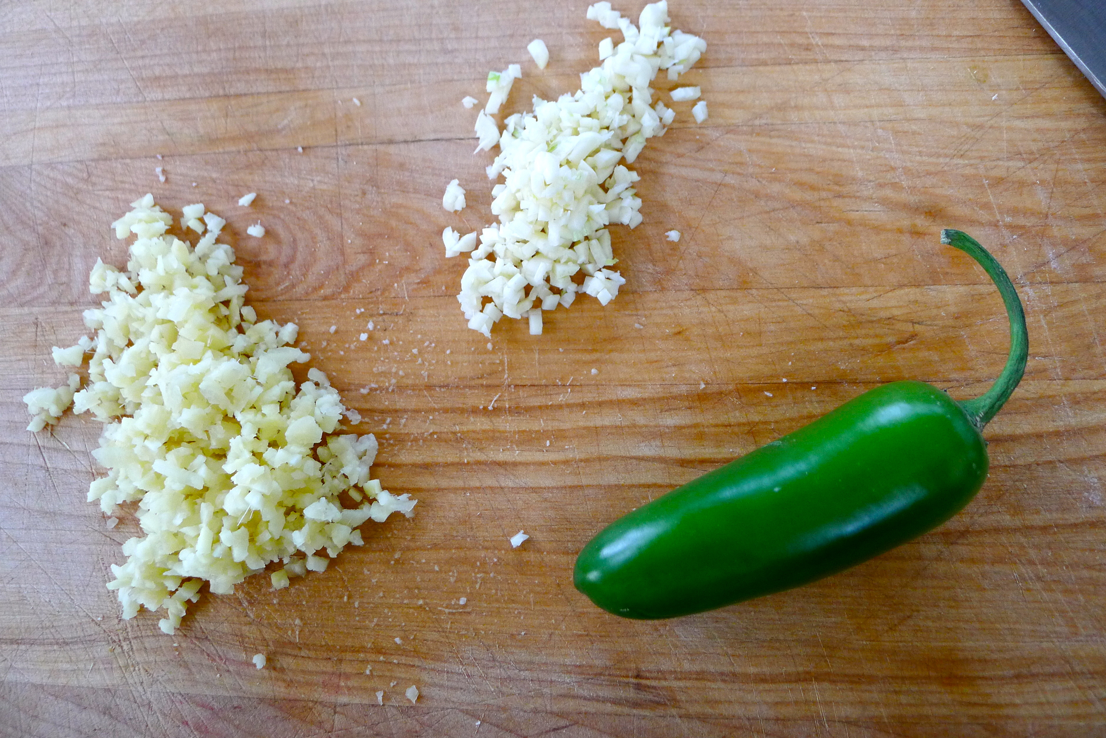 While the tofu was baking, I made a sauce using garlic, ginger, jalapeno, maple syrup, soy sauce, and white wine. I added Sriracha for more heat and whisked away. I love the sweet-savory-spicy combo!