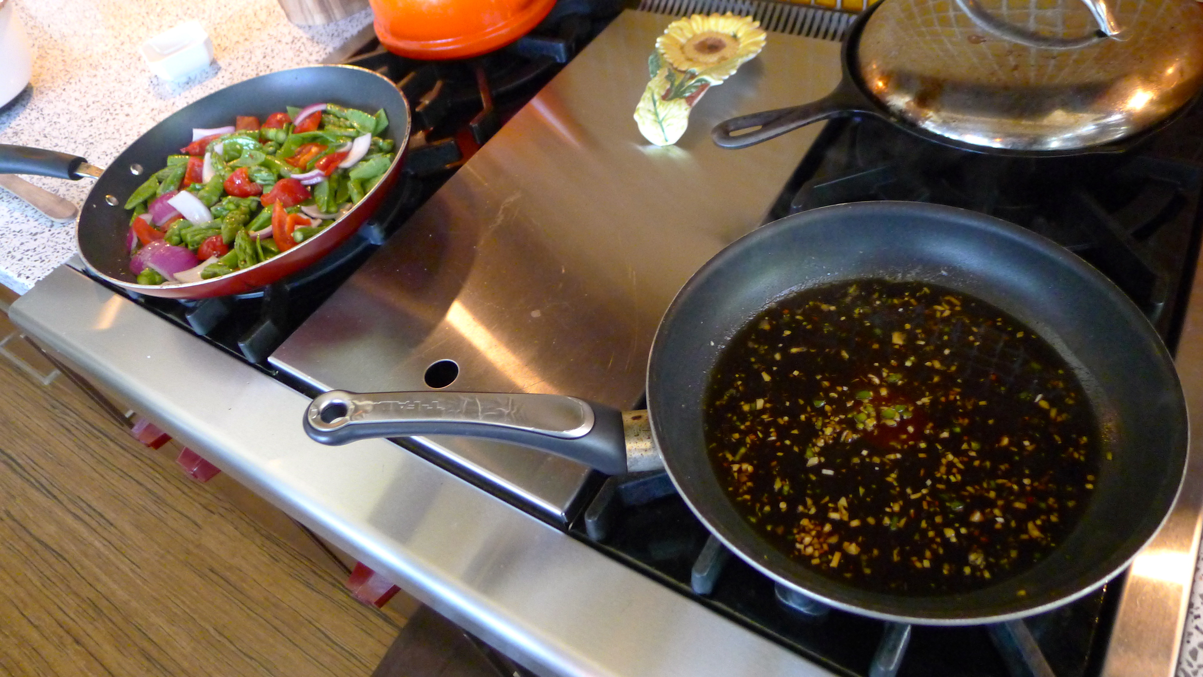 I poured some of the sauce over the tofu to coat it and bake into deliciousness. The sheet pan was a little too large for the amount of tofu I had, so I transferred it to a baking dish and back into the oven it went. To serve with the tofu, I chopped up some veggies to stir-fry: asparagus, snap peas, red pepper, and onion. I also heated the remaining sauce on the stove to reduce a little bit for serving.
